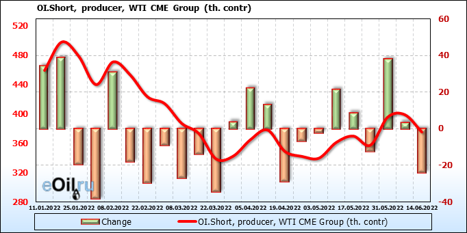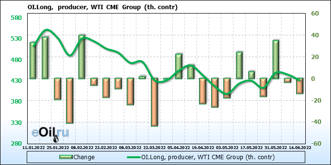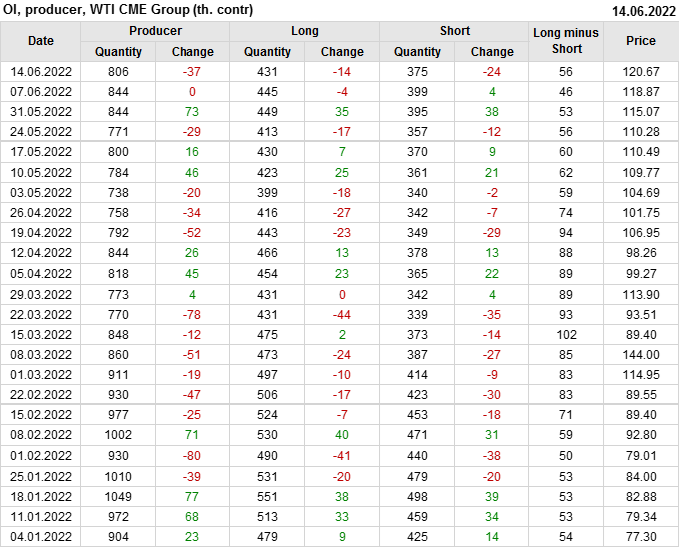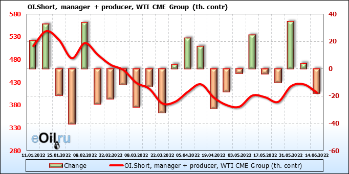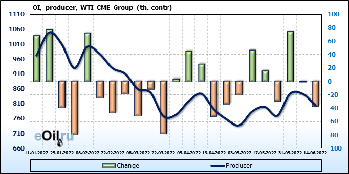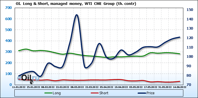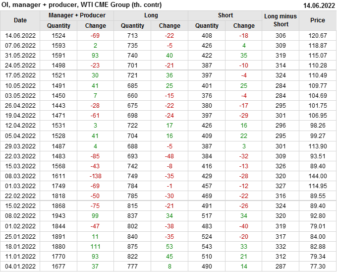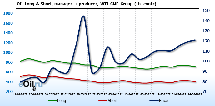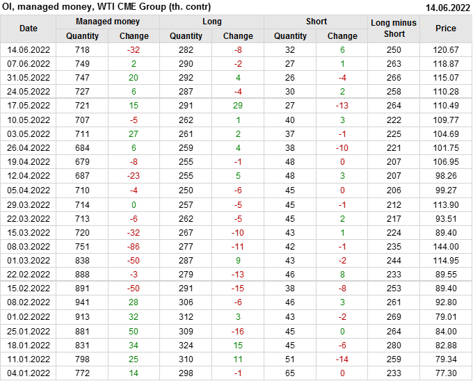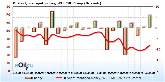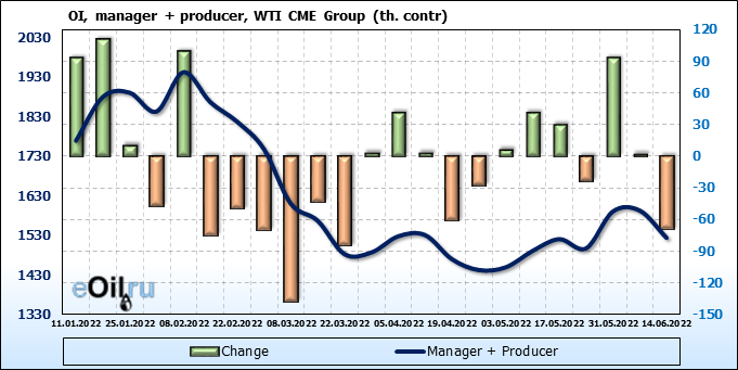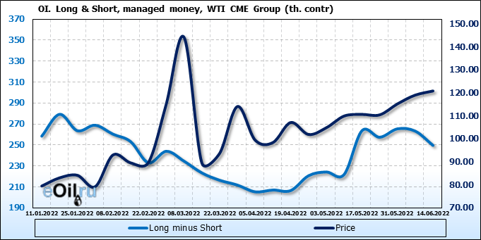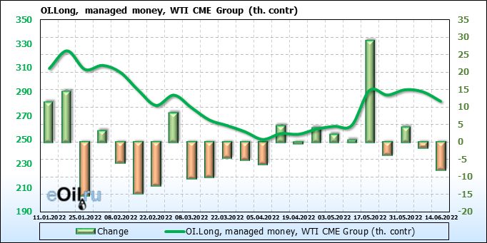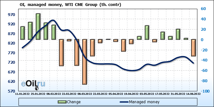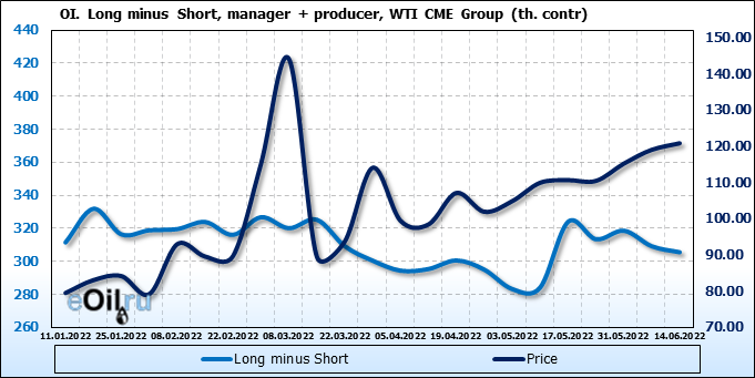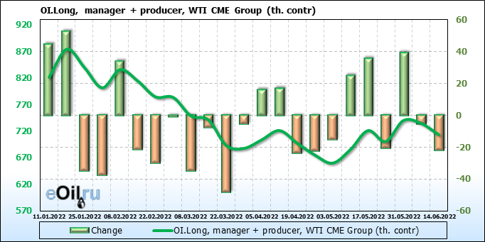 За прошлую неделю, 08.06.22 — 14.06.22, разница между длинными и короткими позициями управляющих сократилась на 13.6 тыс. контрактов. В тоже время, цена выросла на 1.8 доллара.