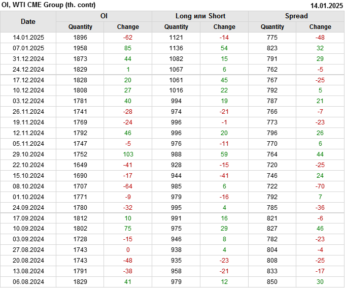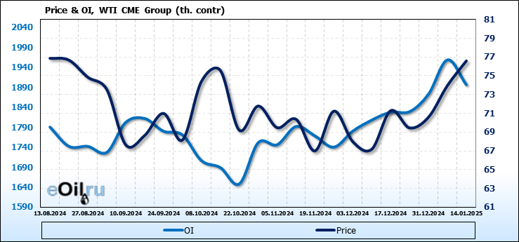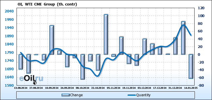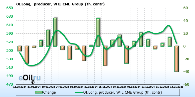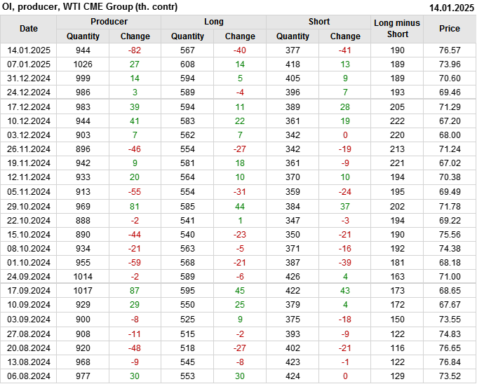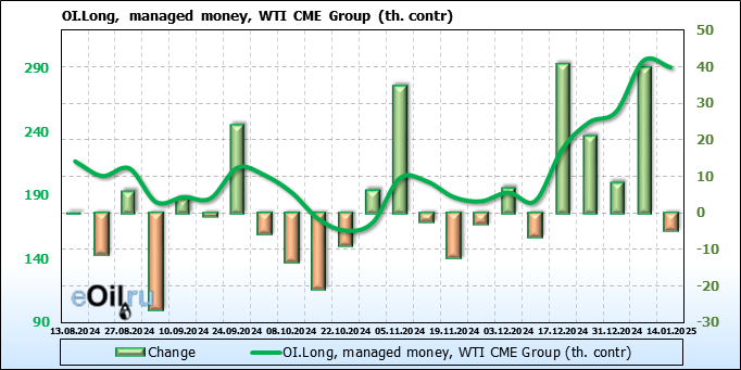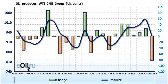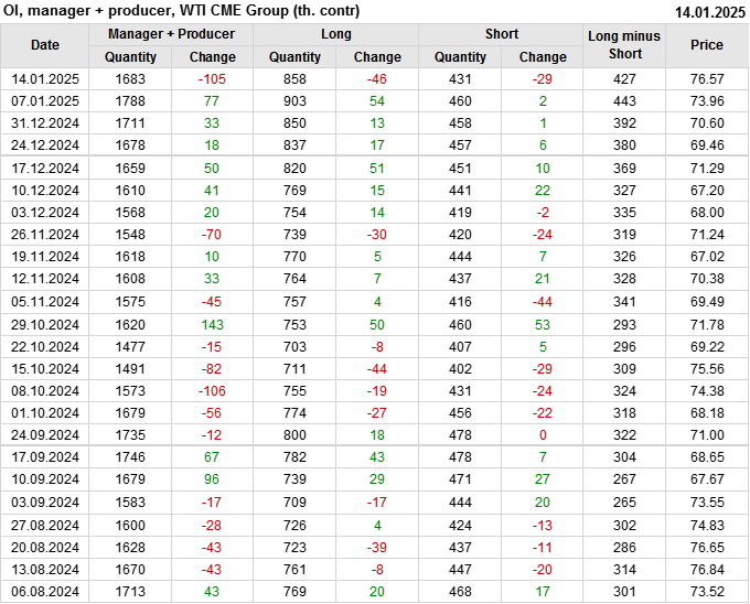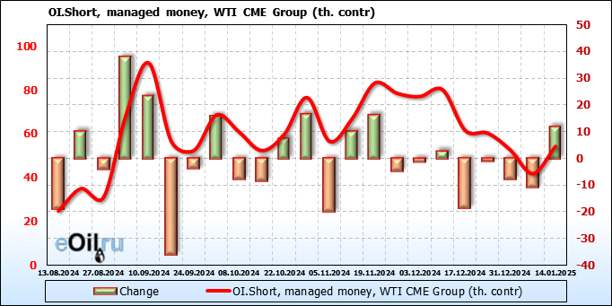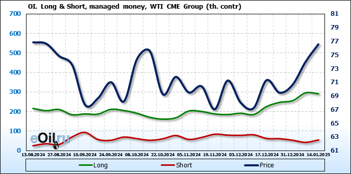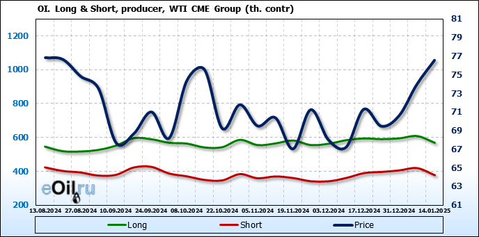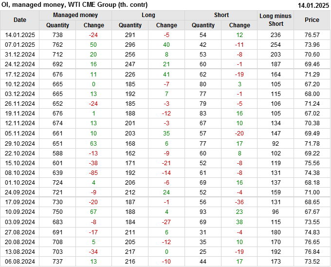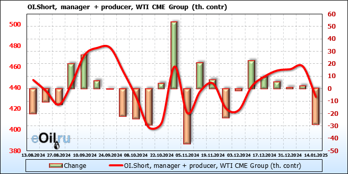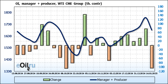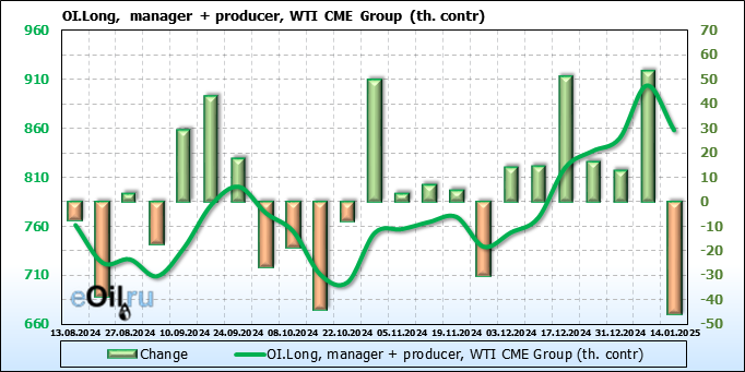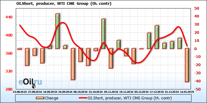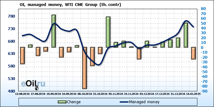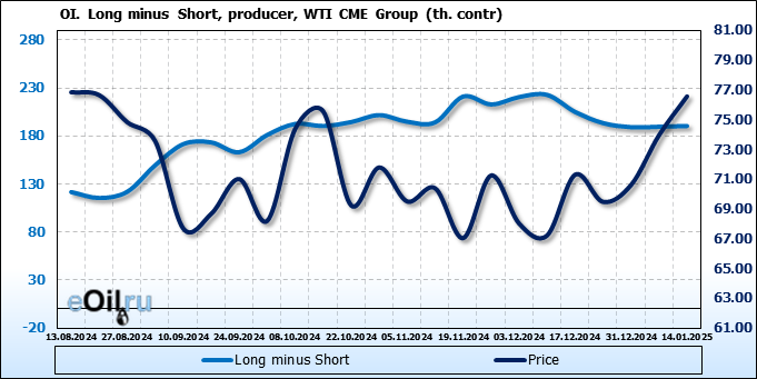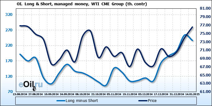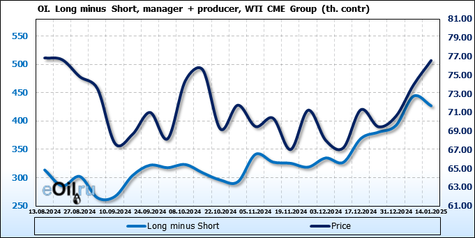 За прошлую неделю, 08.01.25 — 14.01.25, разница между длинными и короткими позициями управляющих сократилась на 17.6 тыс. контрактов. В тоже время, цена выросла на 2.61 доллара.