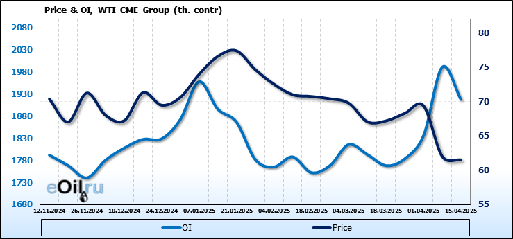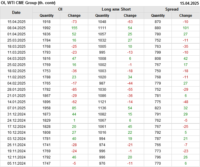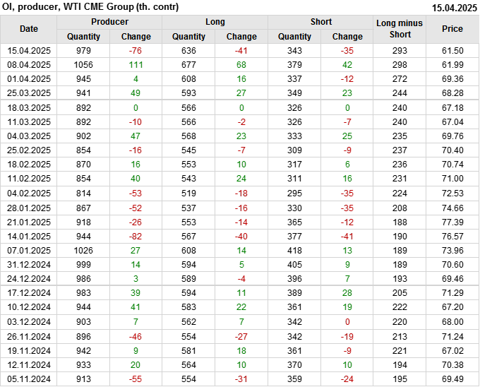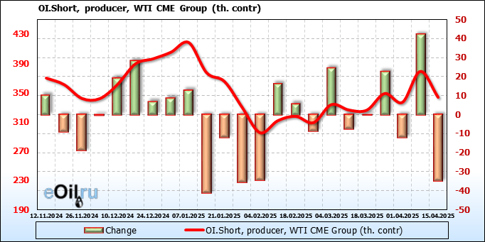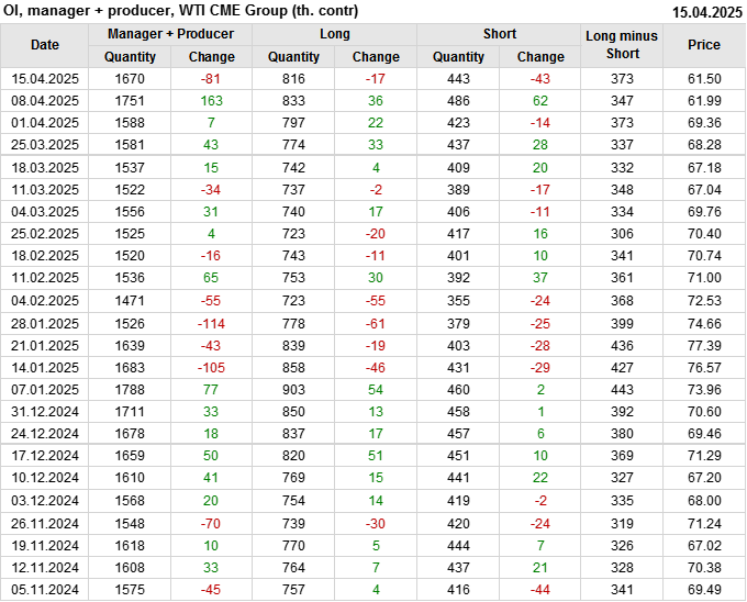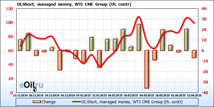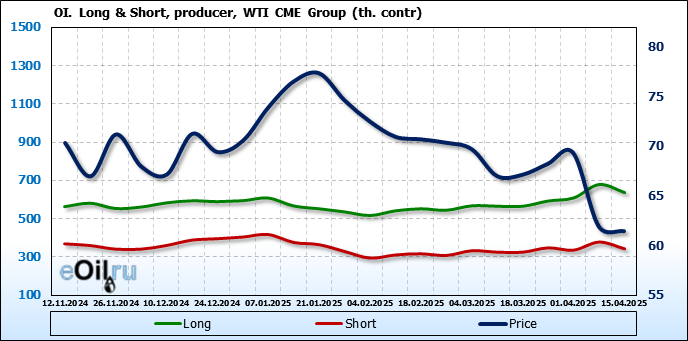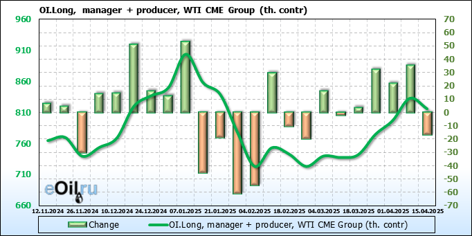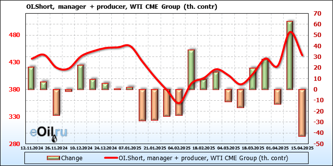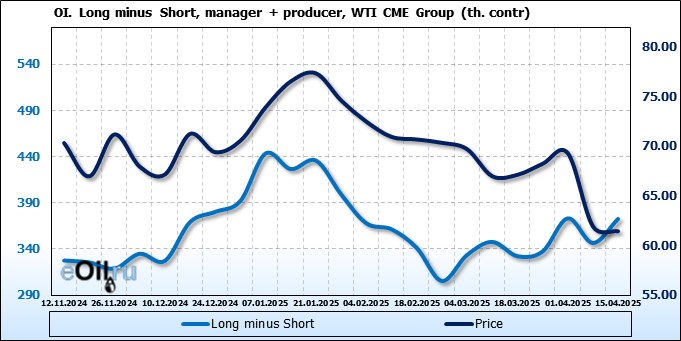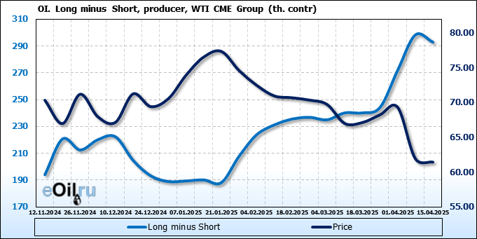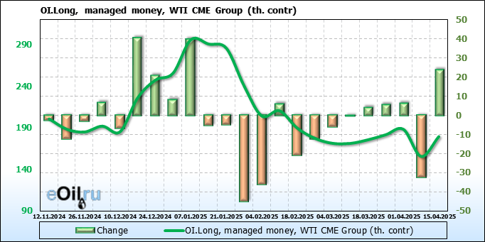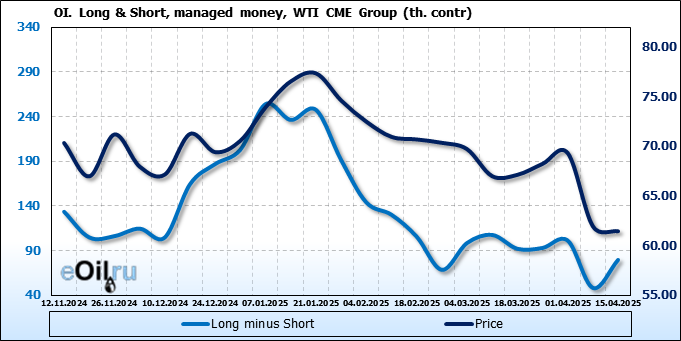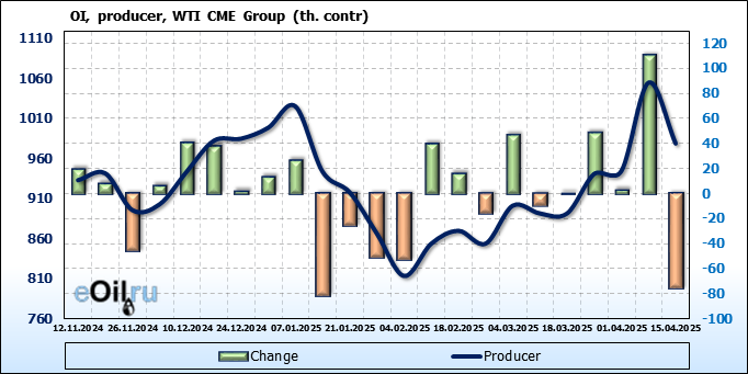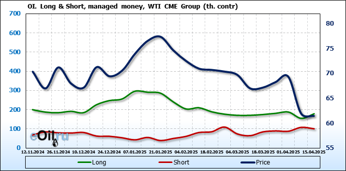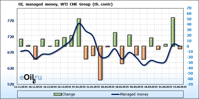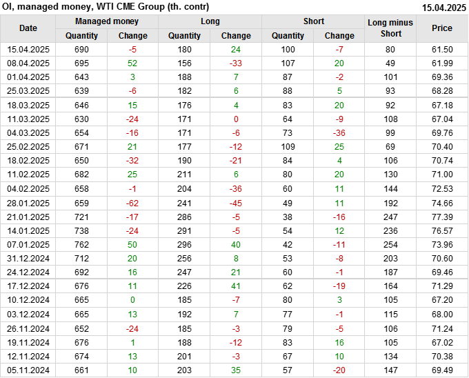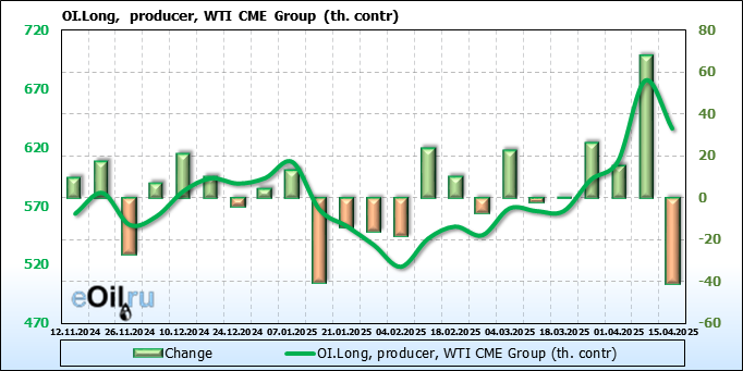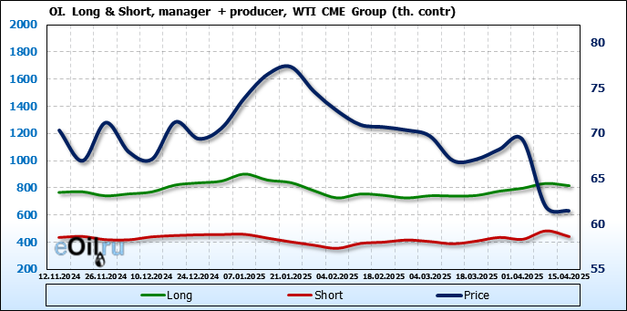 За прошлую неделю, 09.04.25 — 15.04.25, разница между длинными и короткими позициями управляющих увеличилась на 31.4 тыс. контрактов. В тоже время, цена упала на 0.49 доллара.