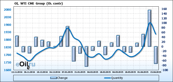 За прошлую неделю, 09.04.25 — 15.04.25, открытый интерес упал на 73 тыс. контрактов. Объем вовлеченных в торговлю контрактов составляет 1 918 217 штук. Текущее положение дел на рынке таково, что деньги в течение прошлой недели уходили с рынка не видя привлекательности в текущей ситуации.