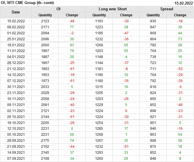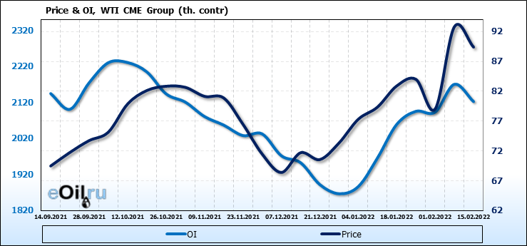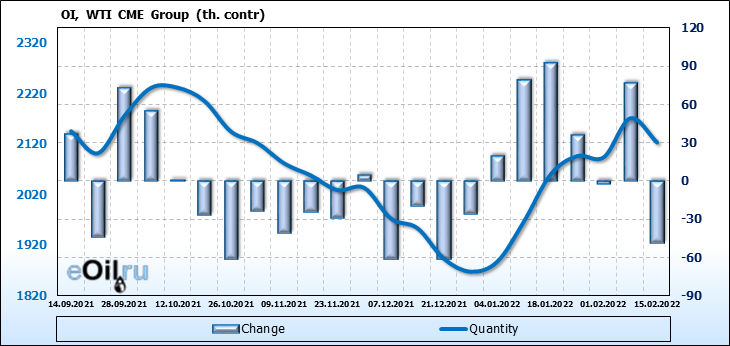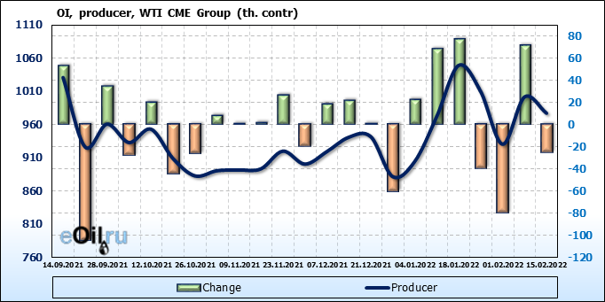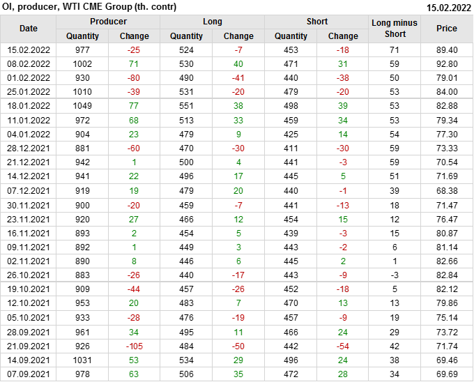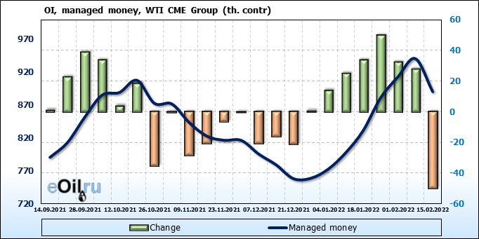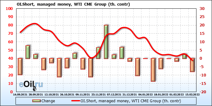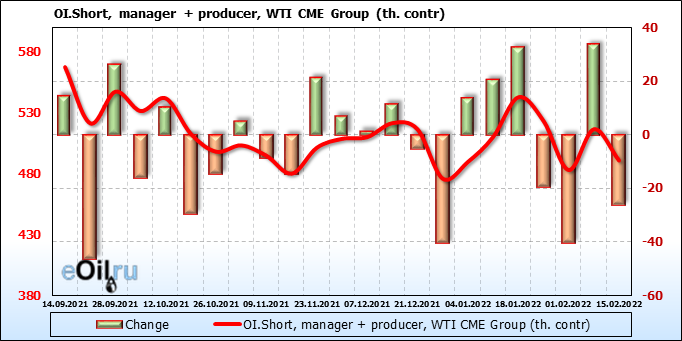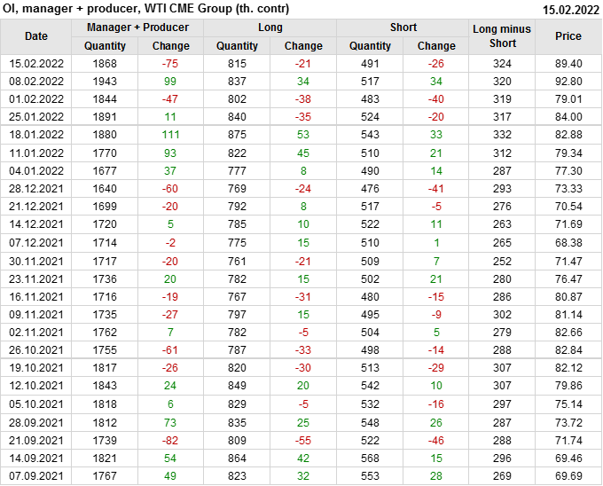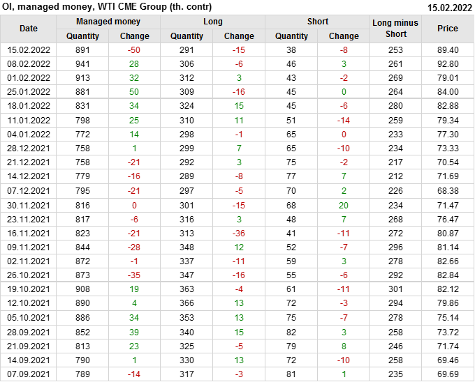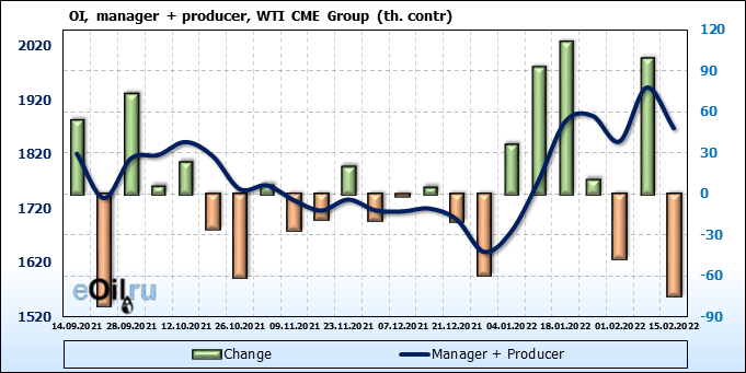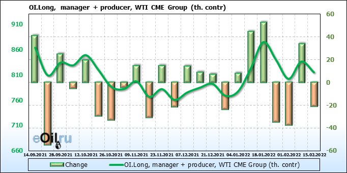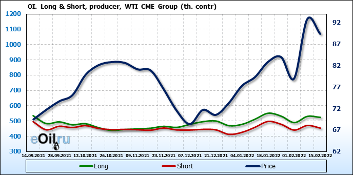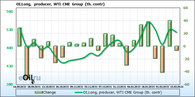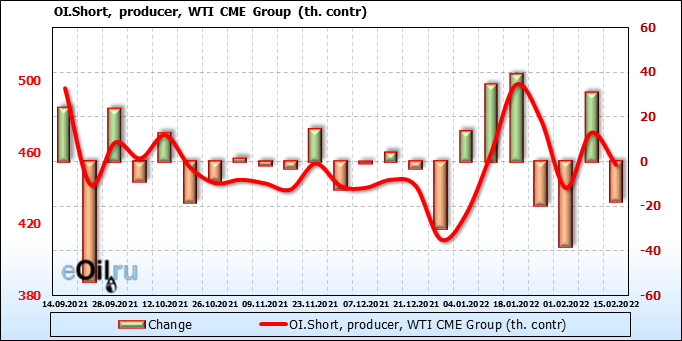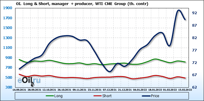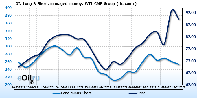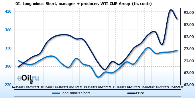 За прошлую неделю, 09.02.22 — 15.02.22, разница между длинными и короткими позициями управляющих сократилась на 7.2 тыс. контрактов. В тоже время, цена упала на 3.4 доллара.