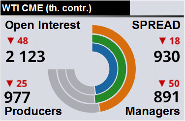 За прошлую неделю разница между OI производителей и OI управляющих сократилась на 21 391 контракт. Разница между длинными позициями производителей и управляющих сократилась на 59 545 контрактов. Разница между короткими позициями производителей и управляющих выросла на 3 633 контракта.