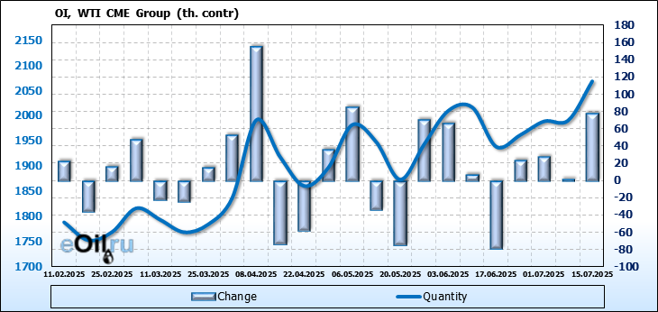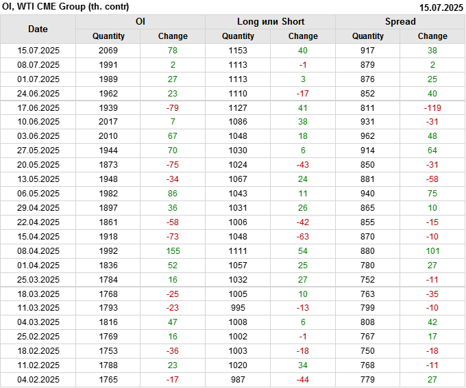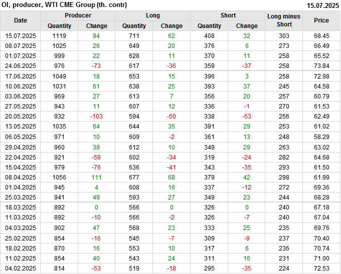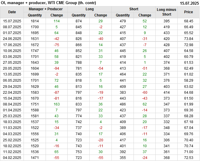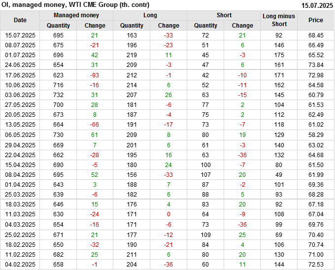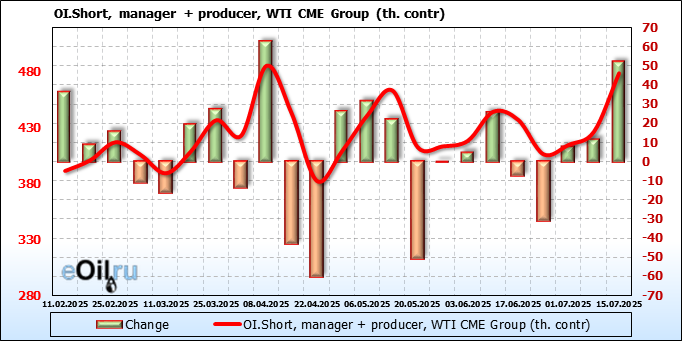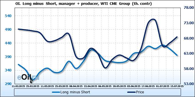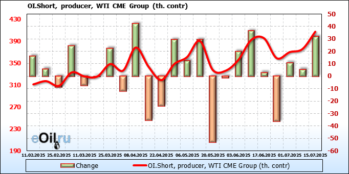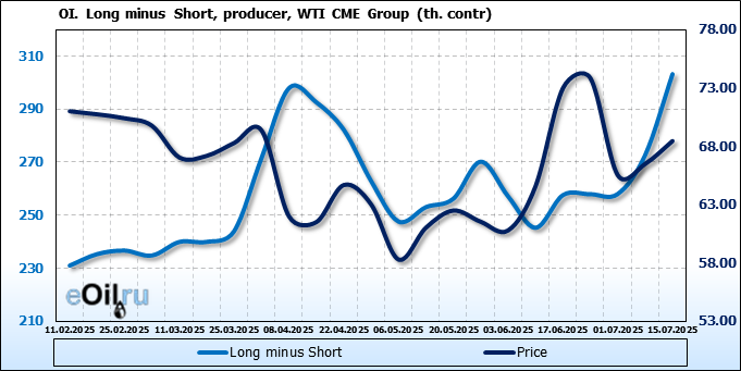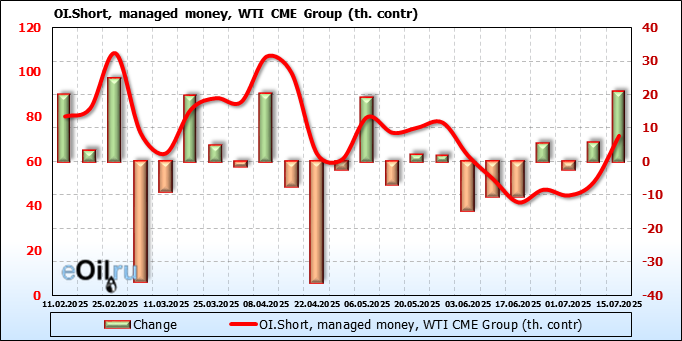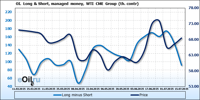 За прошлую неделю, 09.07.25 — 15.07.25, разница между длинными и короткими позициями управляющих сократилась на 53.9 тыс. контрактов. В тоже время, цена выросла на 1.96 доллара.