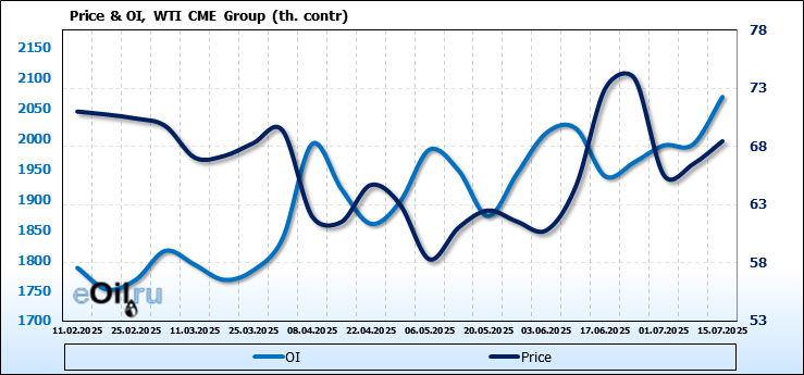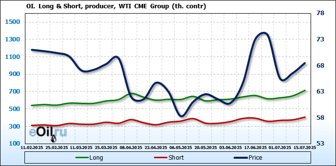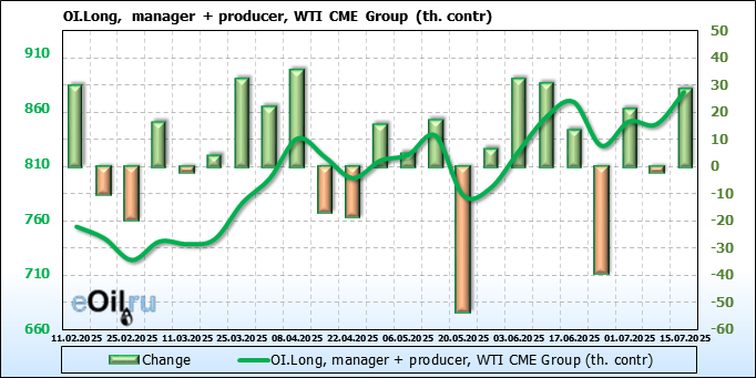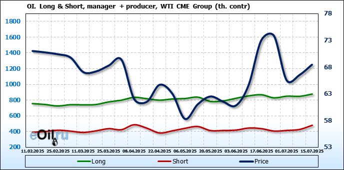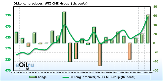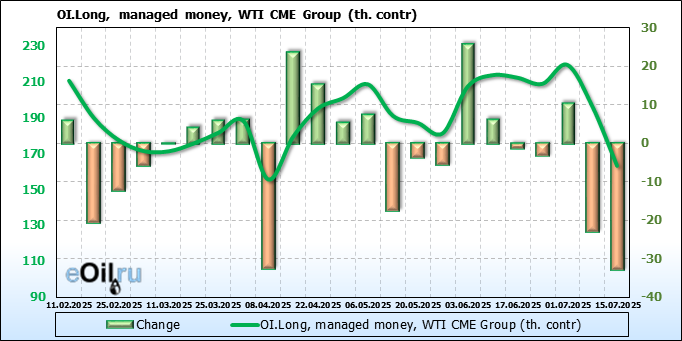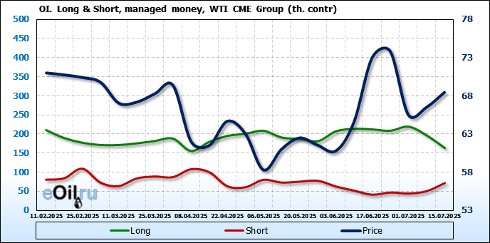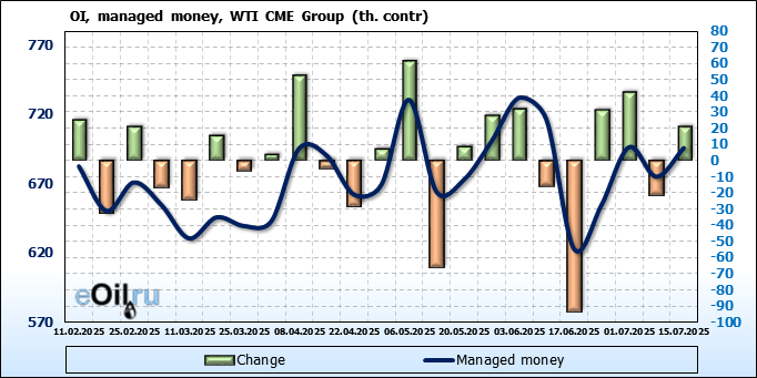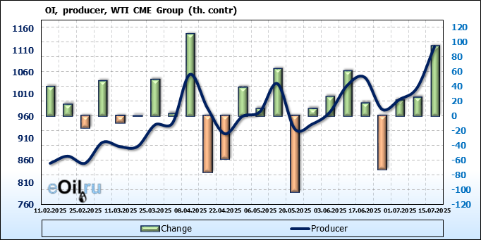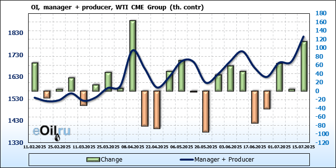 За прошлую неделю, 09.07.25 — 15.07.25, разница между длинными и короткими позициями управляющих сократилась на 53.9 тыс. контрактов. В тоже время, цена выросла на 1.96 доллара.