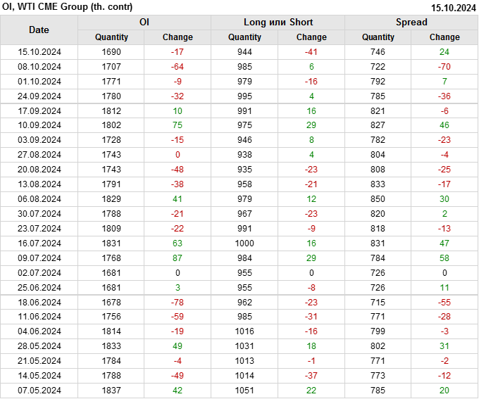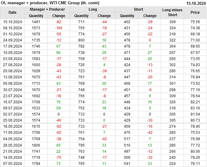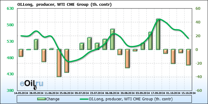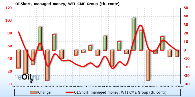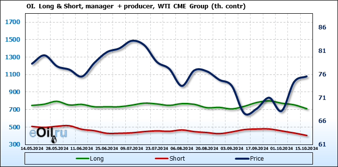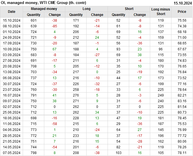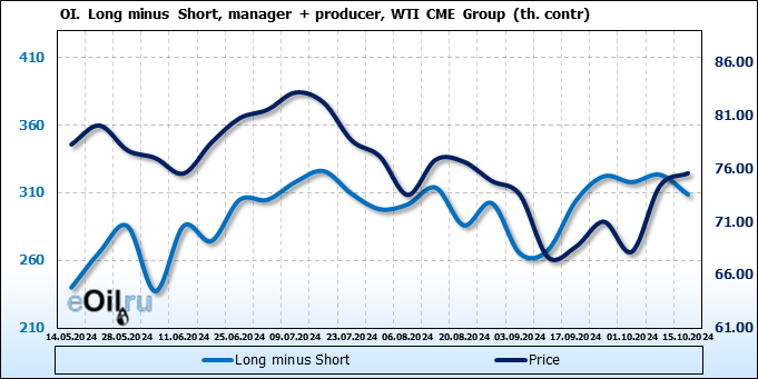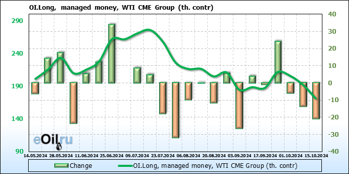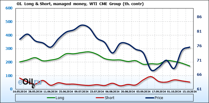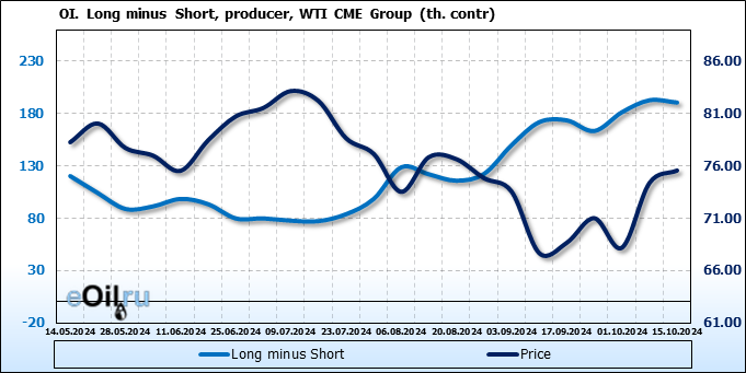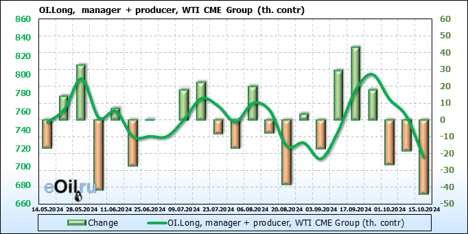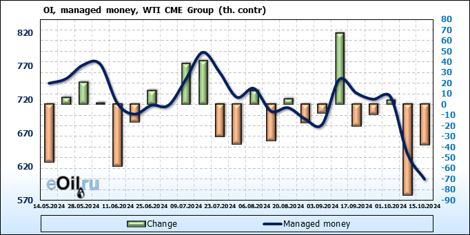 За прошлую неделю, 09.10.24 — 15.10.24, разница между длинными и короткими позициями управляющих сократилась на 12.5 тыс. контрактов. В тоже время, цена выросла на 1.18 доллара.