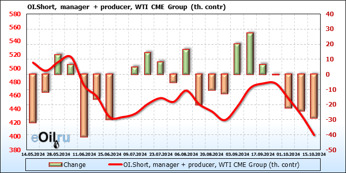 За прошлую неделю разница между OI производителей и OI управляющих сократилась на 44 053 контракта. Разница между длинными позициями производителей и управляющих сократилась на 4 858 контрактов. Разница между короткими позициями производителей и управляющих сократилась на 20 234 контракта.