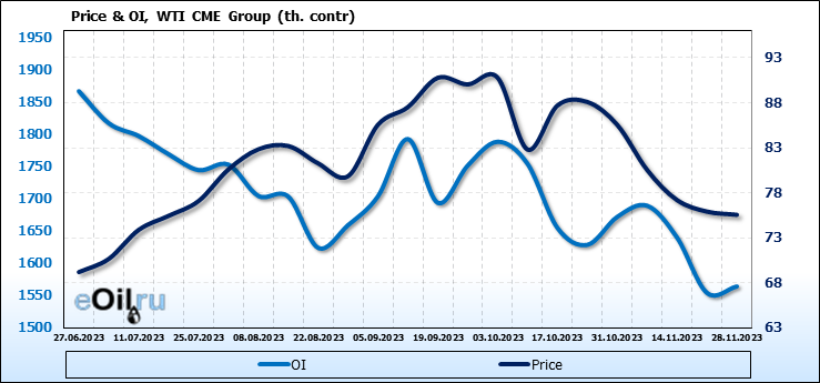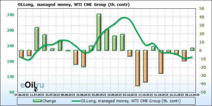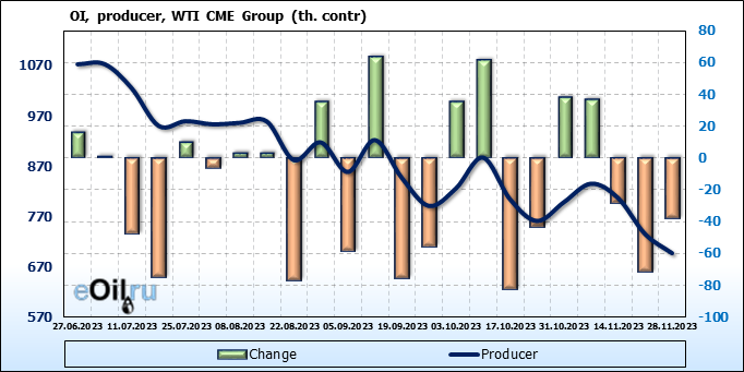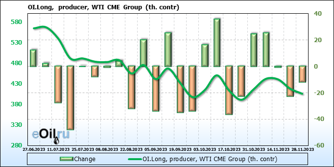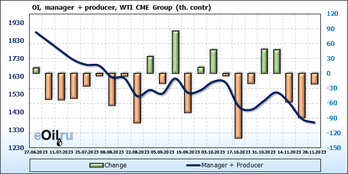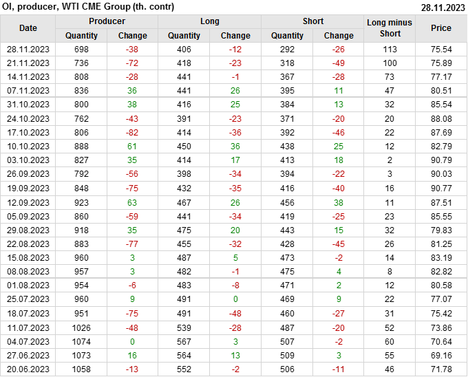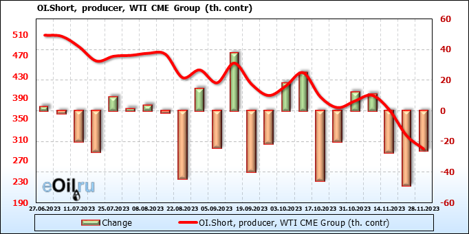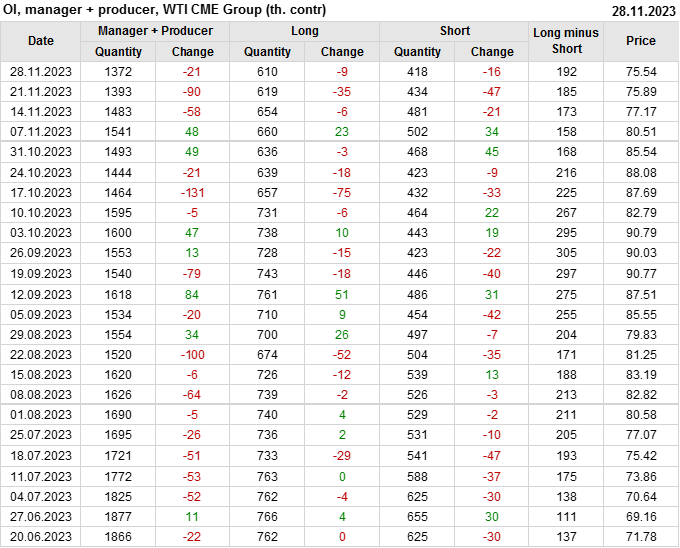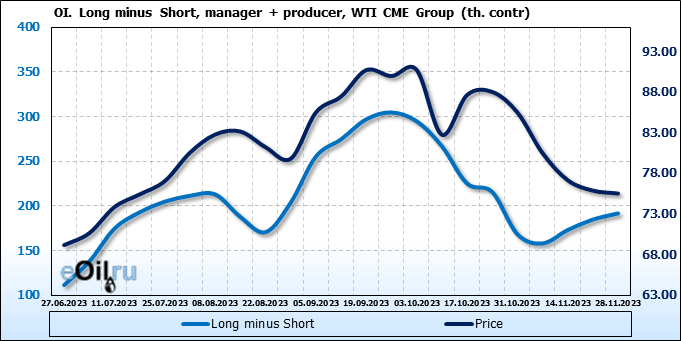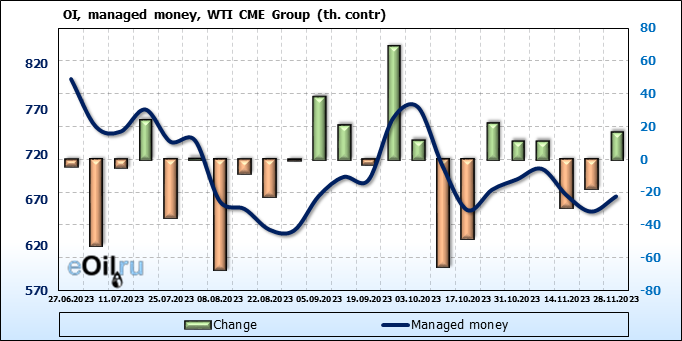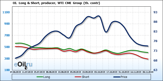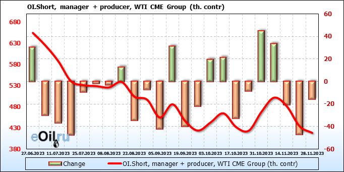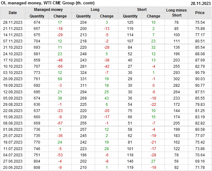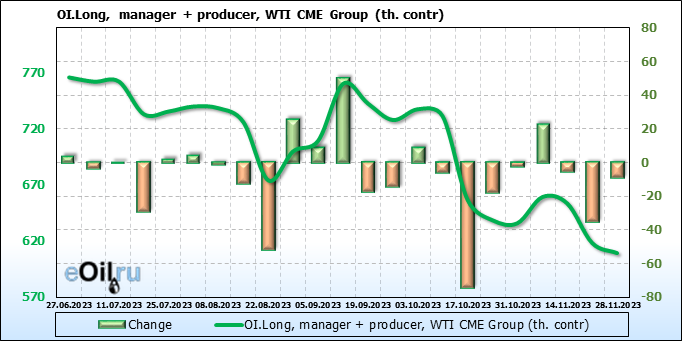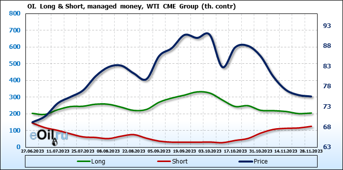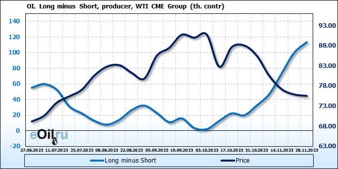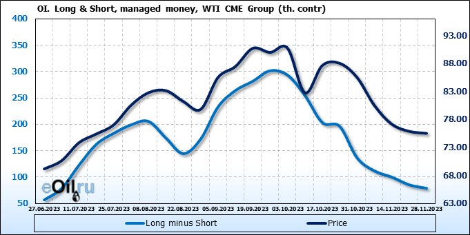 За прошлую неделю, 22.11.23 — 28.11.23, разница между длинными и короткими позициями управляющих сократилась на 6.6 тыс. контрактов. В тоже время, цена упала на 0.35 доллара.