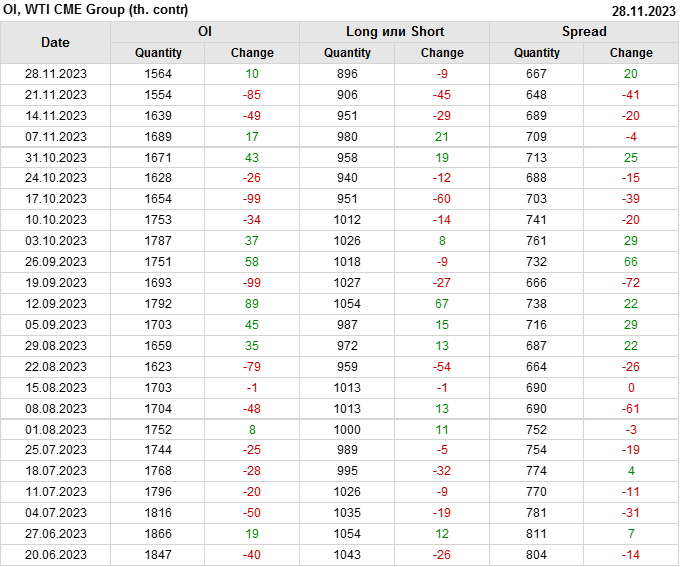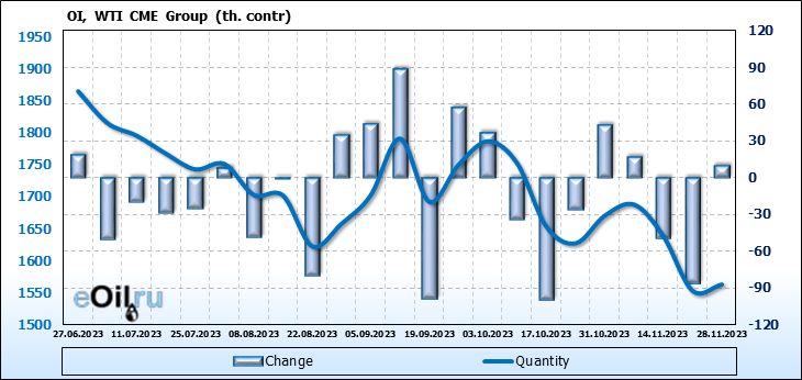 За прошлую неделю, 22.11.23 — 28.11.23, открытый интерес вырос на 10 тыс. контрактов. Объем вовлеченных в торговлю контрактов составляет 1 563 737 штук. Текущее положение дел на рынке таково, что деньги в течение прошлой недели приходили на рынок поддерживая тенденцию.