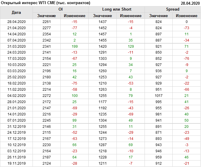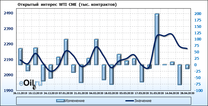 За прошлую неделю, 22.04.20 — 28.04.20, открытый интерес упал на 15 тыс. контрактов. Объем вовлеченных в торговлю контрактов составляет 2 261 202 штуки. Текущее положение дел на рынке таково, что деньги в течение прошлой недели уходили с рынка не видя привлекательности в текущей ситуации.