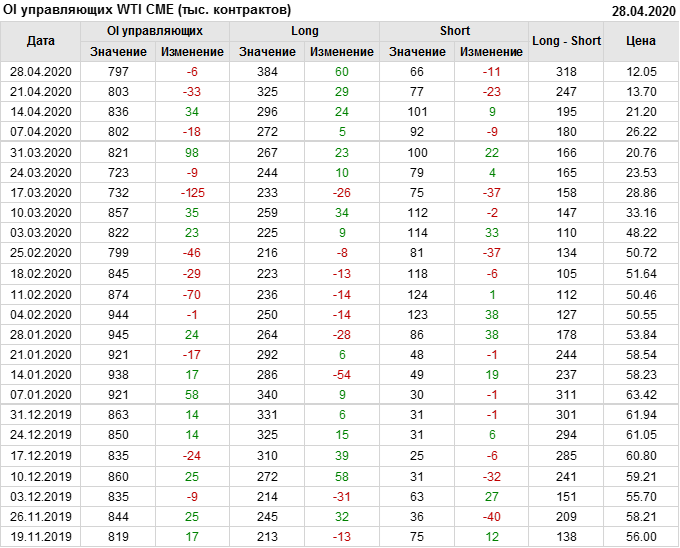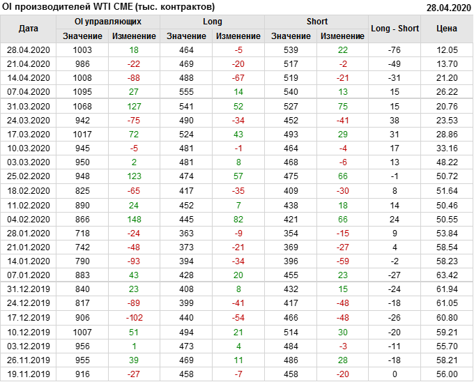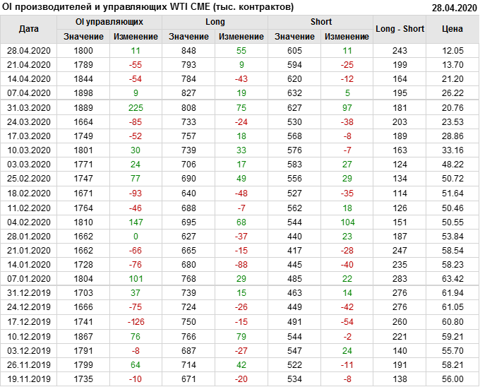 За прошлую неделю, 22.04.20 — 28.04.20, разница между длинными и короткими позициями производителей и управляющих выросла на 44 тыс. контрактов. За отчетный период времени, цена упала на 1.65 доллара. Производители и управляющие в своей совокупности смотрели вверх, не смотря на то что цена продолжала снижаться. Подобный дисбаланс должен привести к стабилизации и развороту цен вверх в скором времени.