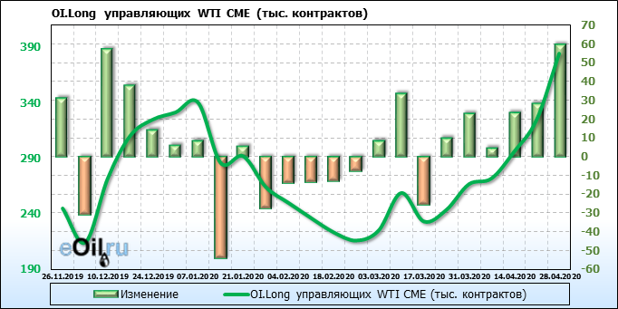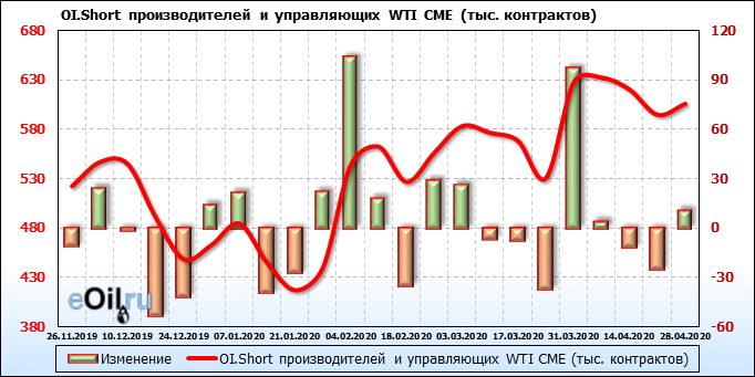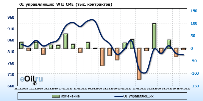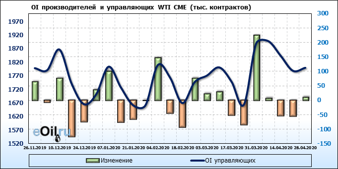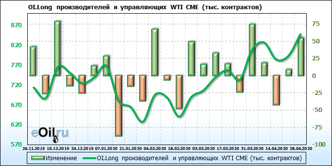 За прошлую неделю, 22.04.20 — 28.04.20, разница между длинными и короткими позициями управляющих выросла на 71 тыс. контрактов. В тоже время, цена упала на 1.65 доллара. Управляющие наращивают длинные позиции, что отражает их видение возможностей роста цены в ближайшее время, и это несмотря на то, что цены на отчетной неделе падали. Если давление со стороны покупателей будет продолжено, рынок развернется вверх.