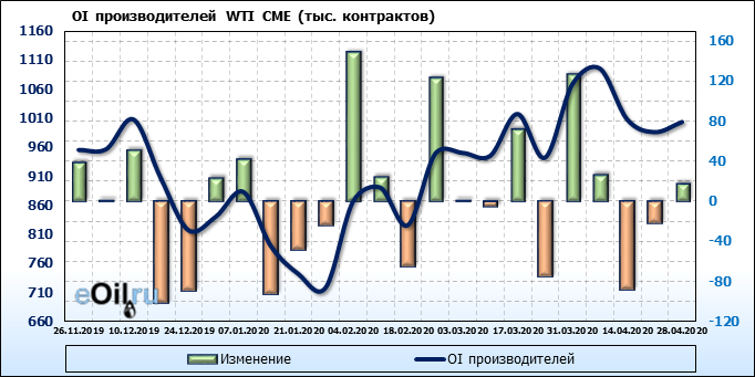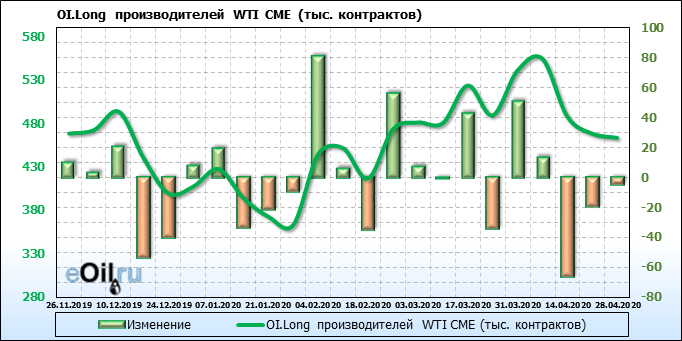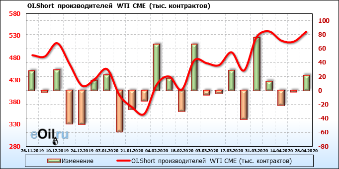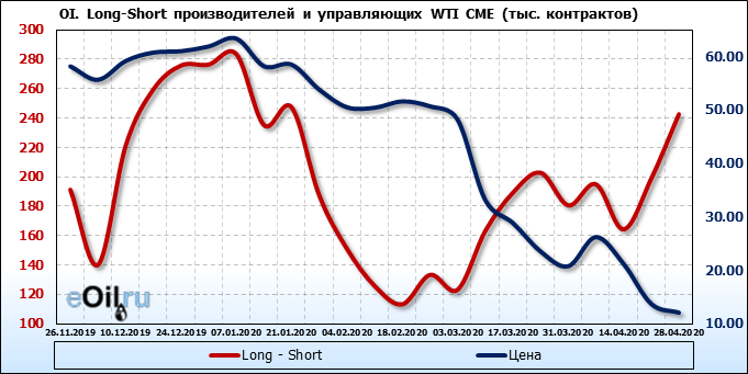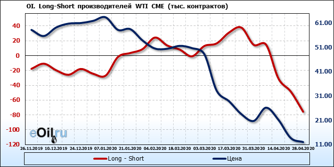 За прошлую неделю, 22.04.20 — 28.04.20, разница между длинными и короткими позициями производителей упала на 27 тыс. контрактов. В тоже время, цена упала на 1.65 доллара. Производители наращивают короткие позиции, что не дает цене расти. В такой ситуации на рынке возможно ускорение падения цен.