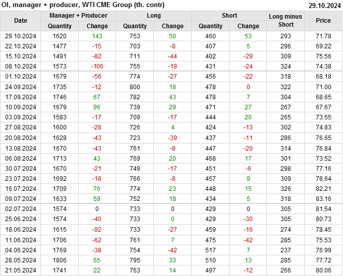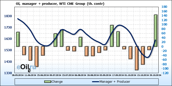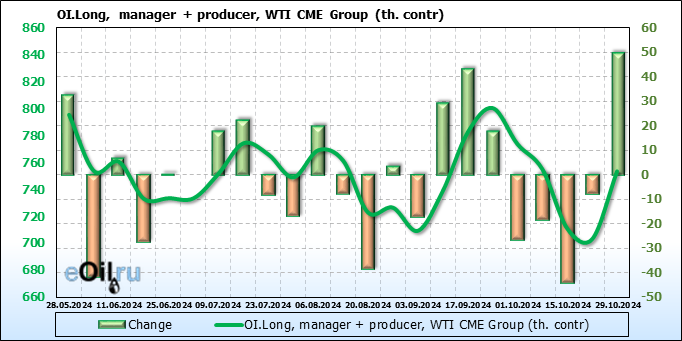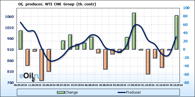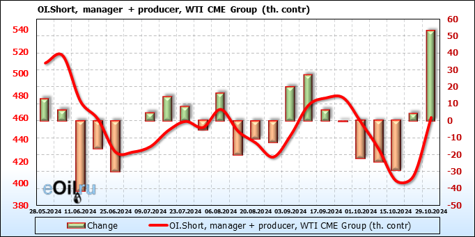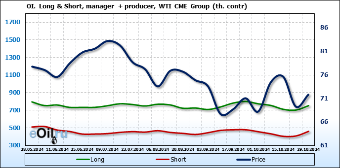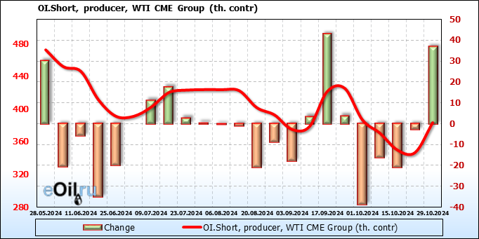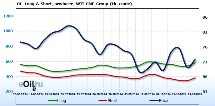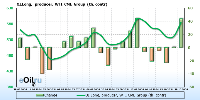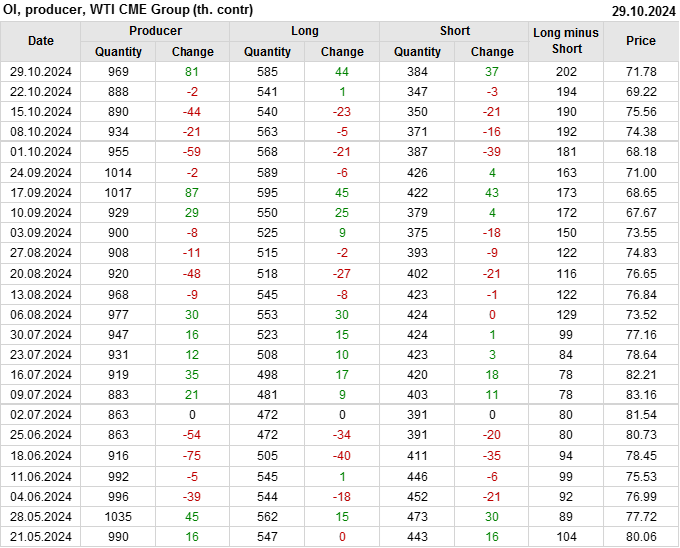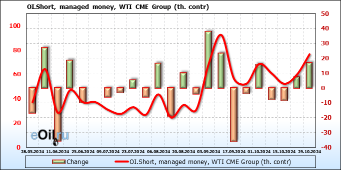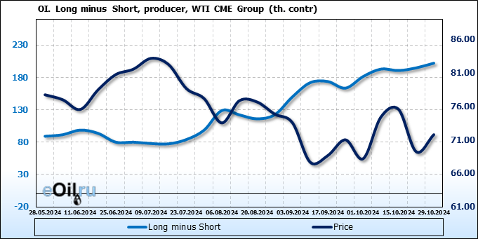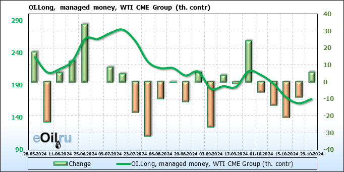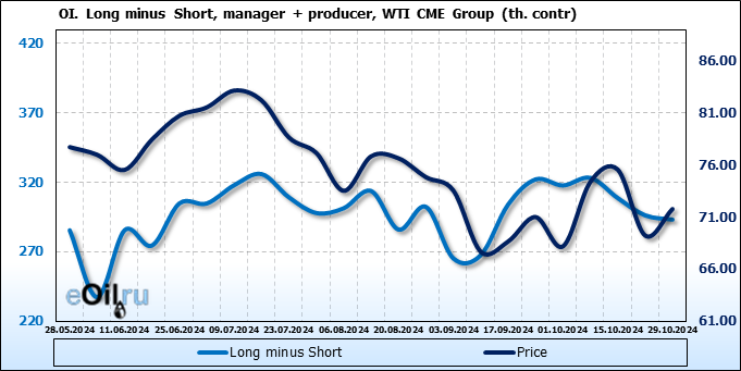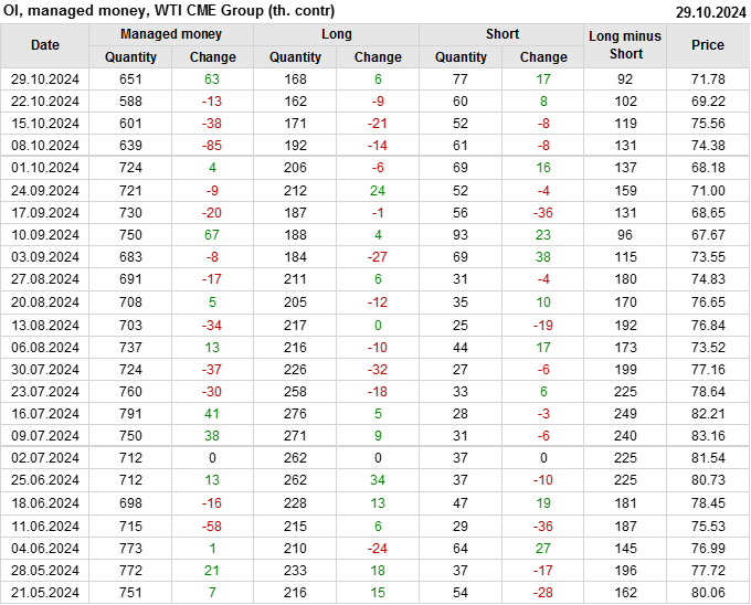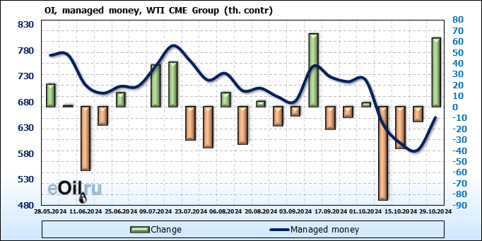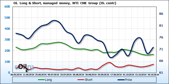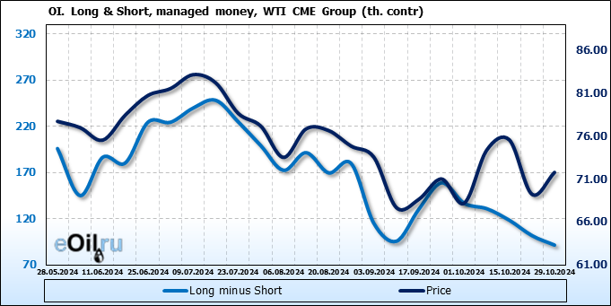 За прошлую неделю, 23.10.24 — 29.10.24, разница между длинными и короткими позициями управляющих сократилась на 10.3 тыс. контрактов. В тоже время, цена выросла на 2.56 доллара.