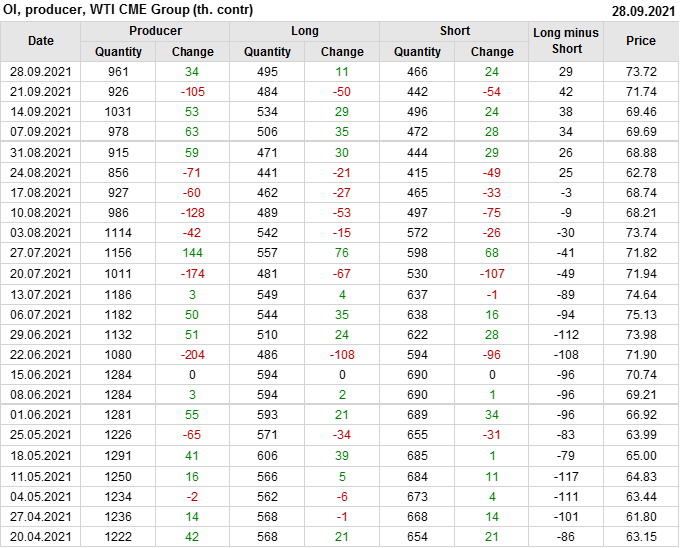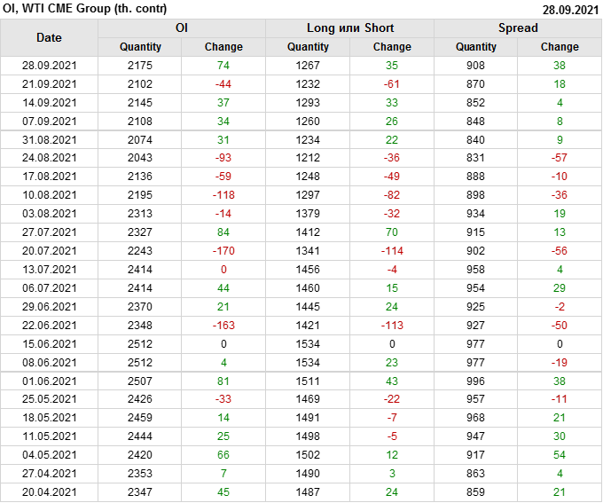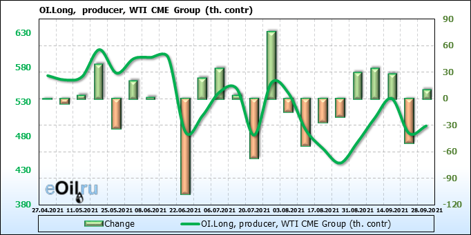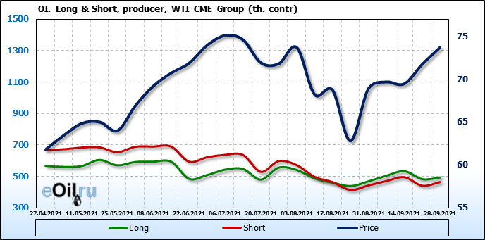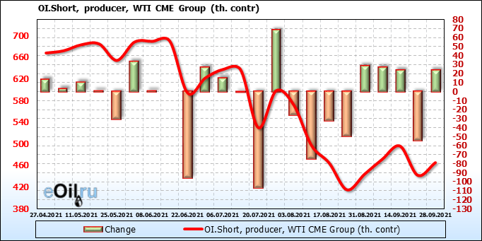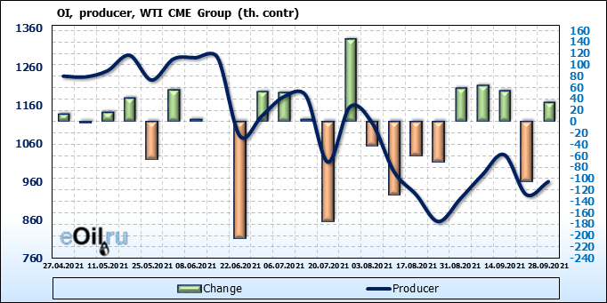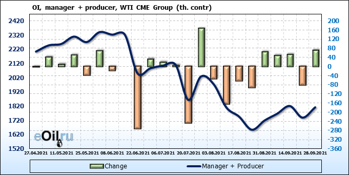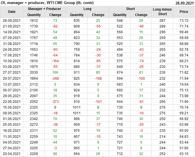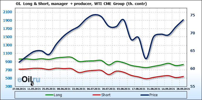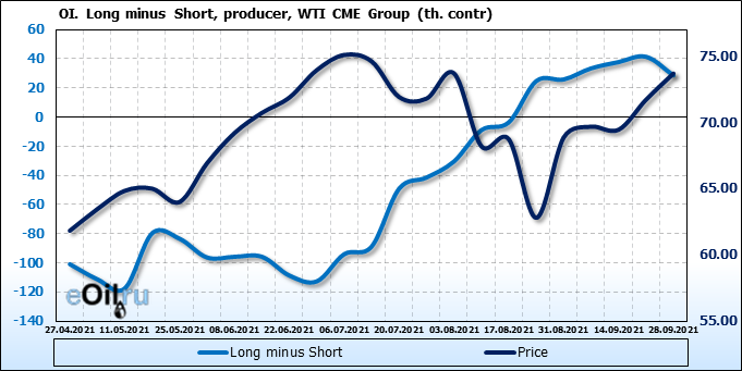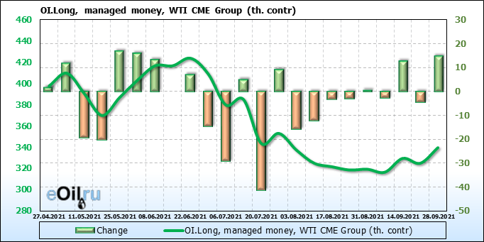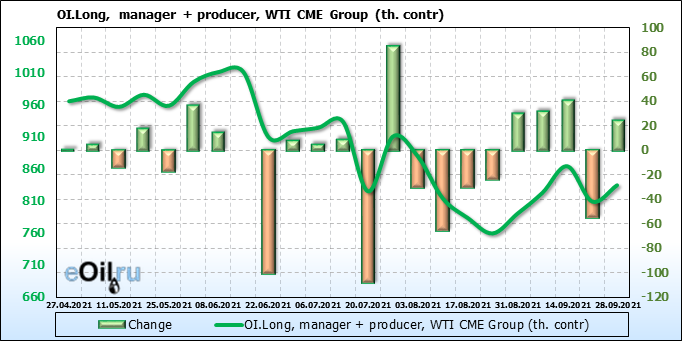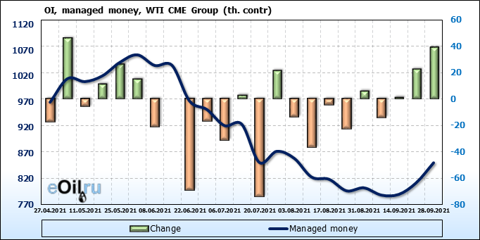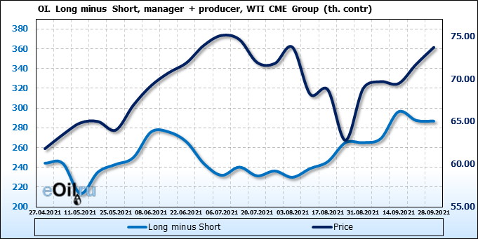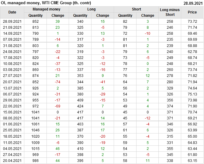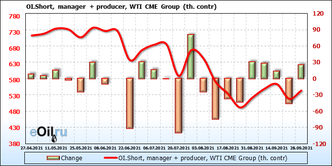 За прошлую неделю, 22.09.21 — 28.09.21, разница между длинными и короткими позициями управляющих увеличилась на 12.1 тыс. контрактов. В тоже время, цена выросла на 1.98 доллара.