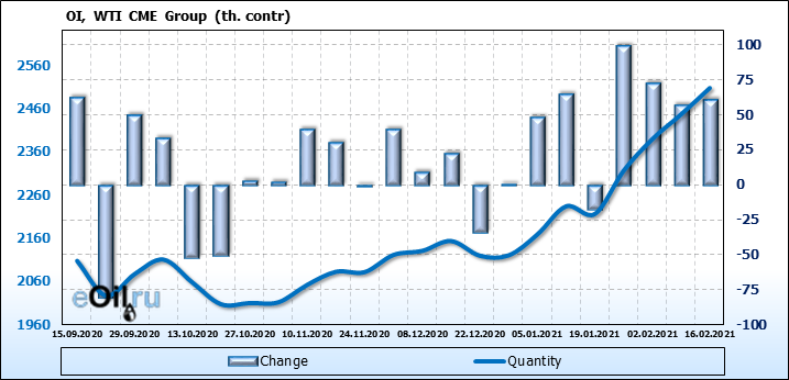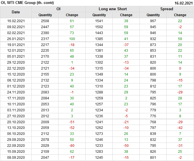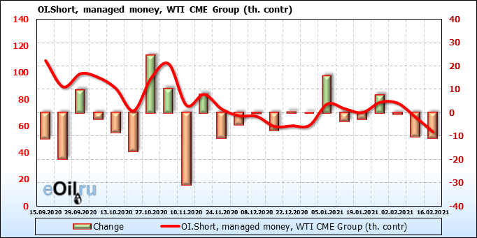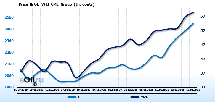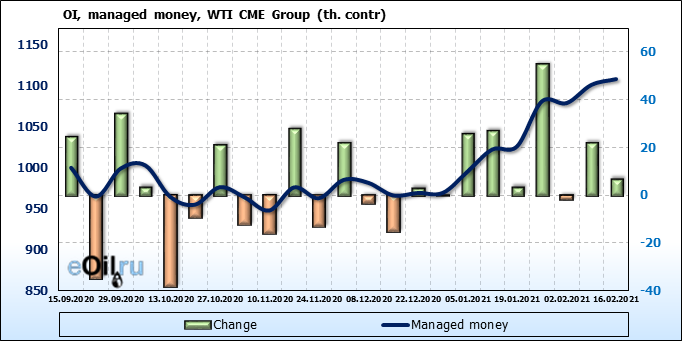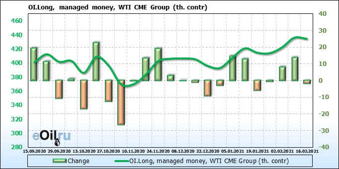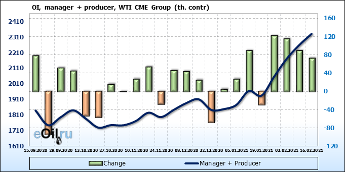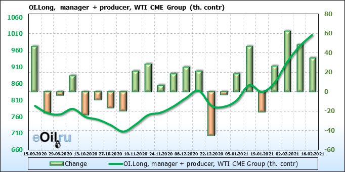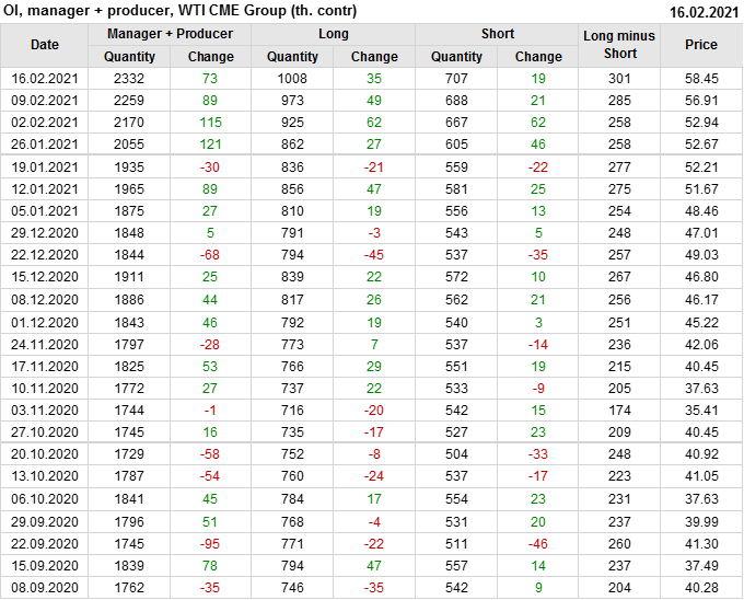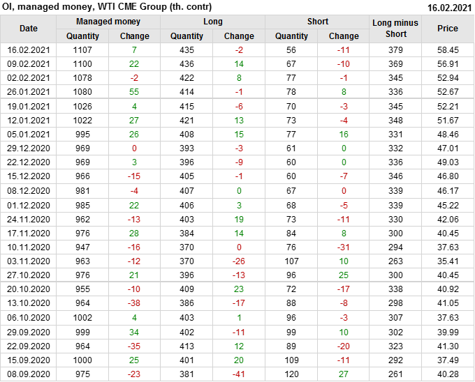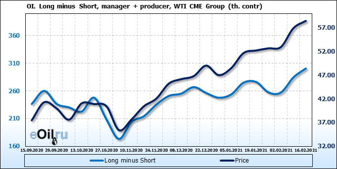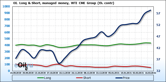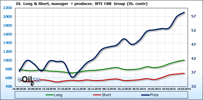 За прошлую неделю, 10.02.21 — 16.02.21, разница между длинными и короткими позициями управляющих выросла на 9 тыс. контрактов. В тоже время, цена выросла на 1.54 доллара. Управляющие наращивают позиции, разгоняя тем самым рост цен, что говорит нам о текущей силе рынка.