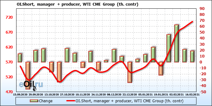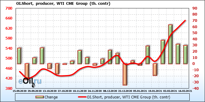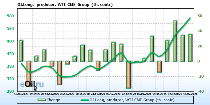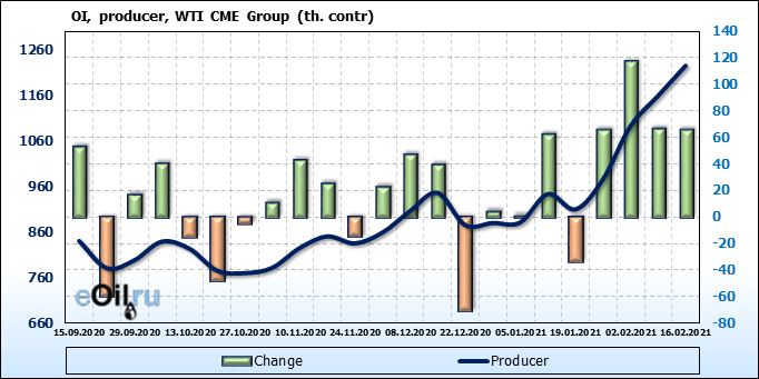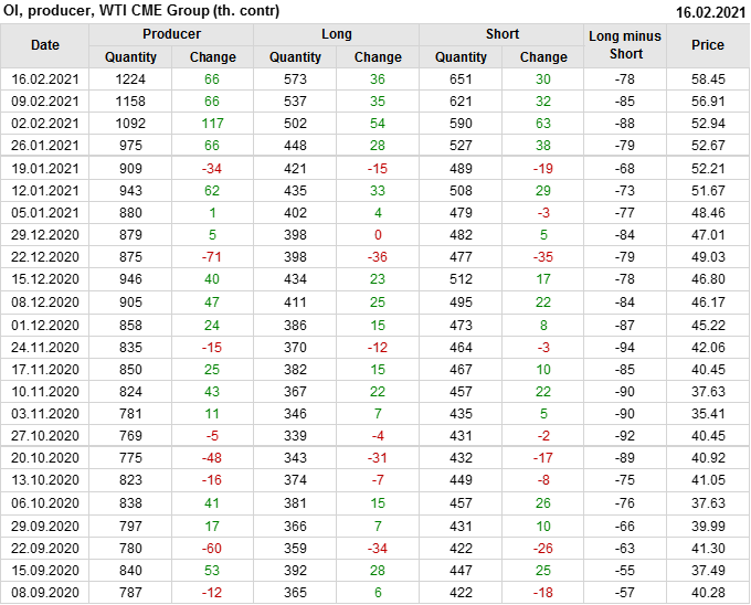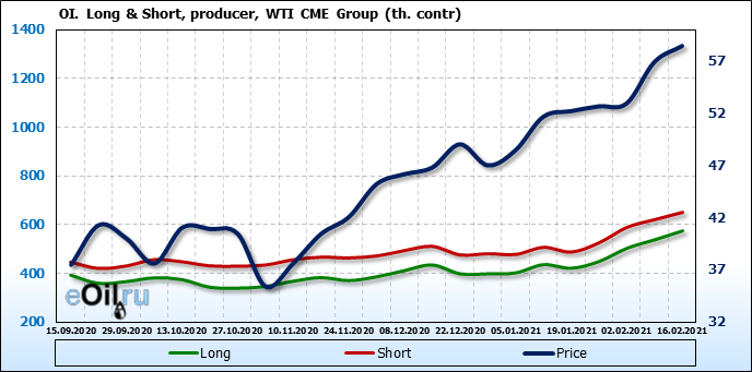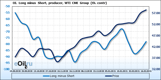 За прошлую неделю, 10.02.21 — 16.02.21, разница между длинными и короткими позициями производителей выросла на 7 тыс. контрактов. В тоже время, цена выросла на 1.54 доллара. Производители не торопятся наращивать продажи, предполагая, что возможен рост цены в ближайшее время.