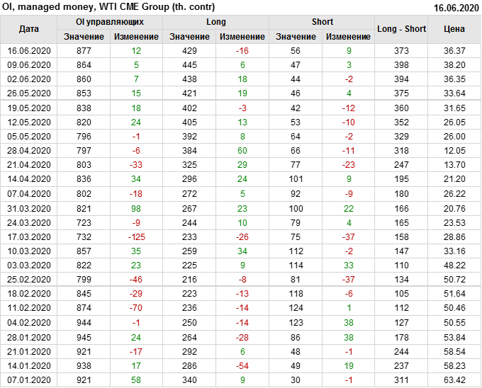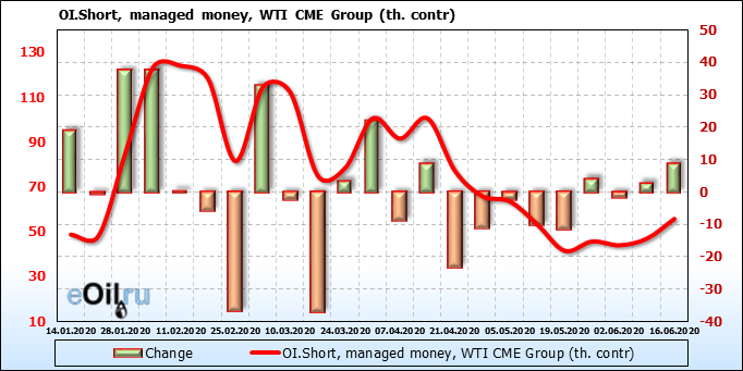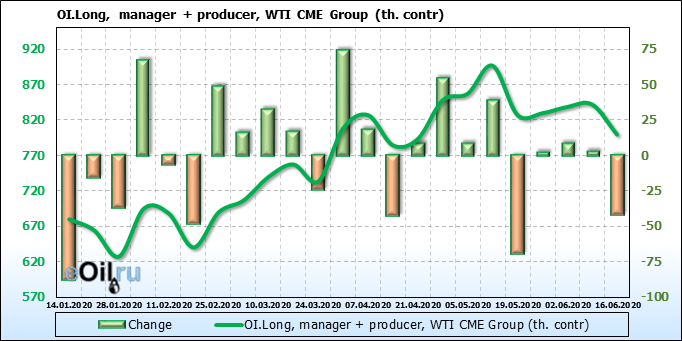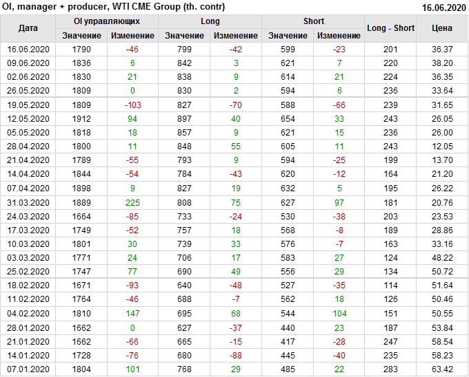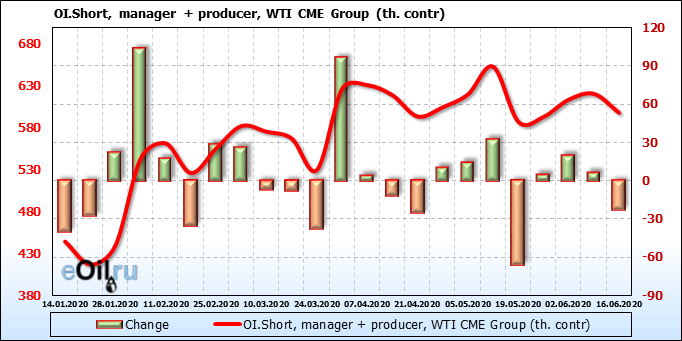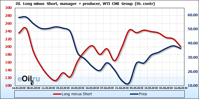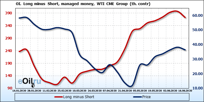 За прошлую неделю, 10.06.20 — 16.06.20, разница между длинными и короткими позициями управляющих упала на 24 тыс. контрактов. В тоже время, цена упала на 1.83 доллара. Наращивание коротких позиций спекулянтами приводит к падению цен. Если давление со стороны медведей продолжится, то мы можем увидеть новые минимумы.