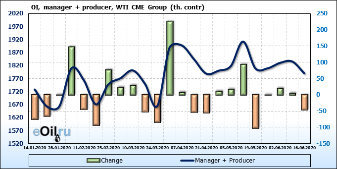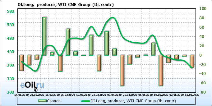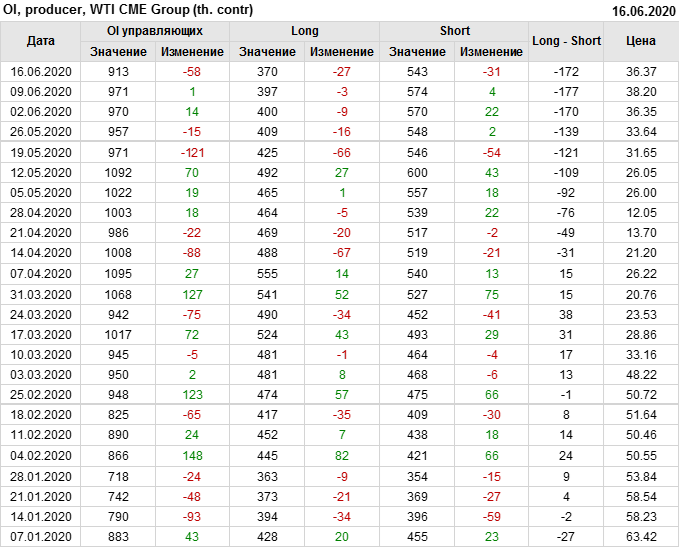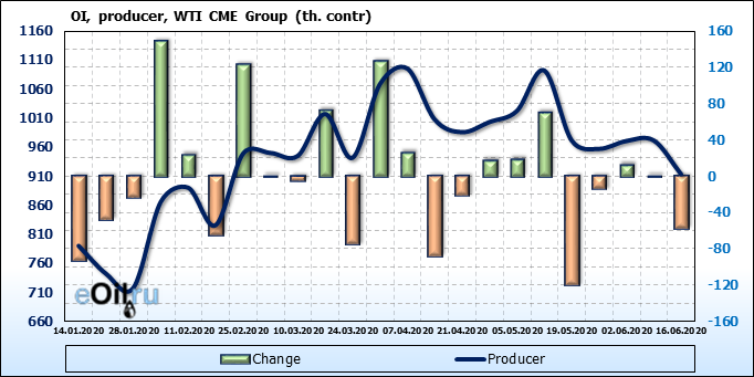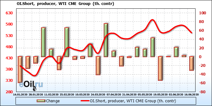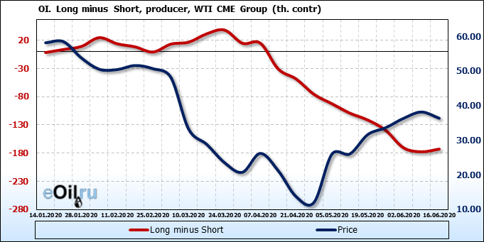 За прошлую неделю, 10.06.20 — 16.06.20, разница между длинными и короткими позициями производителей выросла на 5 тыс. контрактов. В тоже время, цена упала на 1.83 доллара. Производители перестали наращивать короткие позиции, что говорит или о непривлекательности текущих ценовых уровней для хеджирования, или о том, что часть участников рынка заняла выжидательную позицию.