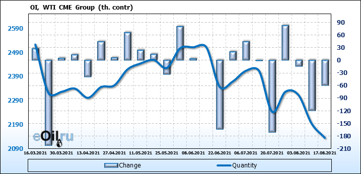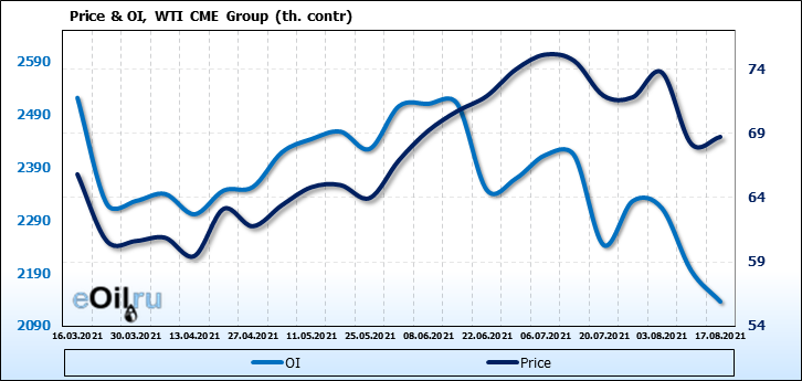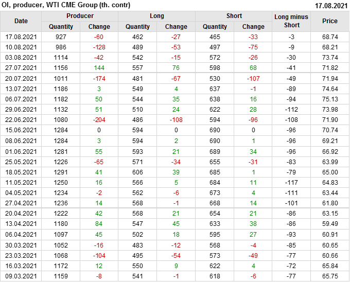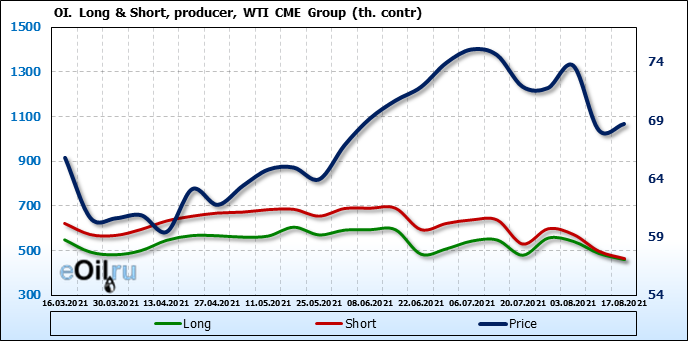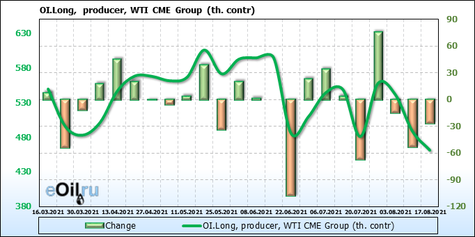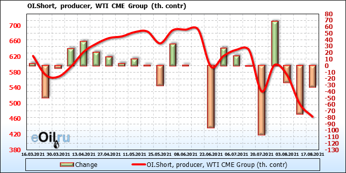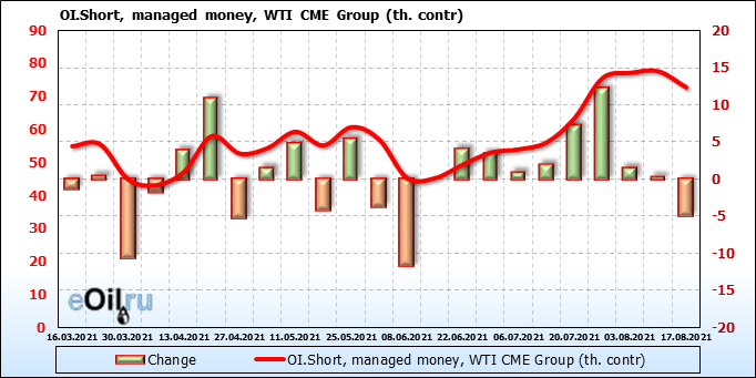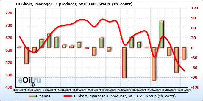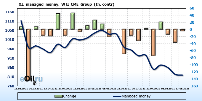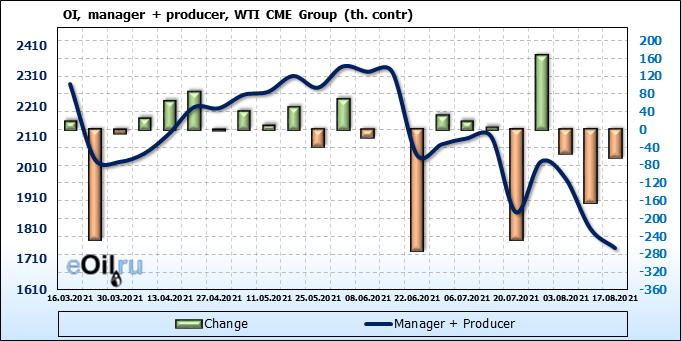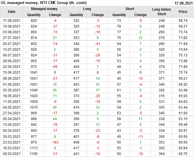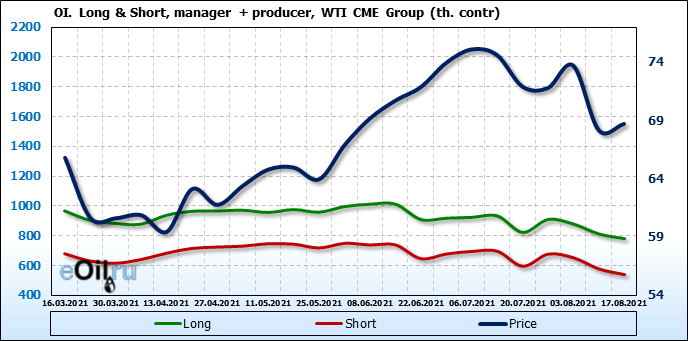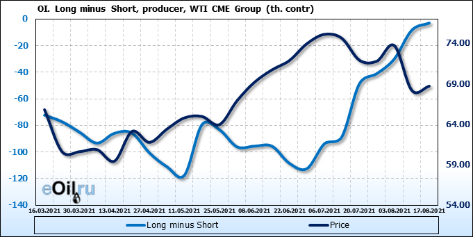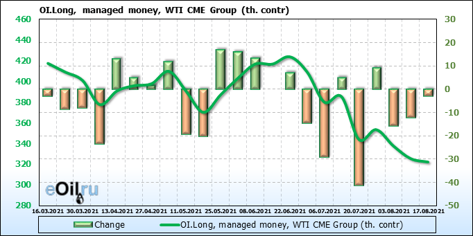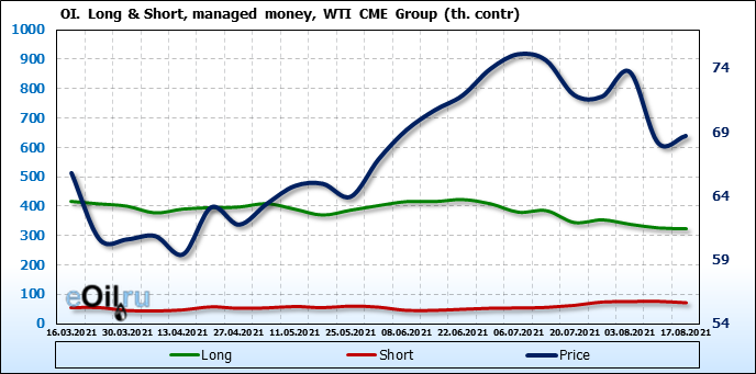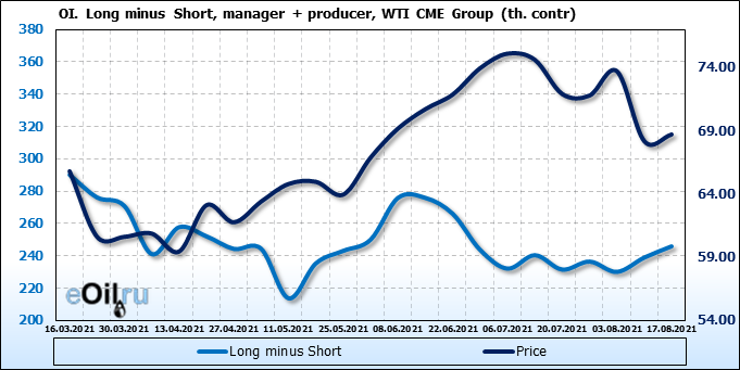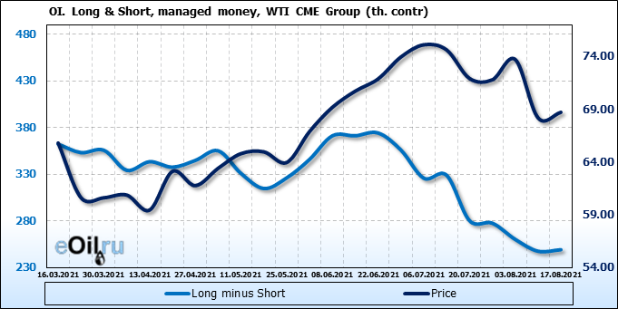 За прошлую неделю, 11.08.21 — 17.08.21, разница между длинными и короткими позициями управляющих увеличилась на 1.6 тыс. контрактов. В тоже время, цена выросла на 0.53 доллара.