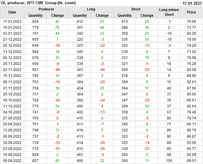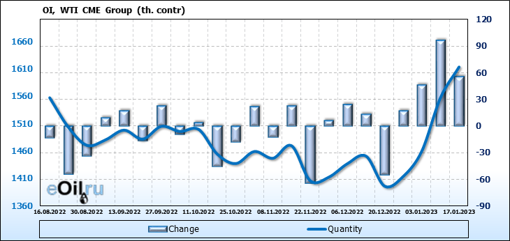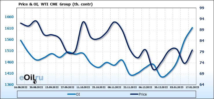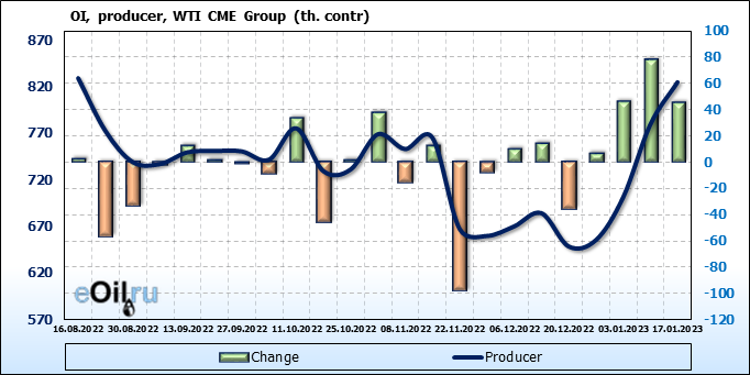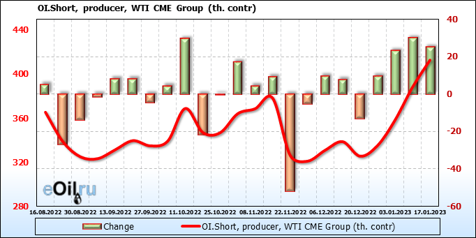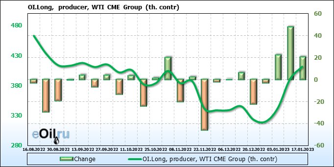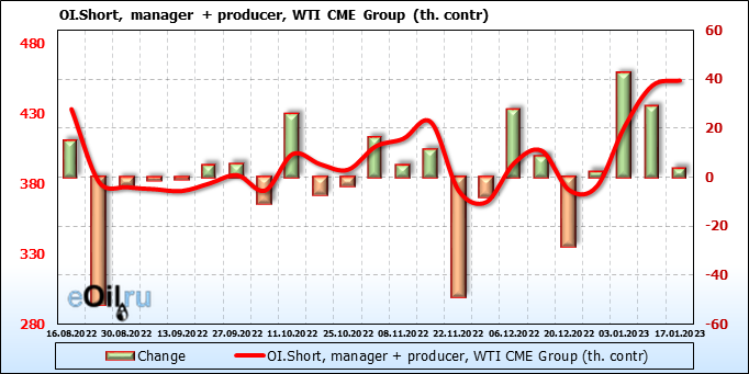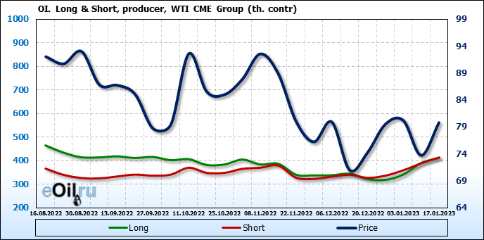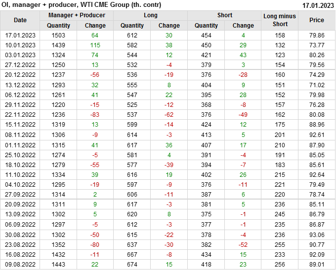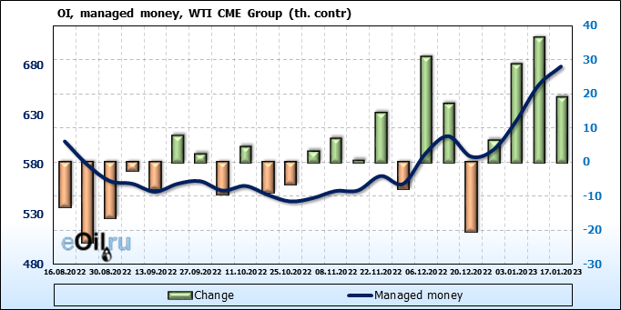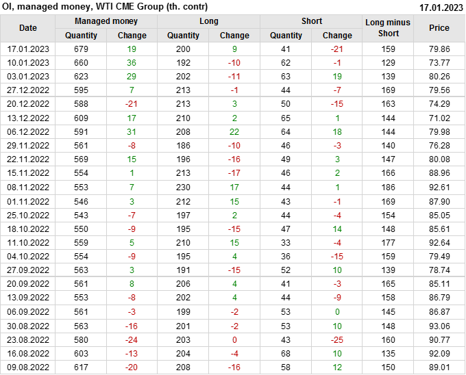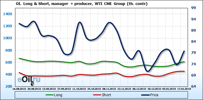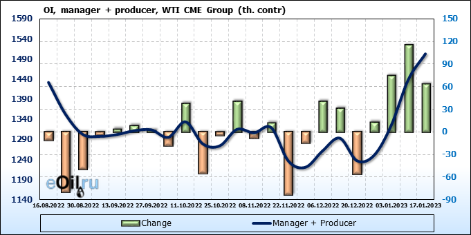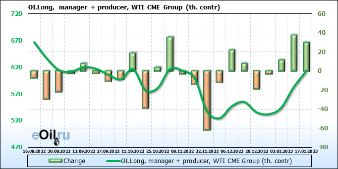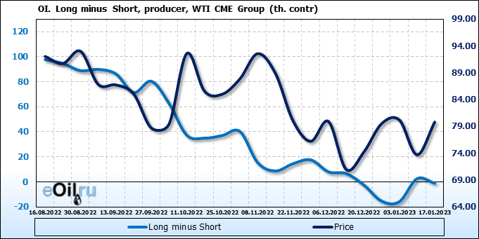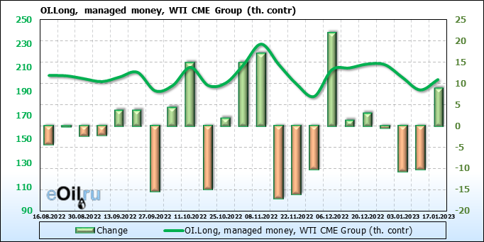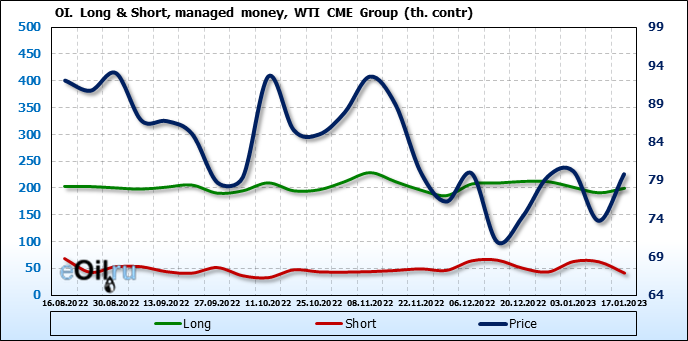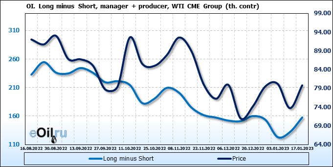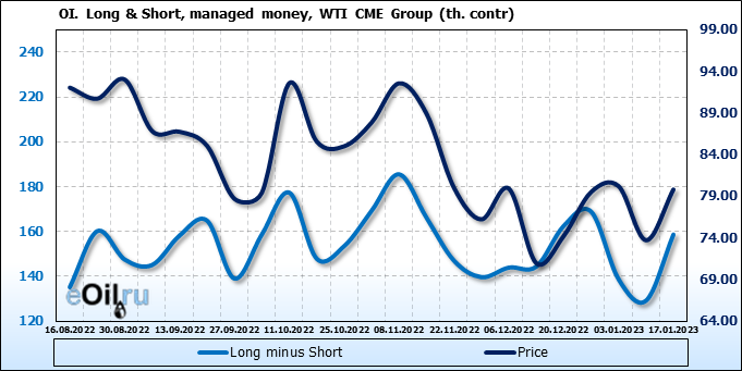 За прошлую неделю, 11.01.23 — 17.01.23, разница между длинными и короткими позициями управляющих увеличилась на 29.5 тыс. контрактов. В тоже время, цена выросла на 6.09 доллара.