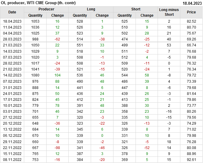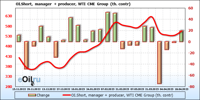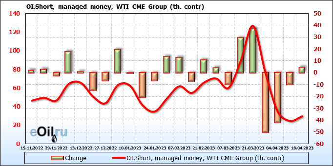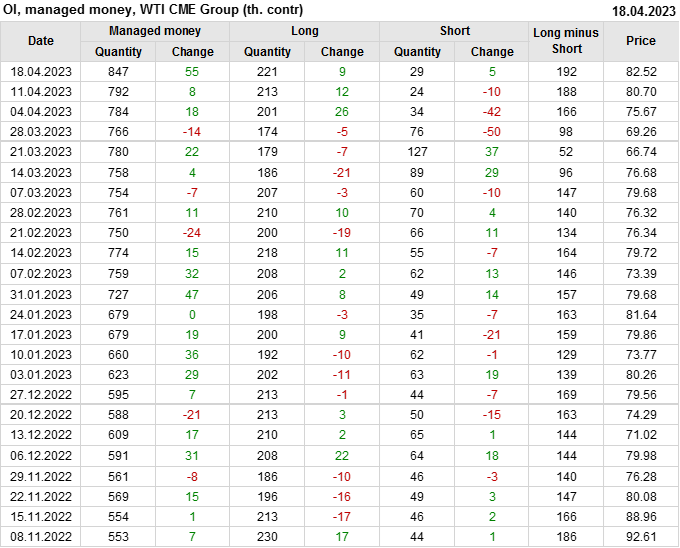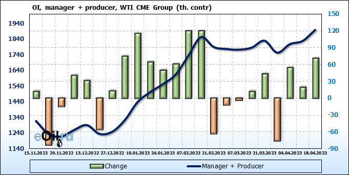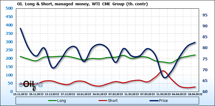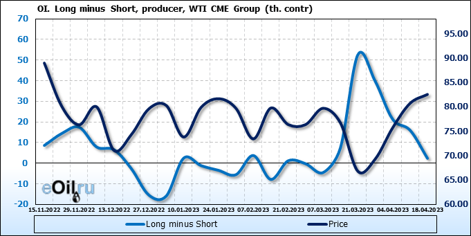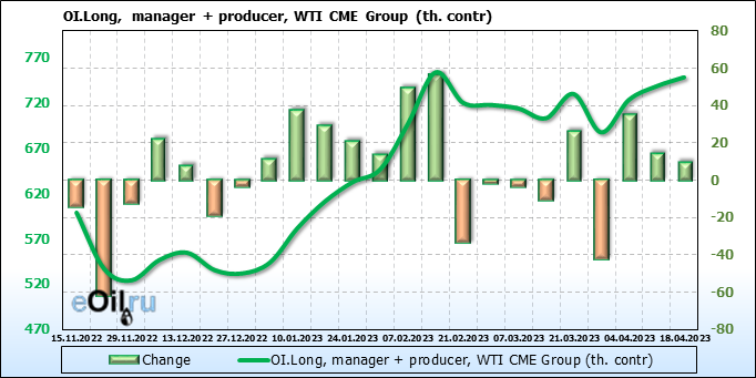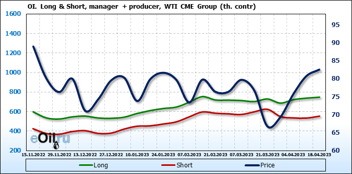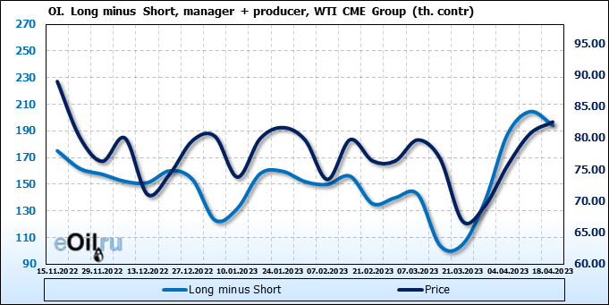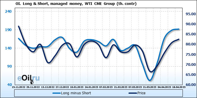 За прошлую неделю, 12.04.23 — 18.04.23, разница между длинными и короткими позициями управляющих увеличилась на 3.4 тыс. контрактов. В тоже время, цена выросла на 1.82 доллара.