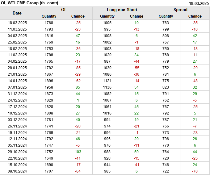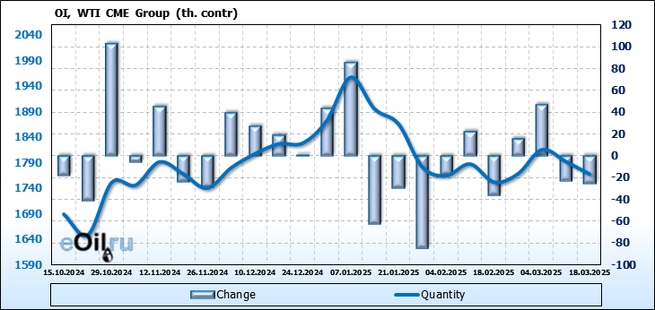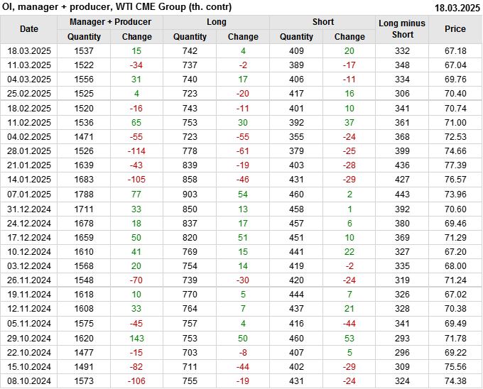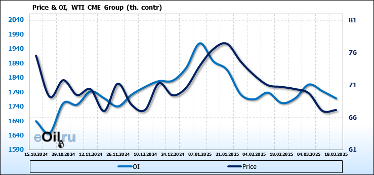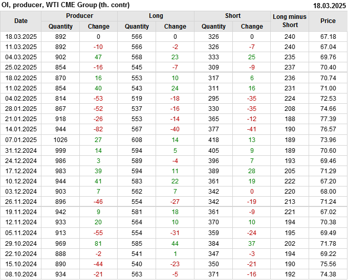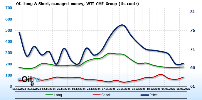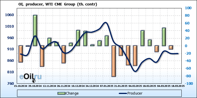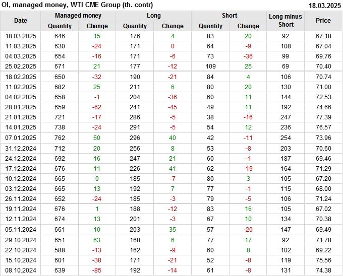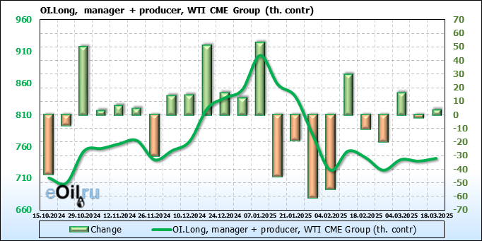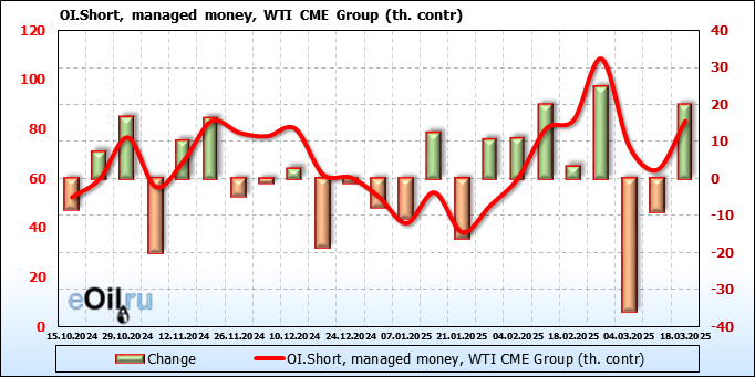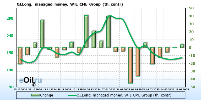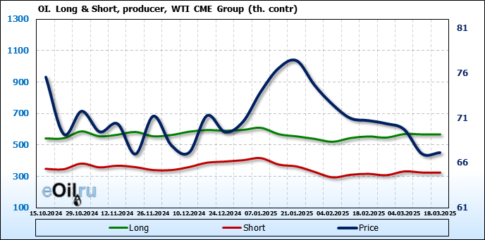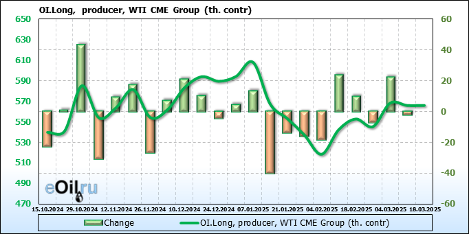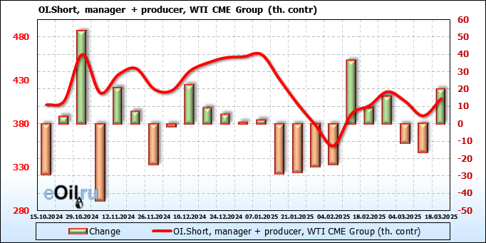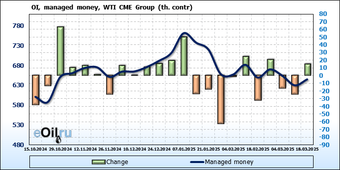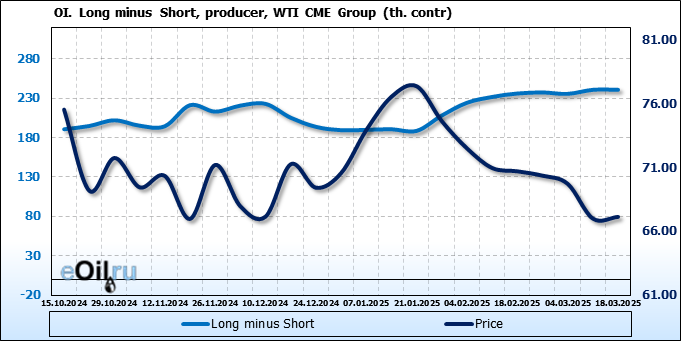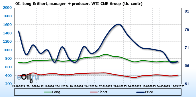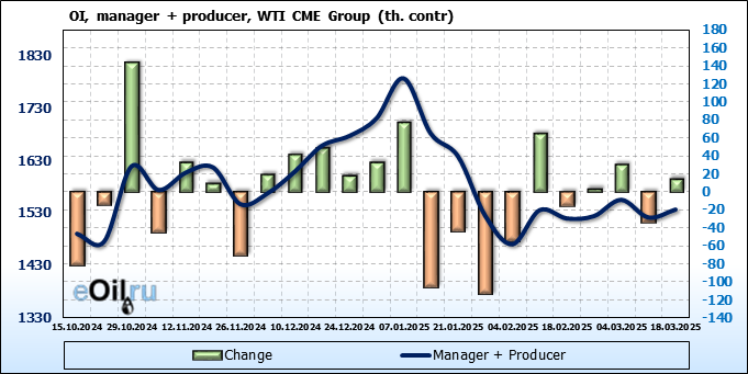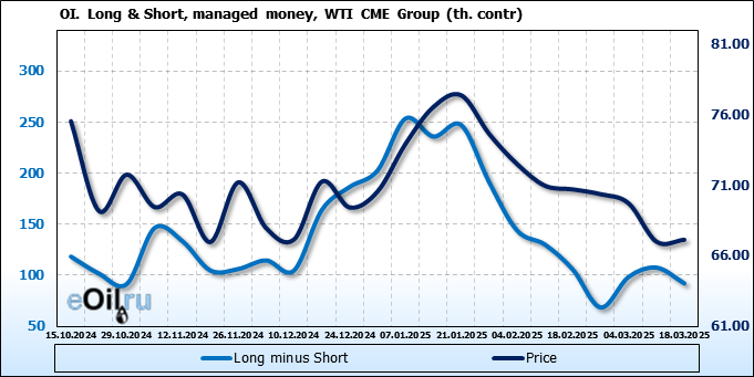 За прошлую неделю, 12.03.25 — 18.03.25, разница между длинными и короткими позициями управляющих сократилась на 15.5 тыс. контрактов. В тоже время, цена выросла на 0.14 доллара.