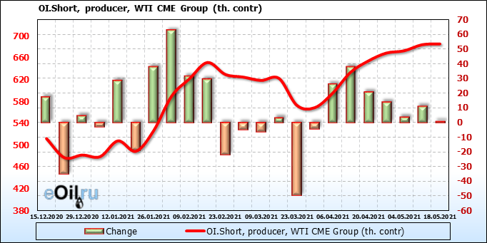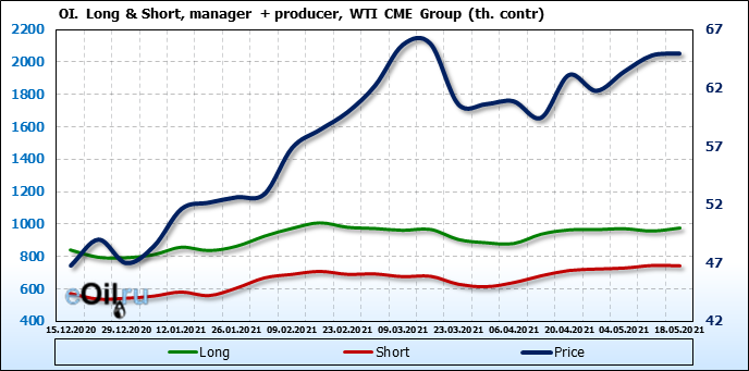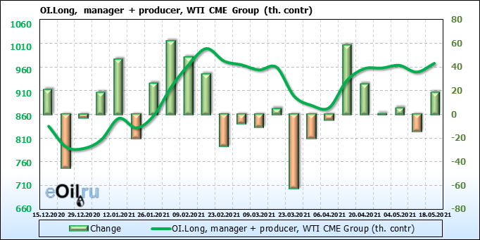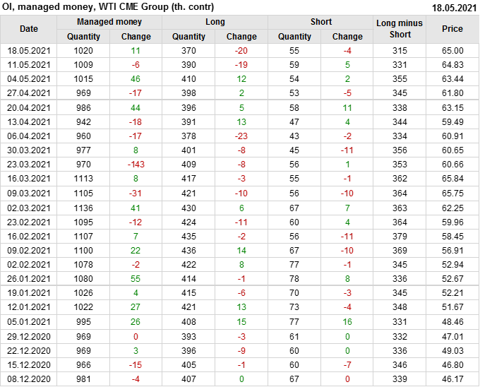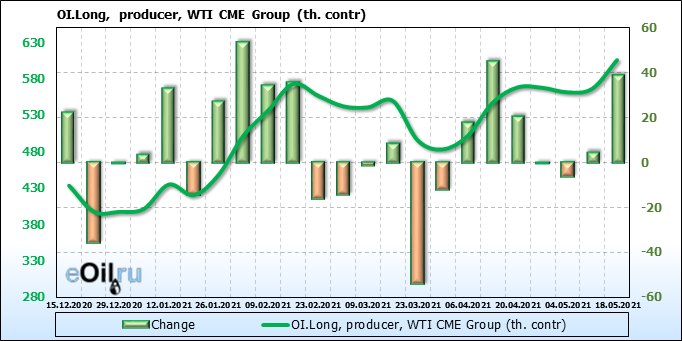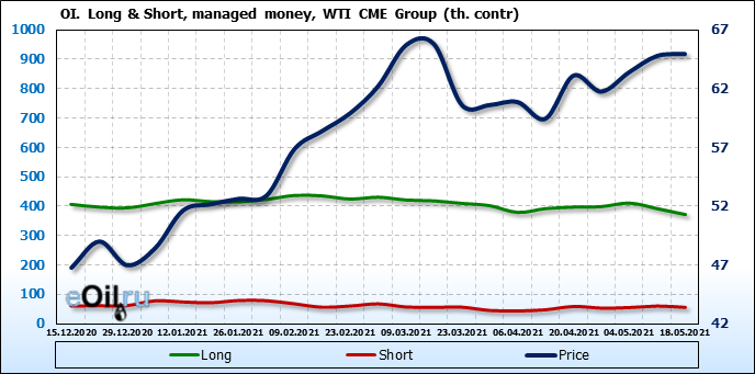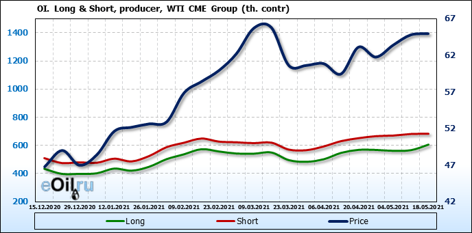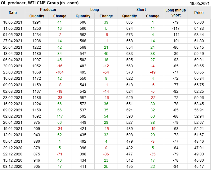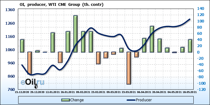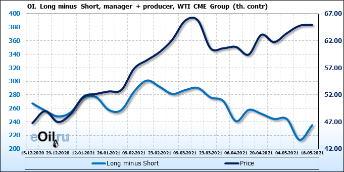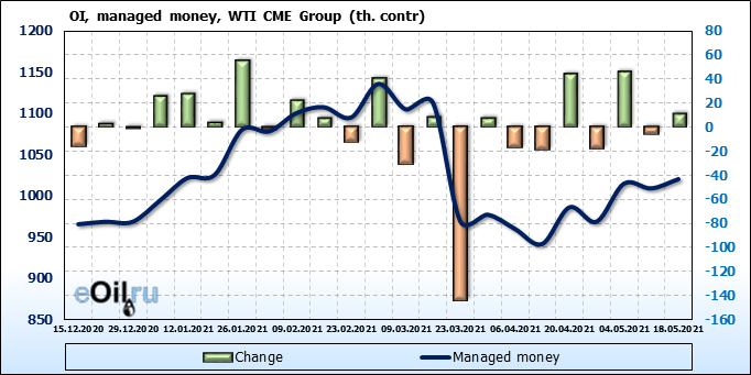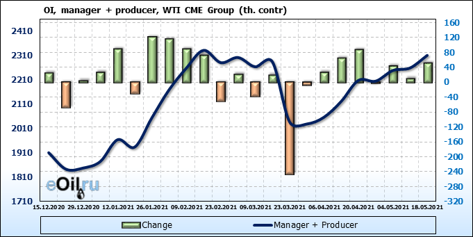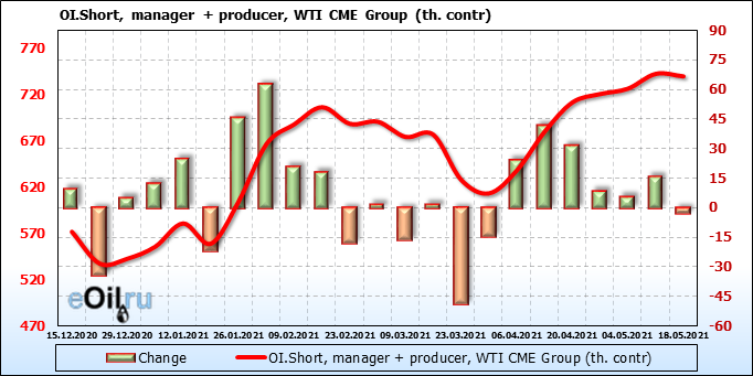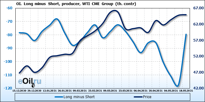 За прошлую неделю, 12.05.21 — 18.05.21, разница между длинными и короткими позициями управляющих упала на 16.2 тыс. контрактов. В тоже время, цена выросла на 0.17 доллара. Управляющие не горят желанием покупать, что заставляет нас рассуждать о потери доверия к тенденции со стороны быков — спекулянтов. Рынок становится более тонким. Без прихода свежих объемов, толкать цену вверх скоро будет некому.