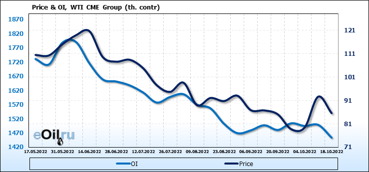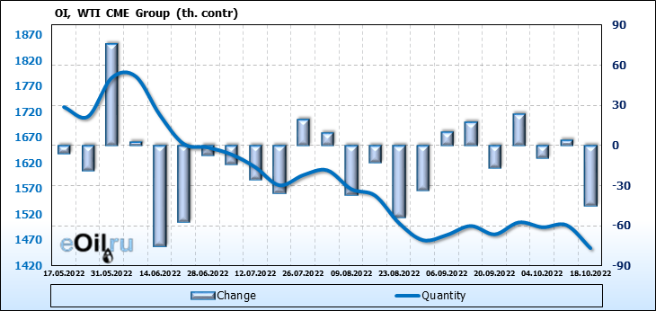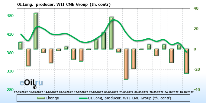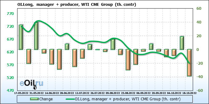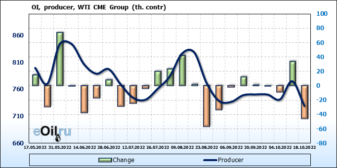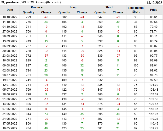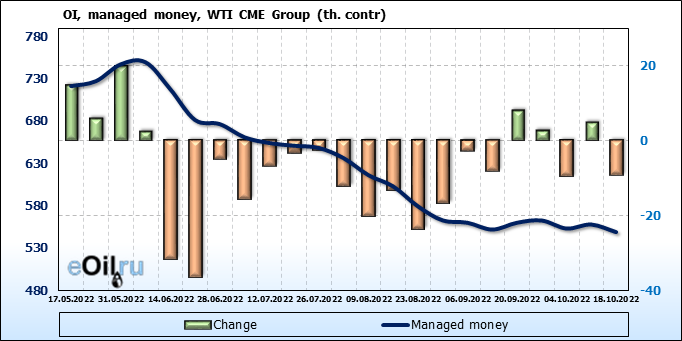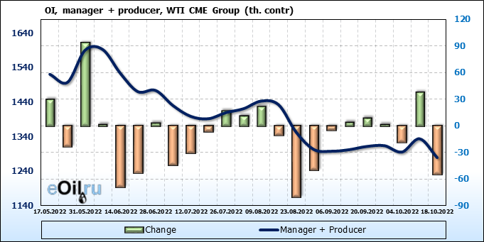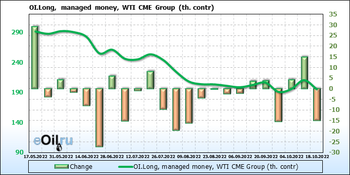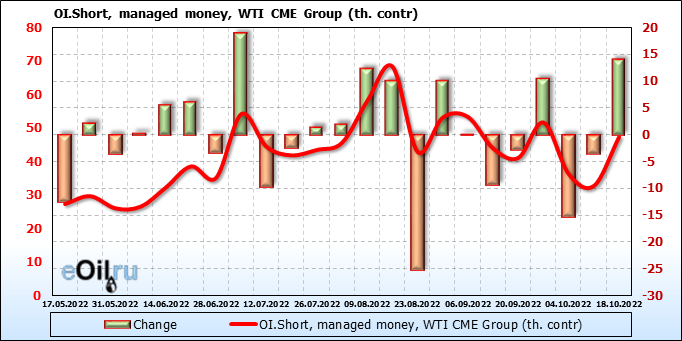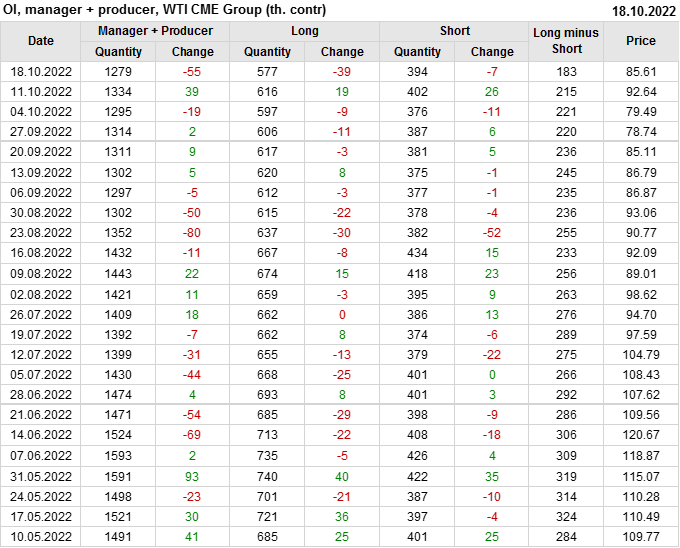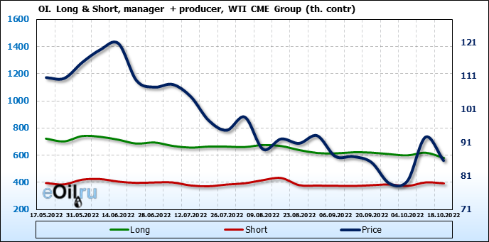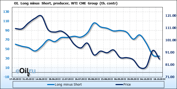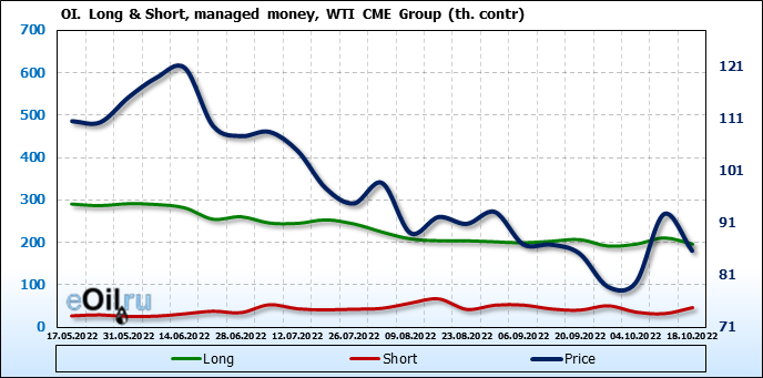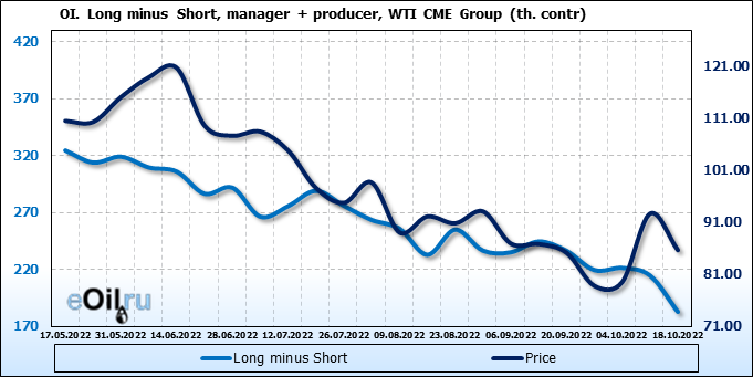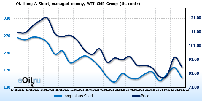 За прошлую неделю, 12.10.22 — 18.10.22, разница между длинными и короткими позициями управляющих сократилась на 29.5 тыс. контрактов. В тоже время, цена упала на 7.03 доллара.