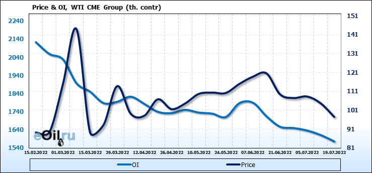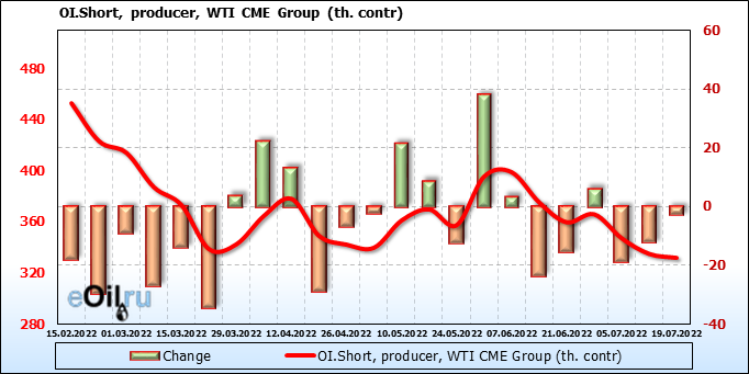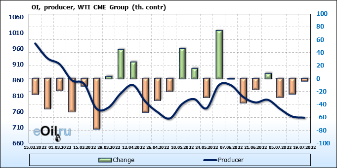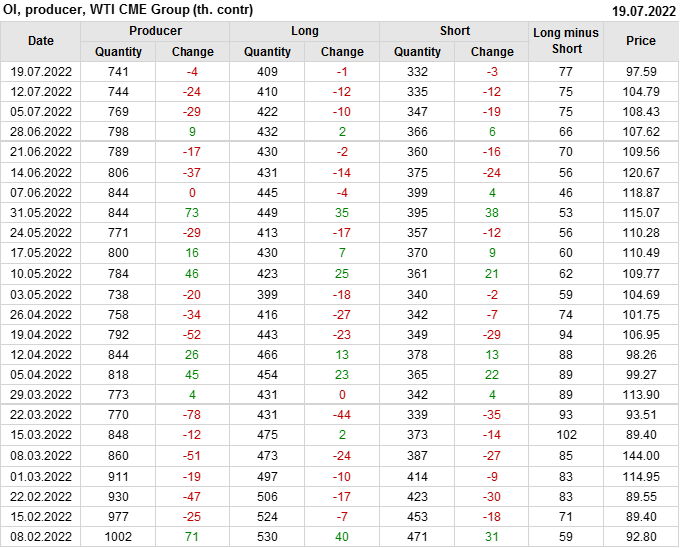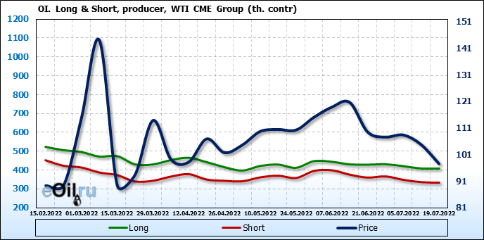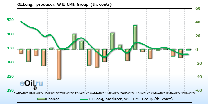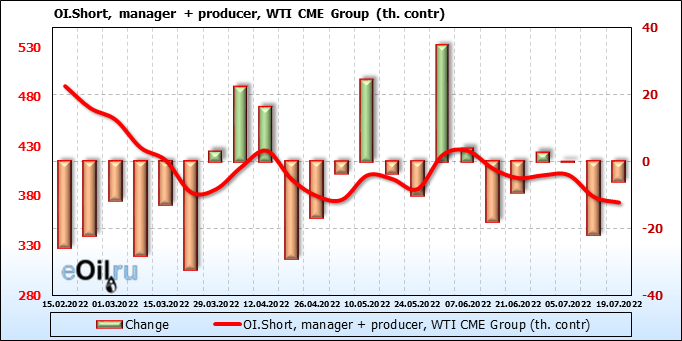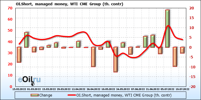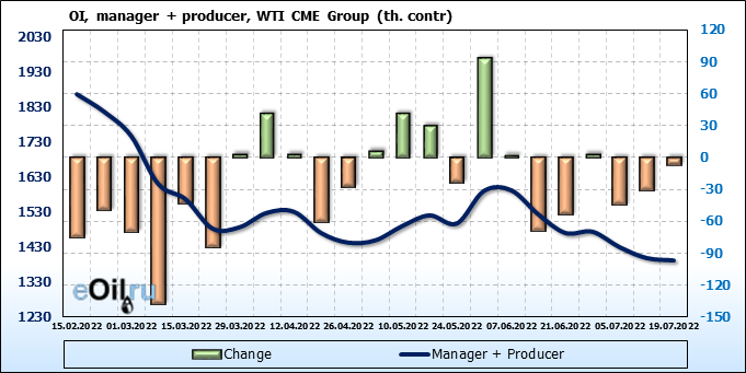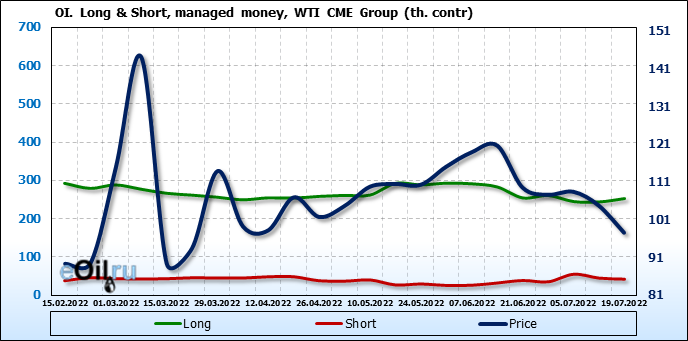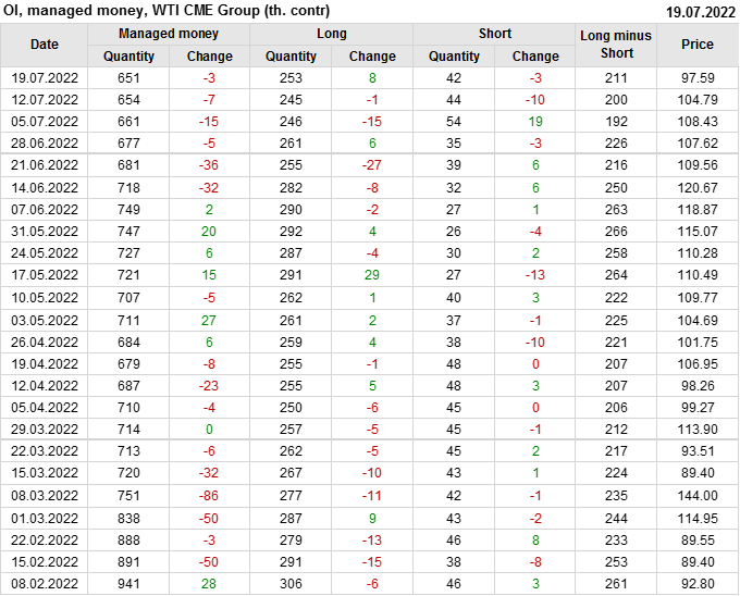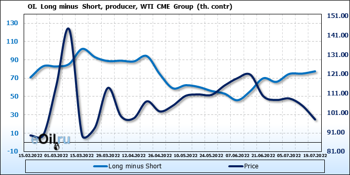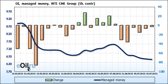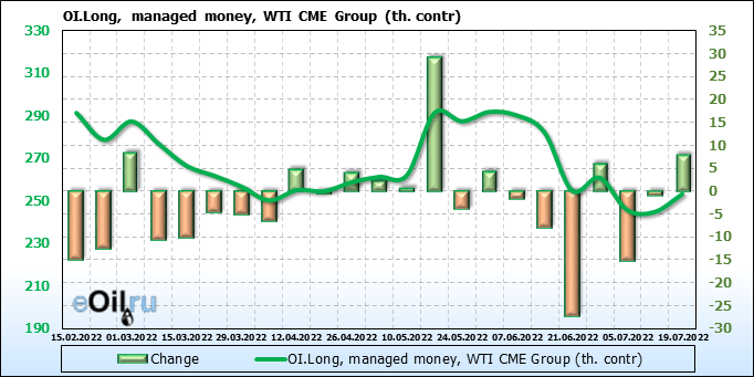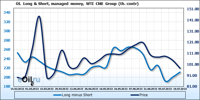За прошлую неделю, 13.07.22 — 19.07.22, разница между длинными и короткими позициями управляющих увеличилась на 10.9 тыс. контрактов. В тоже время, цена упала на 7.2 доллара.