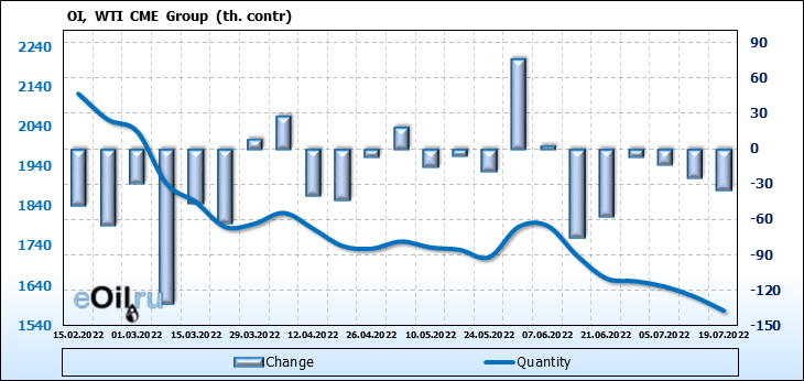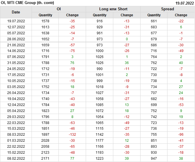 За прошлую неделю, 13.07.22 — 19.07.22, открытый интерес упал на 35 тыс. контрактов. Объем вовлеченных в торговлю контрактов составляет 1 577 616 штук. Текущее положение дел на рынке таково, что деньги в течение прошлой недели уходили с рынка не видя привлекательности в текущей ситуации.