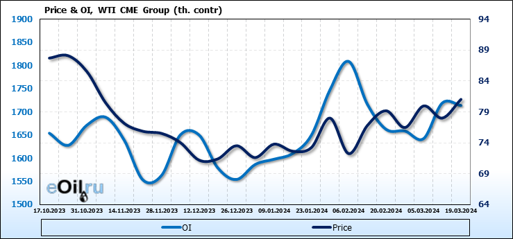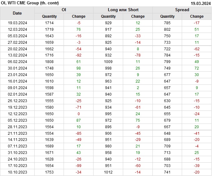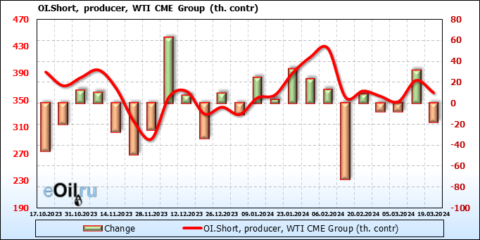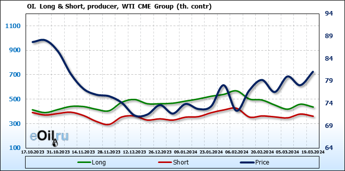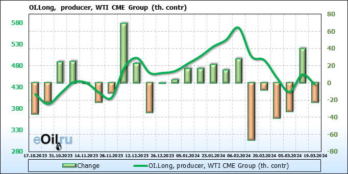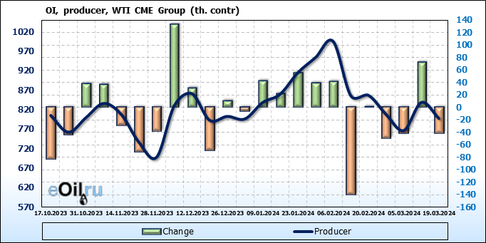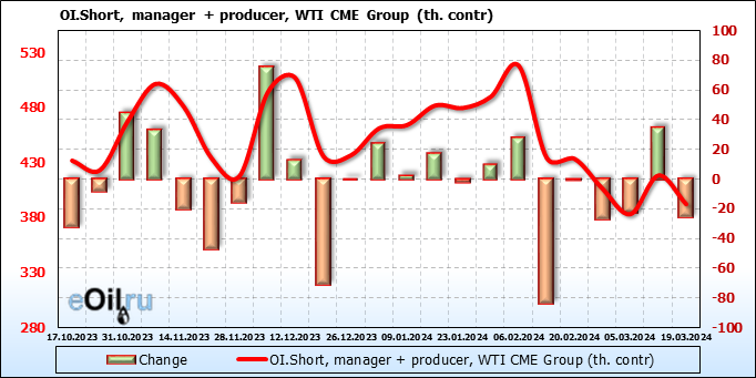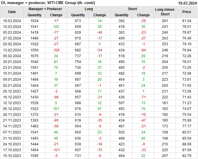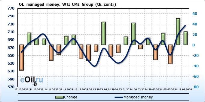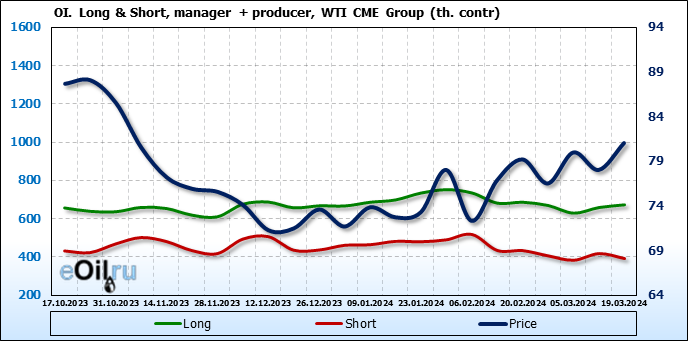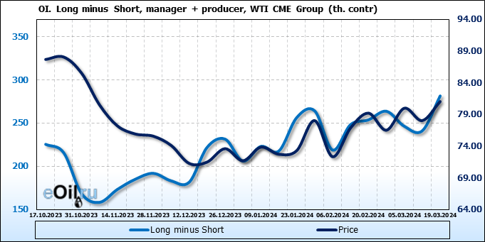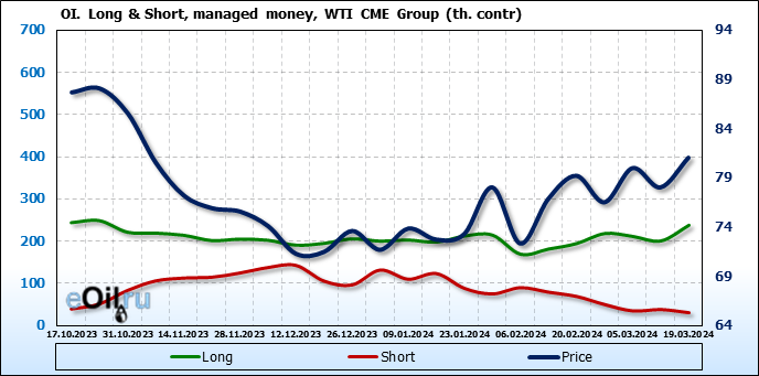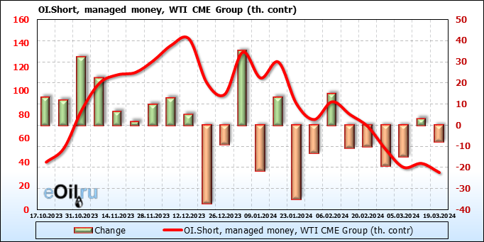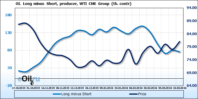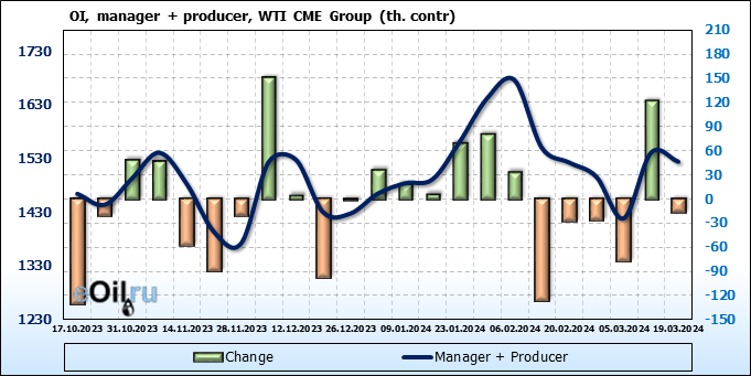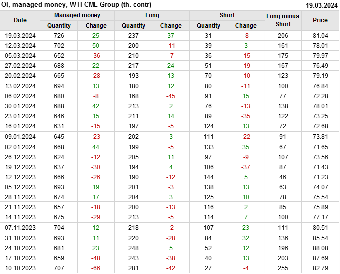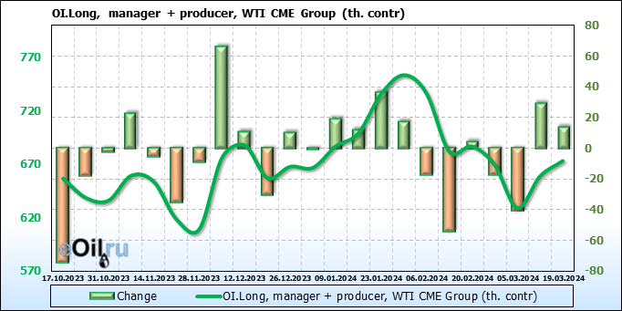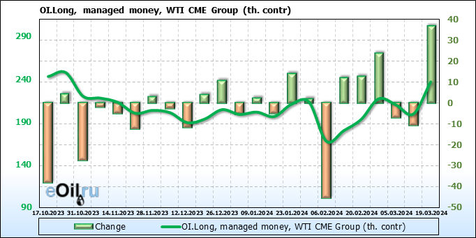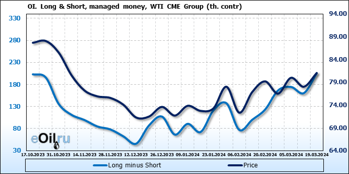 За прошлую неделю, 13.03.24 — 19.03.24, разница между длинными и короткими позициями управляющих увеличилась на 45.1 тыс. контрактов. В тоже время, цена выросла на 3.03 доллара.
