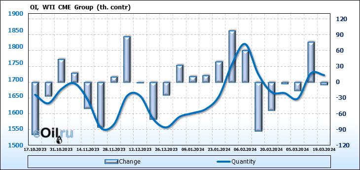 За прошлую неделю, 13.03.24 — 19.03.24, открытый интерес упал на 5 тыс. контрактов. Объем вовлеченных в торговлю контрактов составляет 1 713 716 штук. Текущее положение дел на рынке таково, что деньги в течение прошлой недели уходили с рынка не видя привлекательности в текущей ситуации.