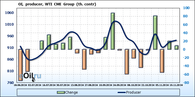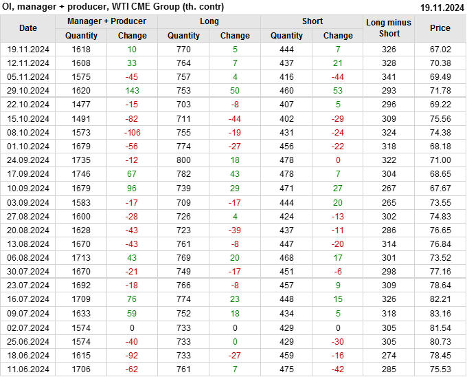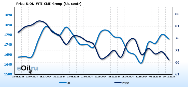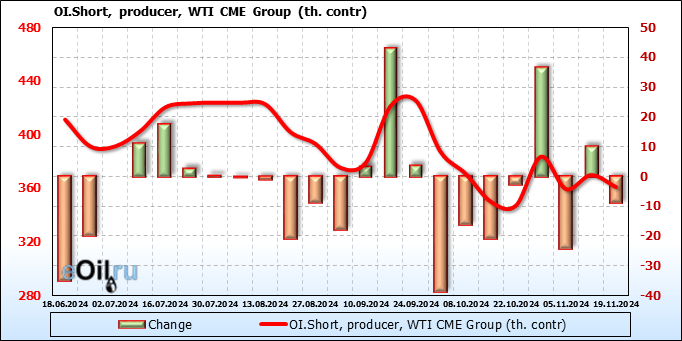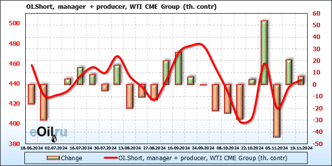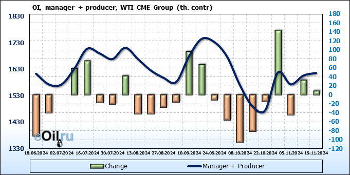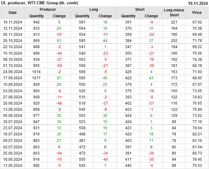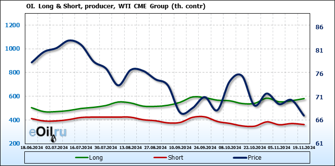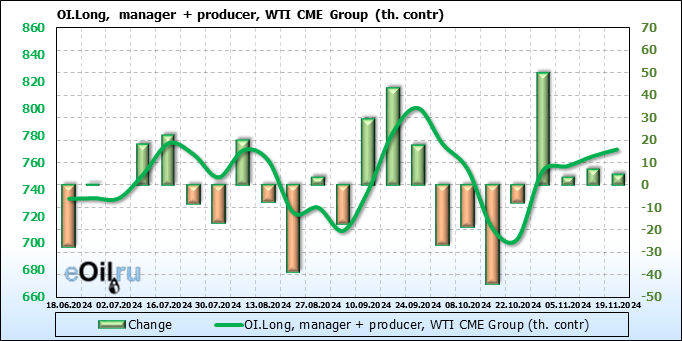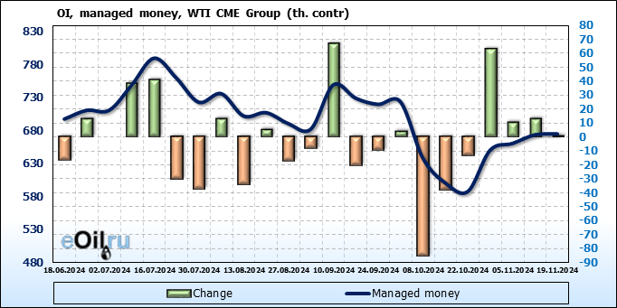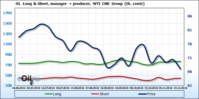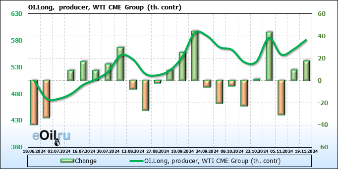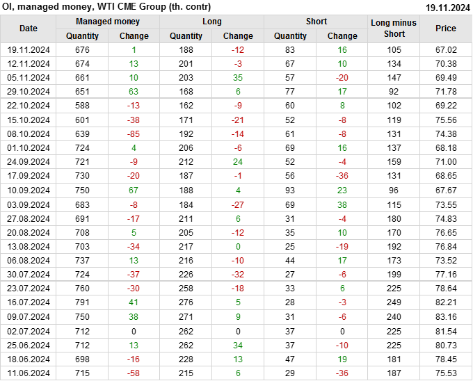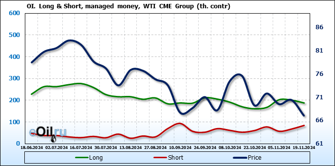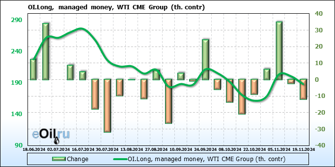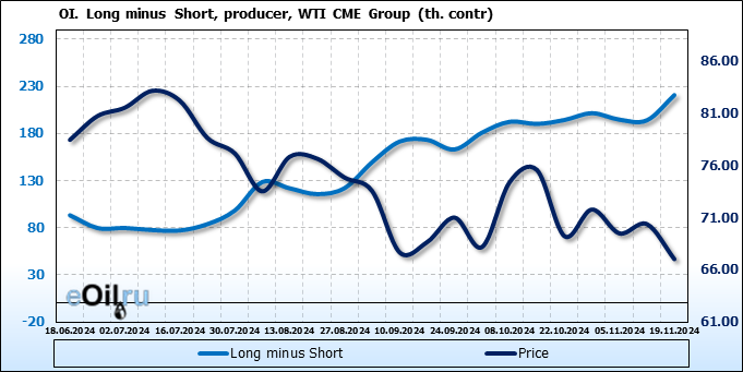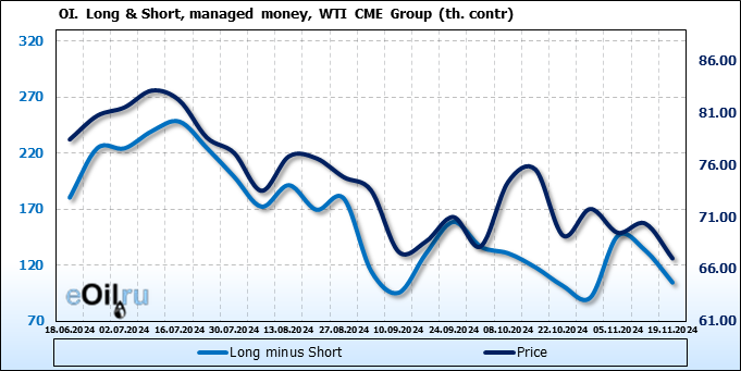 За прошлую неделю, 13.11.24 — 19.11.24, разница между длинными и короткими позициями управляющих сократилась на 28.7 тыс. контрактов. В тоже время, цена упала на 3.36 доллара.