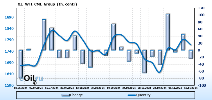 За прошлую неделю, 13.11.24 — 19.11.24, открытый интерес упал на 24 тыс. контрактов. Объем вовлеченных в торговлю контрактов составляет 1 768 651 штуку. Текущее положение дел на рынке таково, что деньги в течение прошлой недели уходили с рынка не видя привлекательности в текущей ситуации.