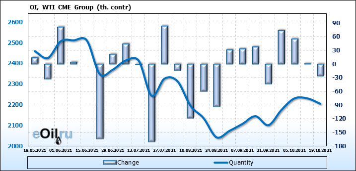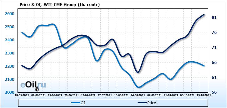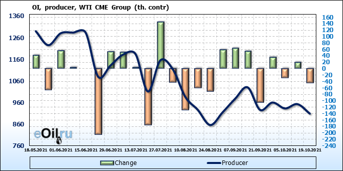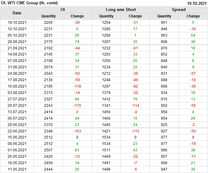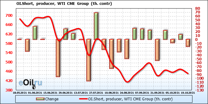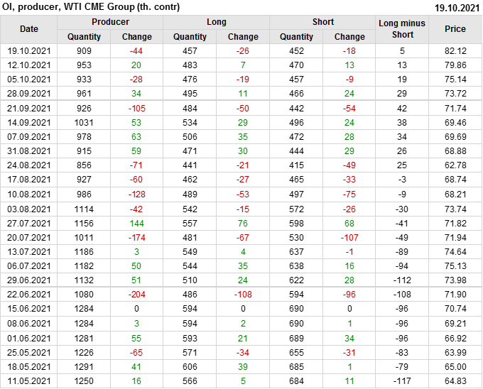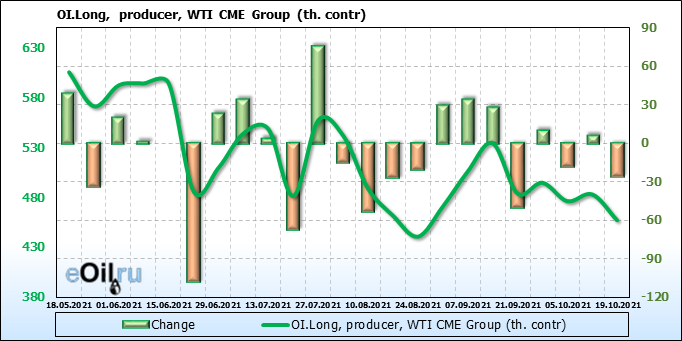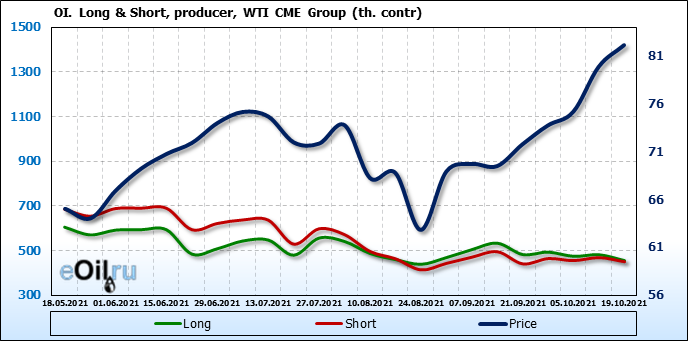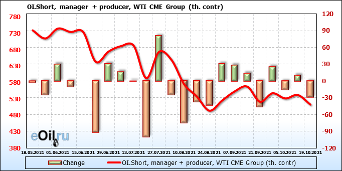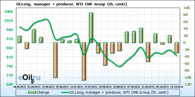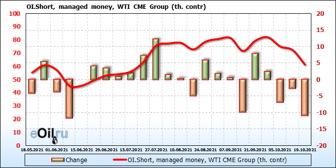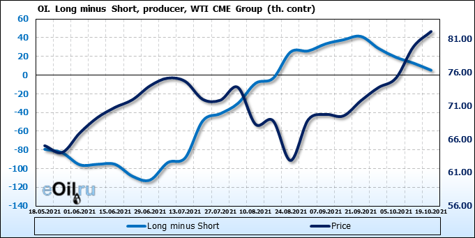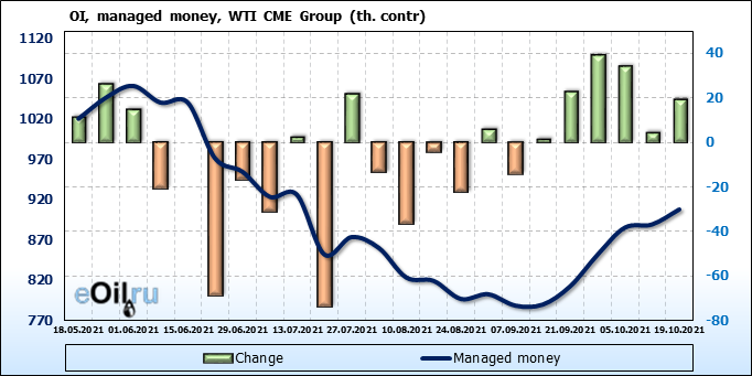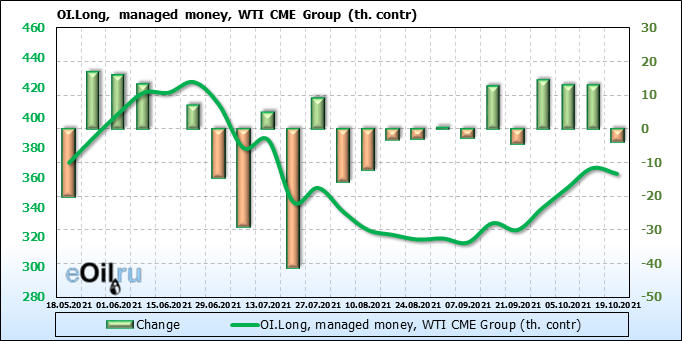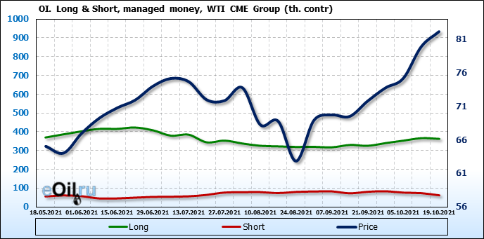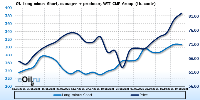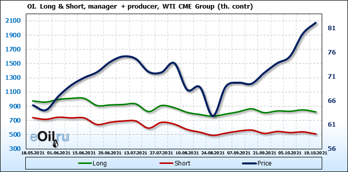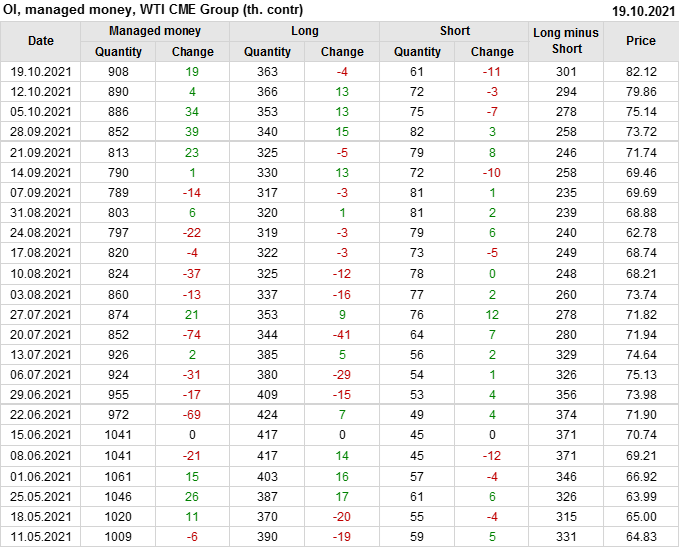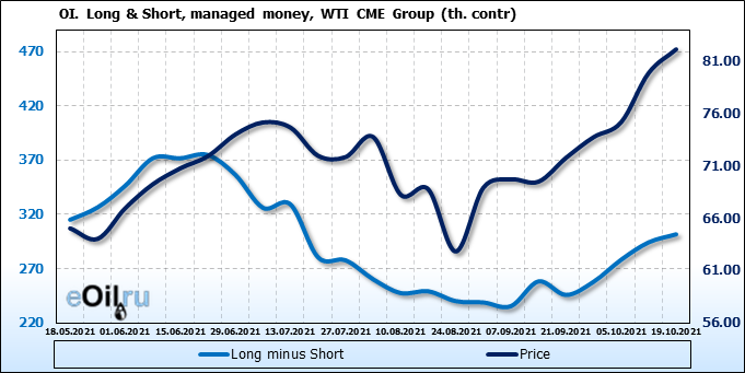 За прошлую неделю, 13.10.21 — 19.10.21, разница между длинными и короткими позициями управляющих увеличилась на 7.3 тыс. контрактов. В тоже время, цена выросла на 2.26 доллара.
