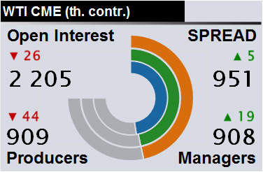За прошлую неделю разница между OI производителей и OI управляющих сократилась на 29 681 контракт. Разница между длинными позициями производителей и управляющих сократилась на 39 401 контракт. Разница между короткими позициями производителей и управляющих сократилась на 10 062 контракта.