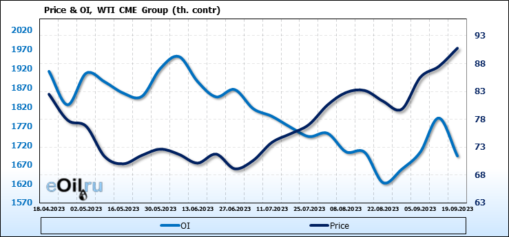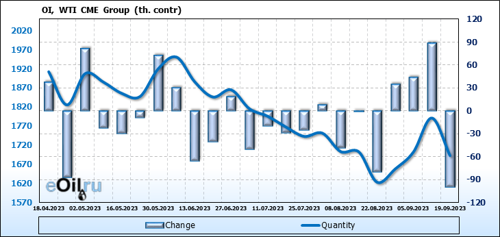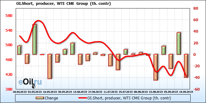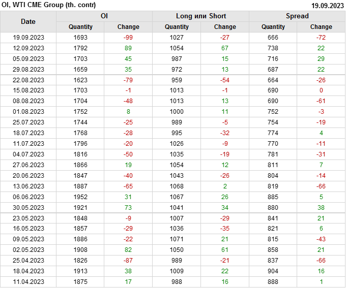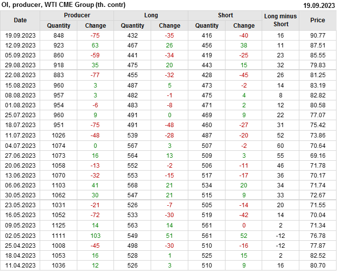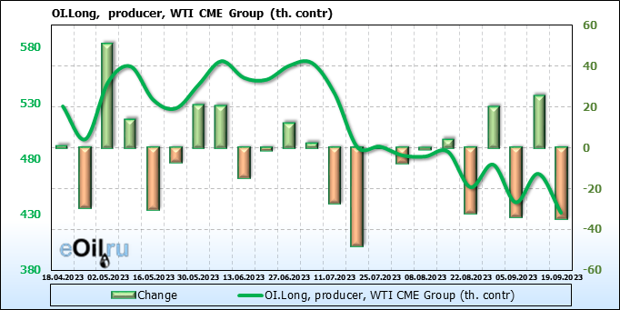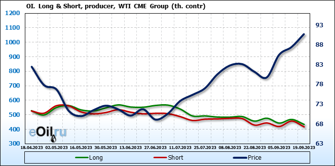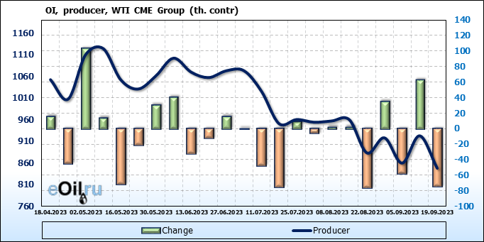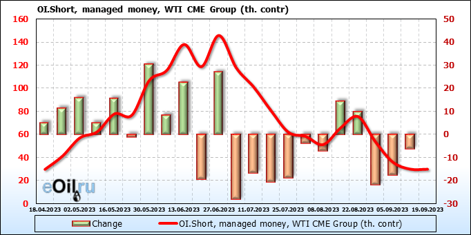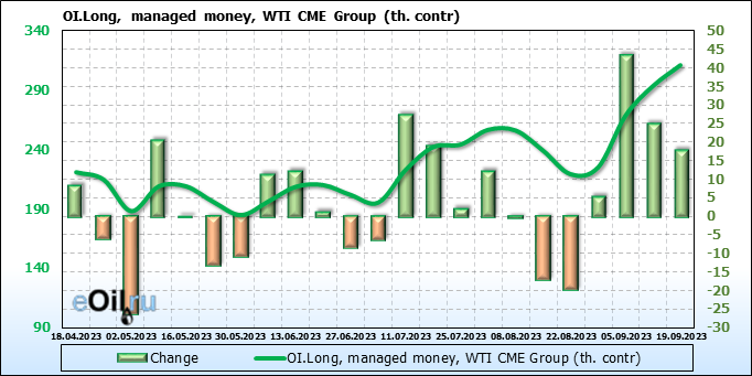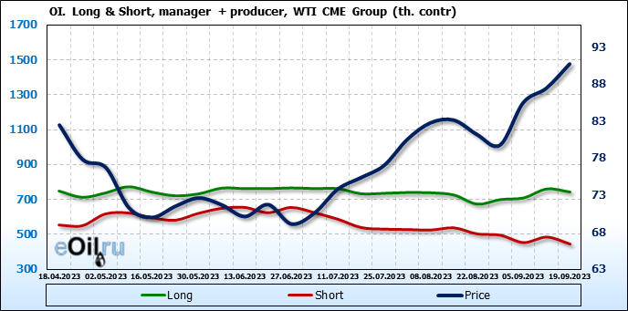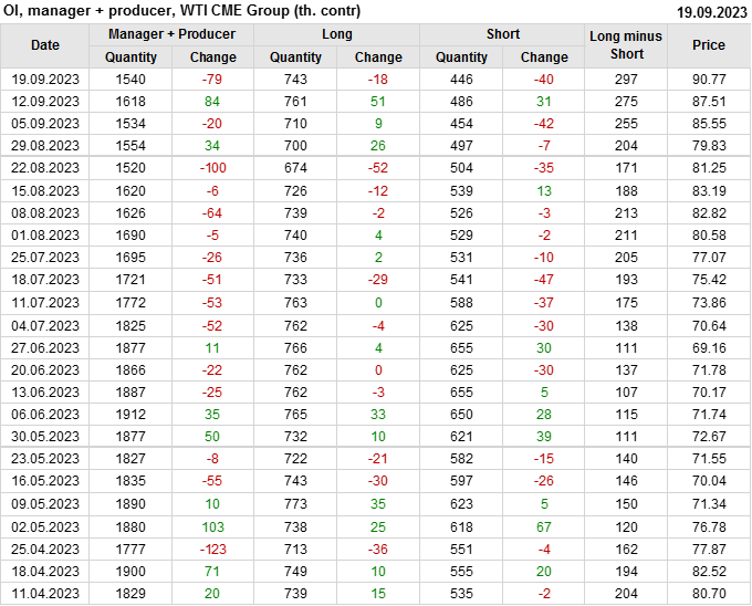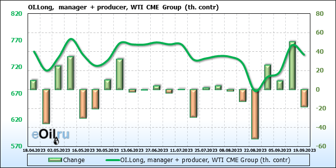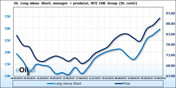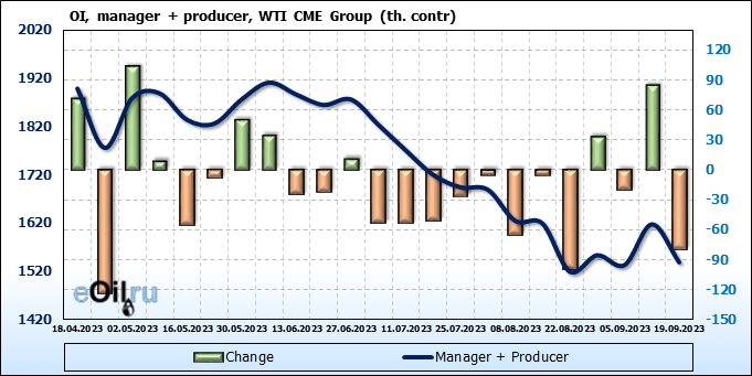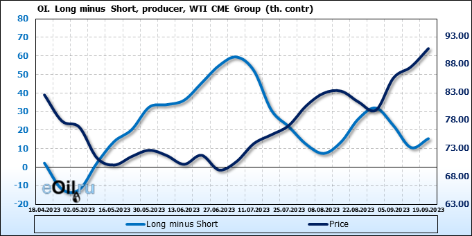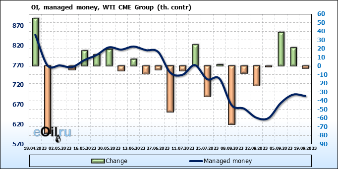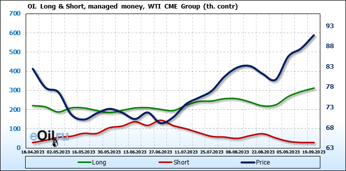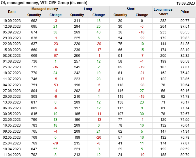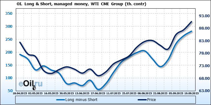 За прошлую неделю, 13.09.23 — 19.09.23, разница между длинными и короткими позициями управляющих увеличилась на 17.6 тыс. контрактов. В тоже время, цена выросла на 3.26 доллара.