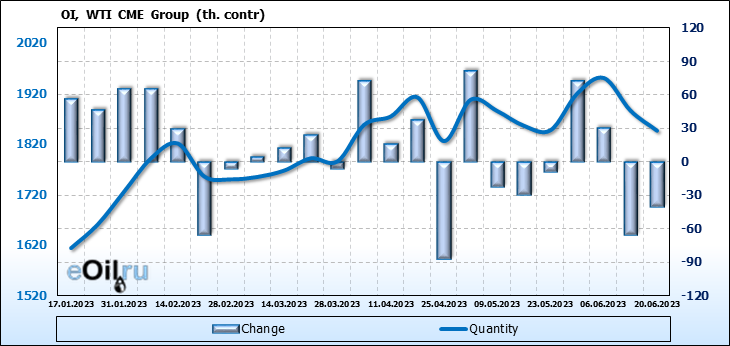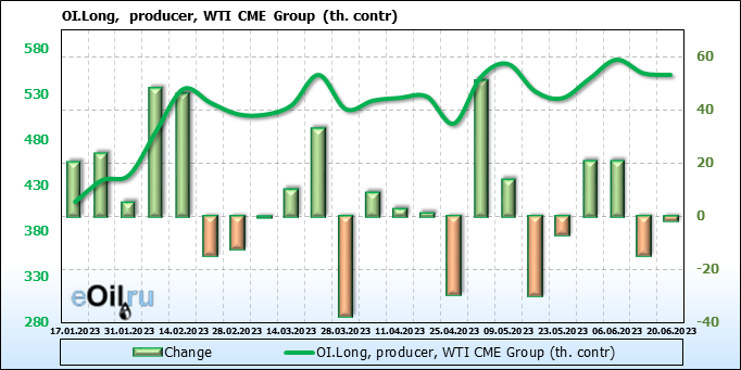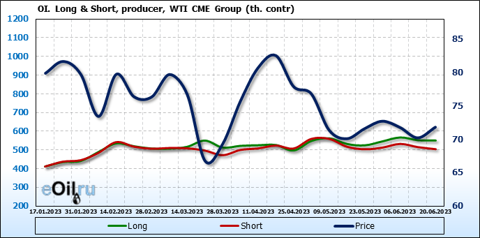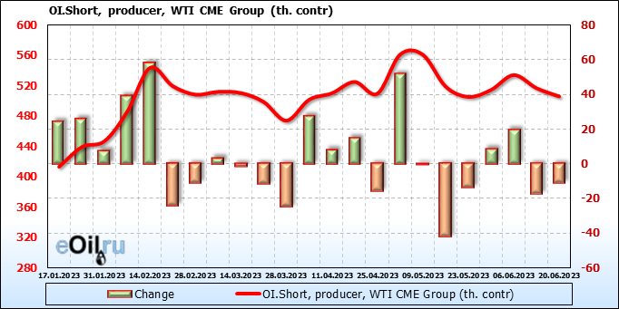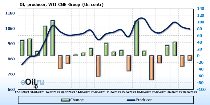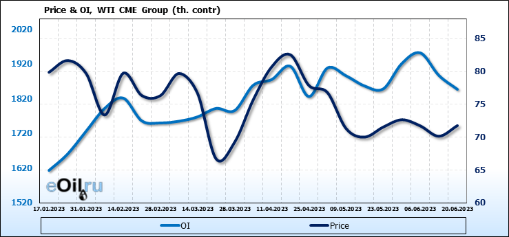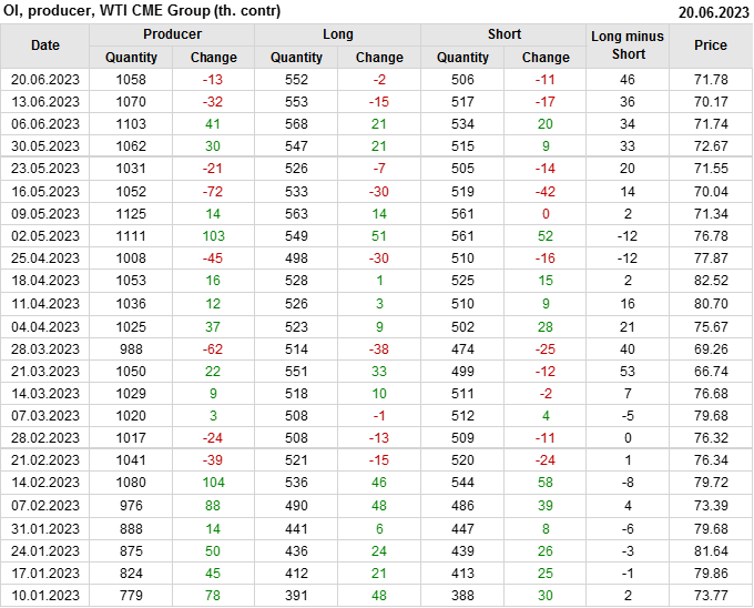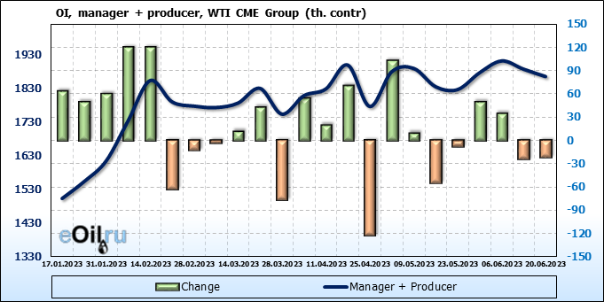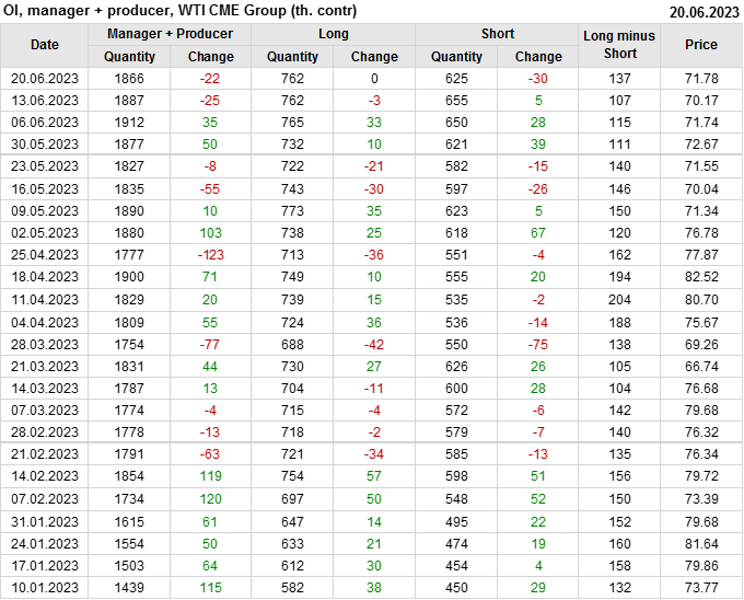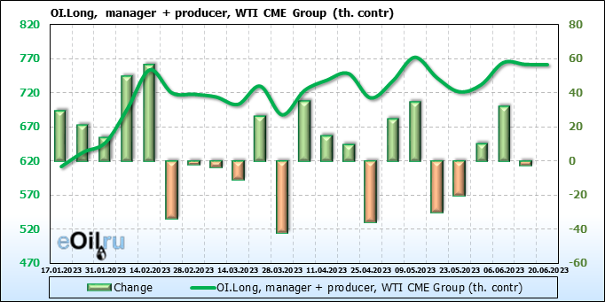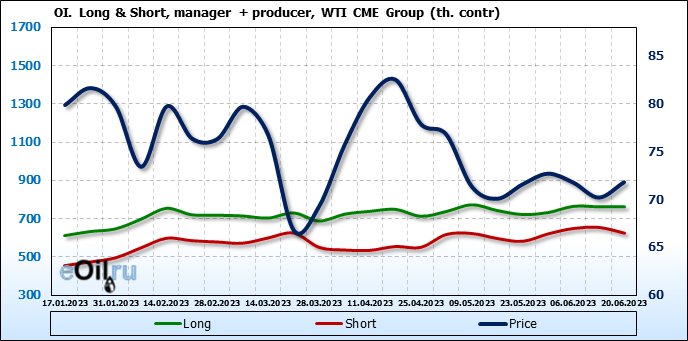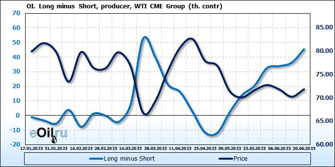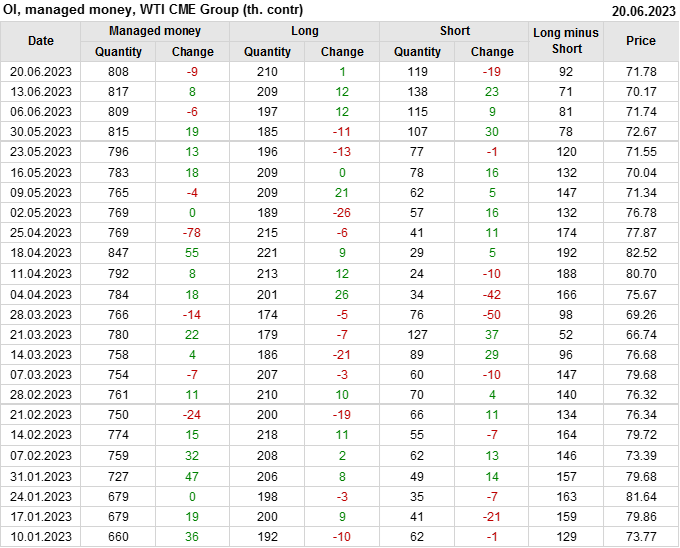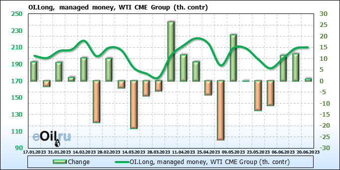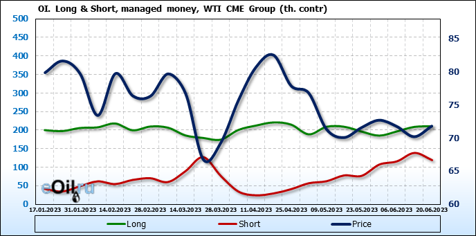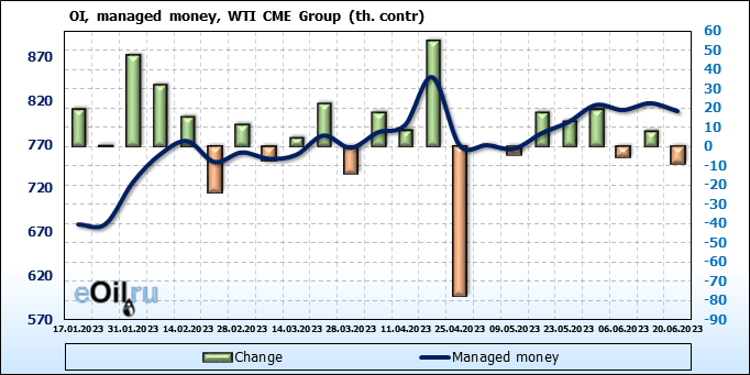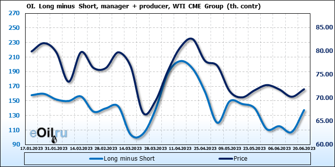 За прошлую неделю, 14.06.23 — 20.06.23, разница между длинными и короткими позициями управляющих увеличилась на 20.7 тыс. контрактов. В тоже время, цена выросла на 1.61 доллара.