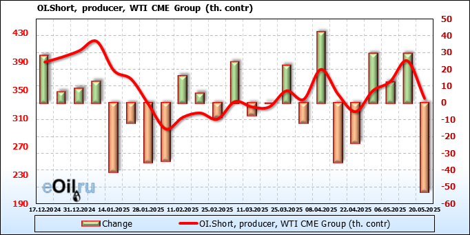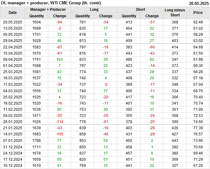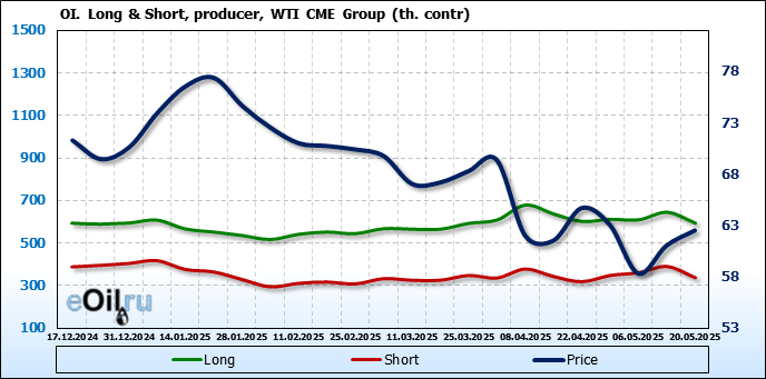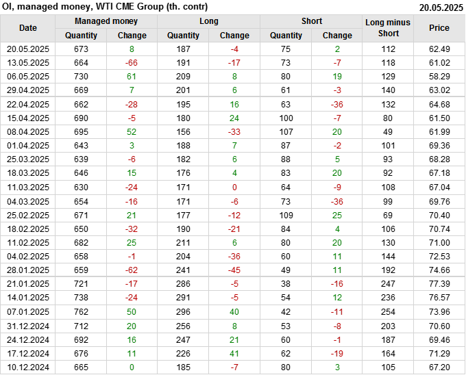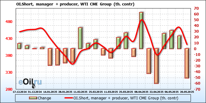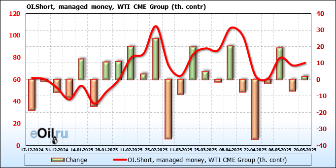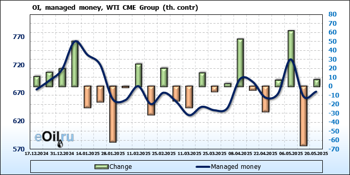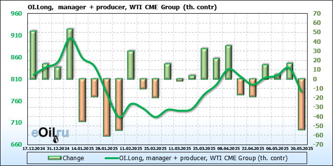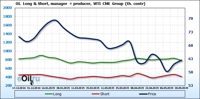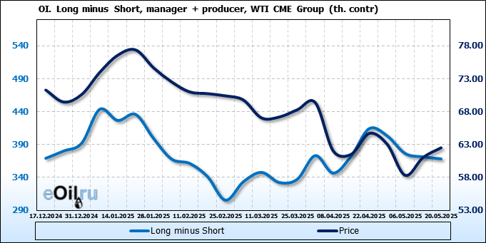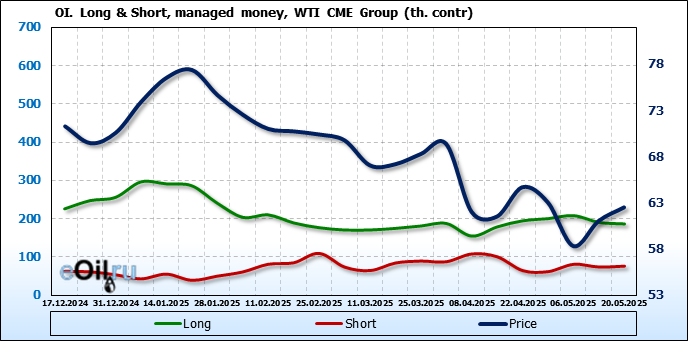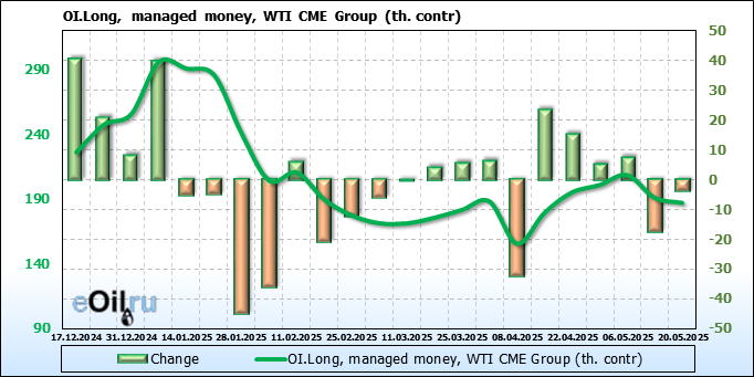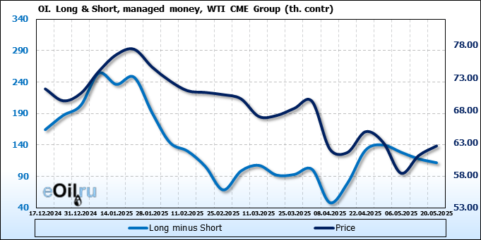 За прошлую неделю, 14.05.25 — 20.05.25, разница между длинными и короткими позициями управляющих сократилась на 6.2 тыс. контрактов. В тоже время, цена выросла на 1.47 доллара.