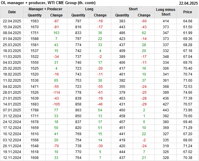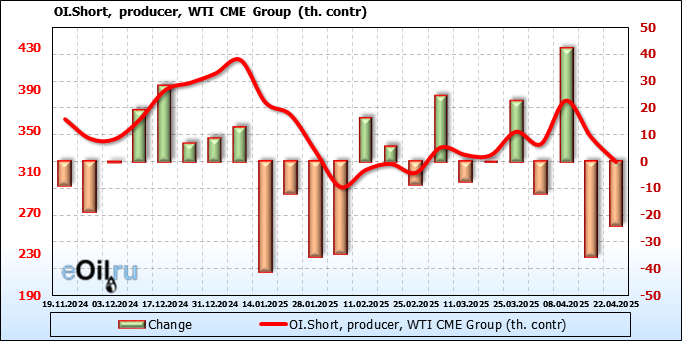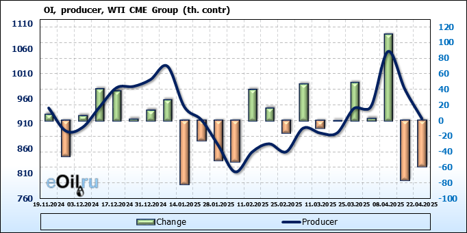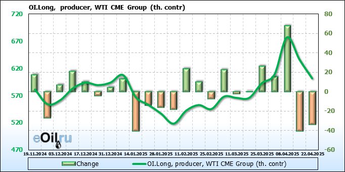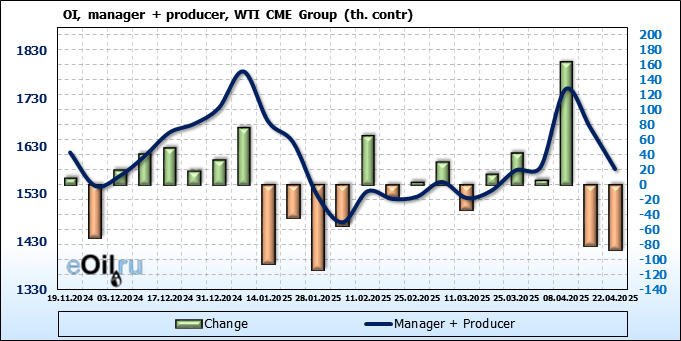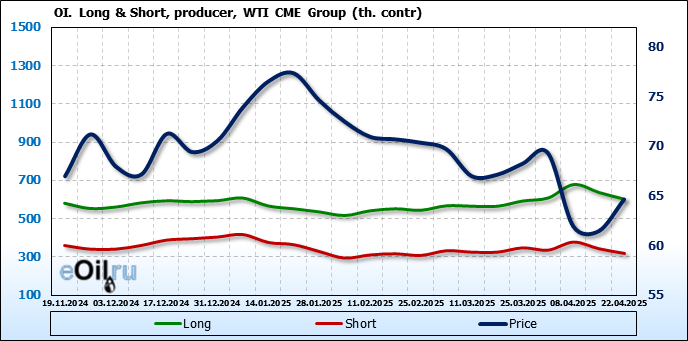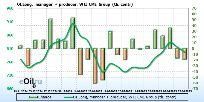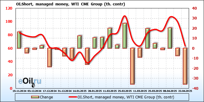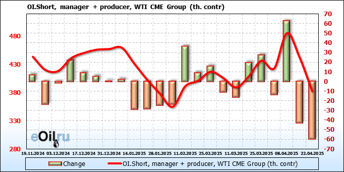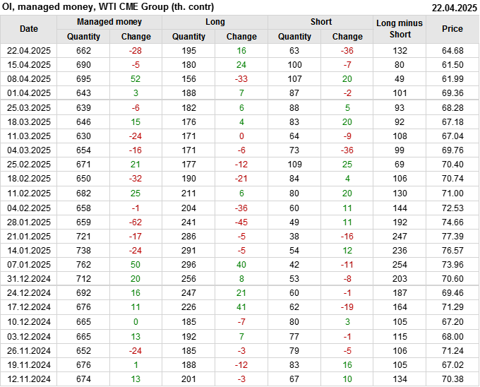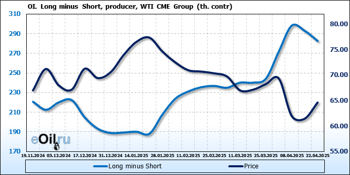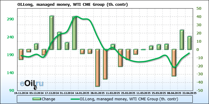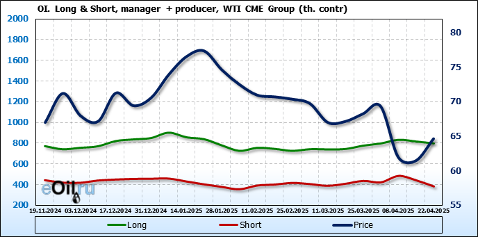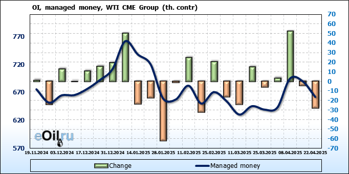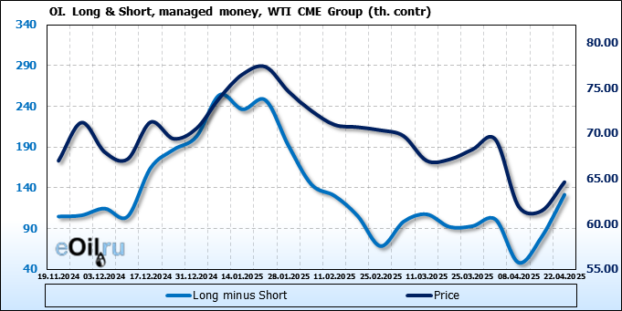 За прошлую неделю, 16.04.25 — 22.04.25, разница между длинными и короткими позициями управляющих увеличилась на 51.8 тыс. контрактов. В тоже время, цена выросла на 3.18 доллара.