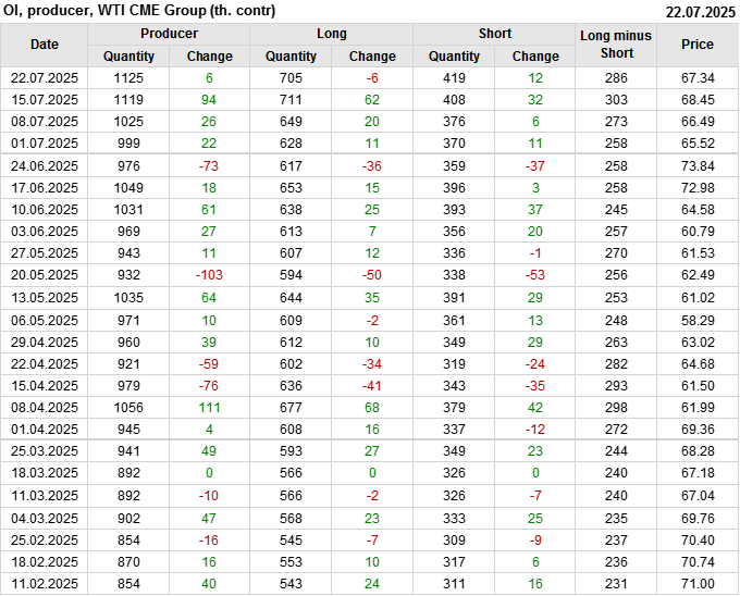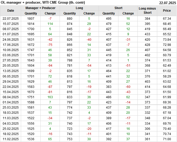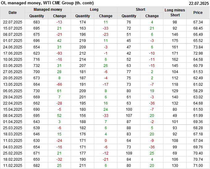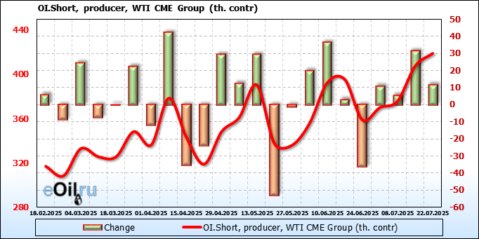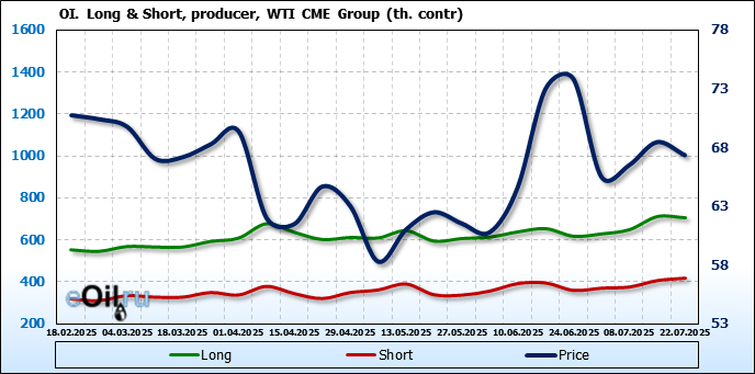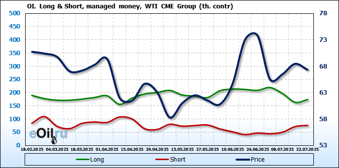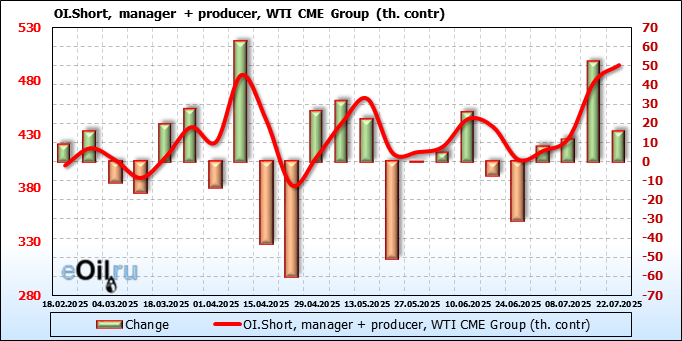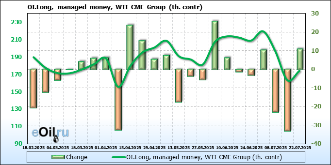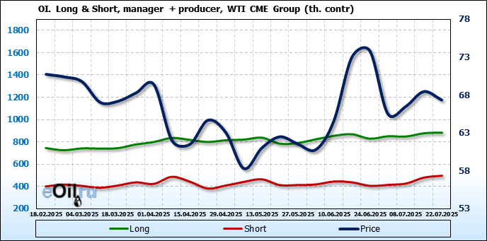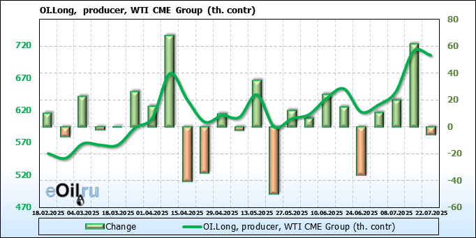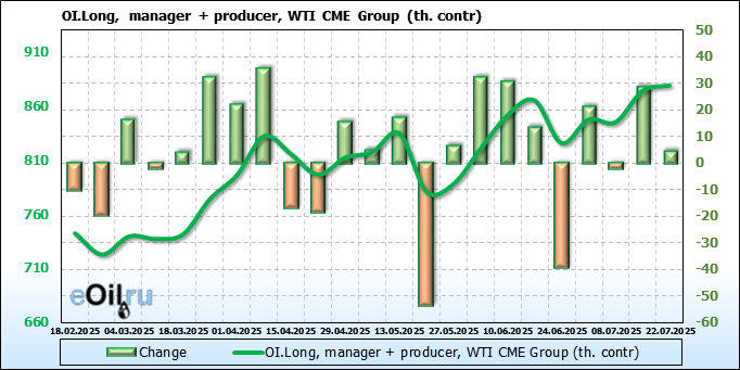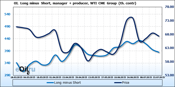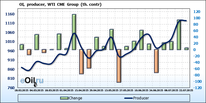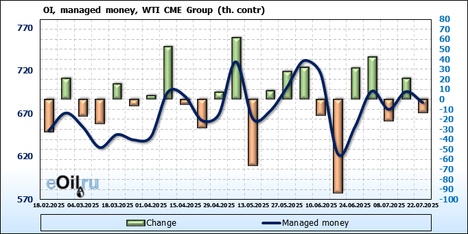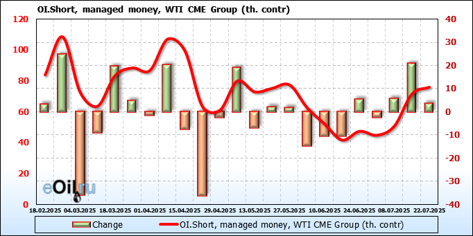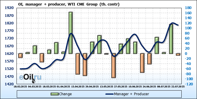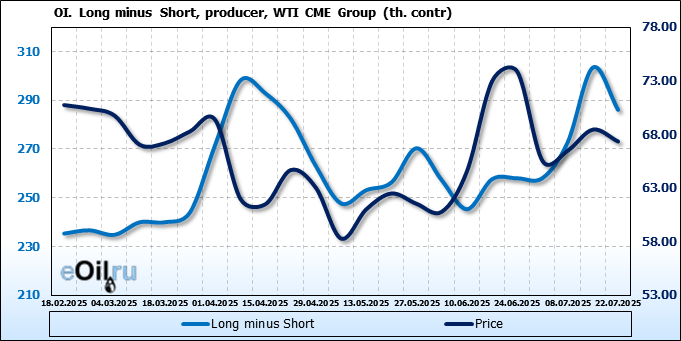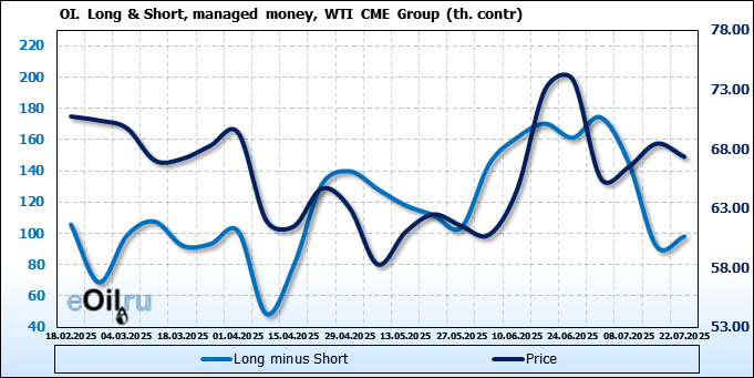 За прошлую неделю, 16.07.25 — 22.07.25, разница между длинными и короткими позициями управляющих увеличилась на 6.5 тыс. контрактов. В тоже время, цена упала на 1.11 доллара.
