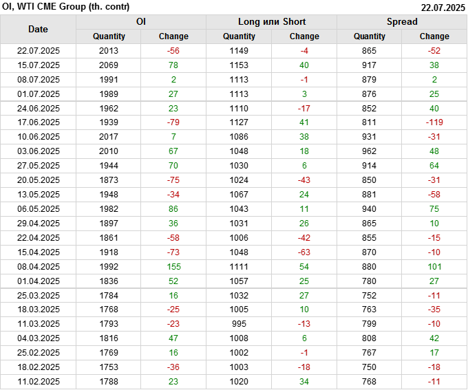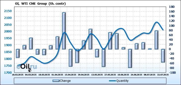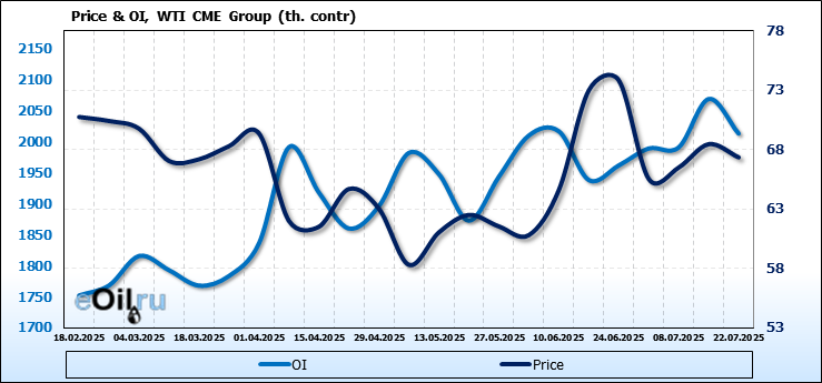 За прошлую неделю, 16.07.25 — 22.07.25, открытый интерес упал на 56 тыс. контрактов. Объем вовлеченных в торговлю контрактов составляет 2 013 304 штуки. Текущее положение дел на рынке таково, что деньги в течение прошлой недели уходили с рынка не видя привлекательности в текущей ситуации.