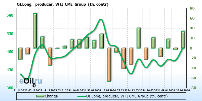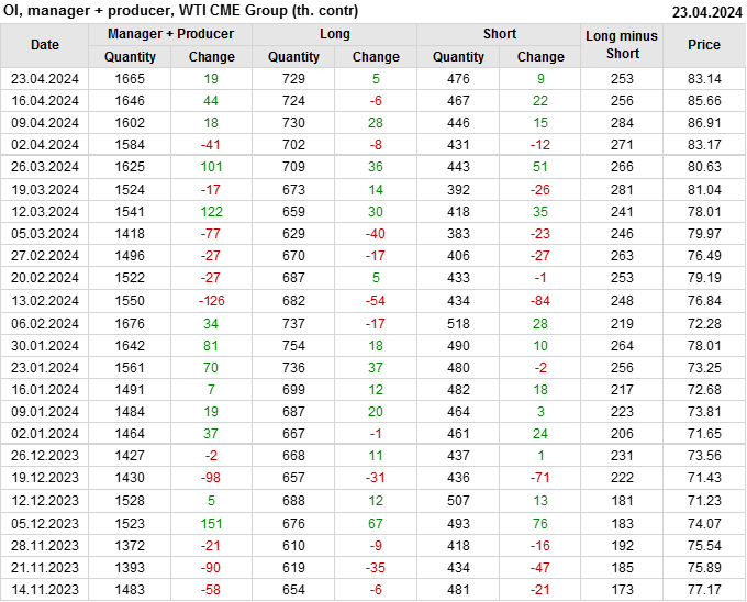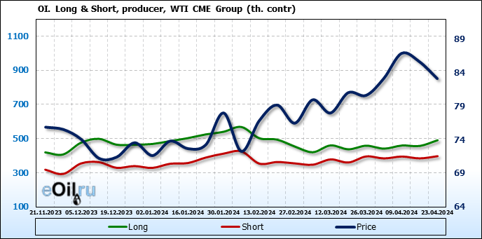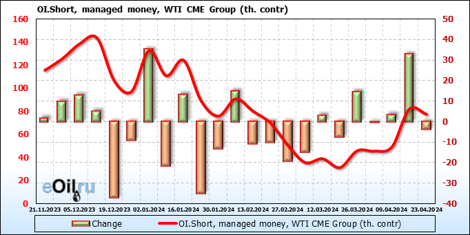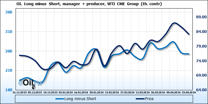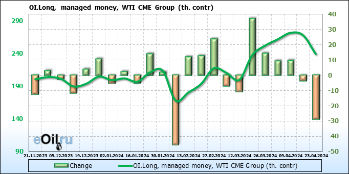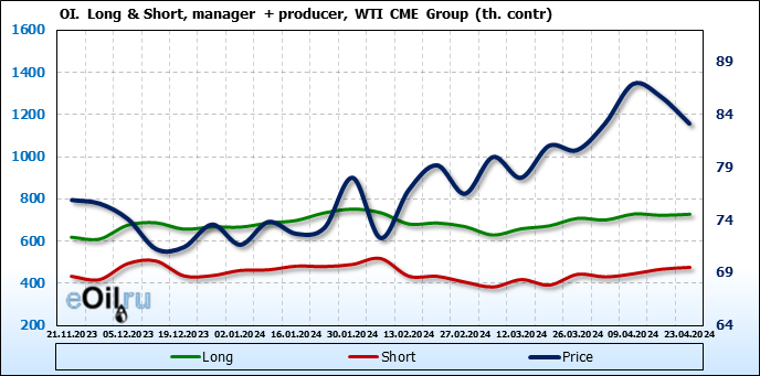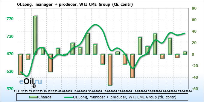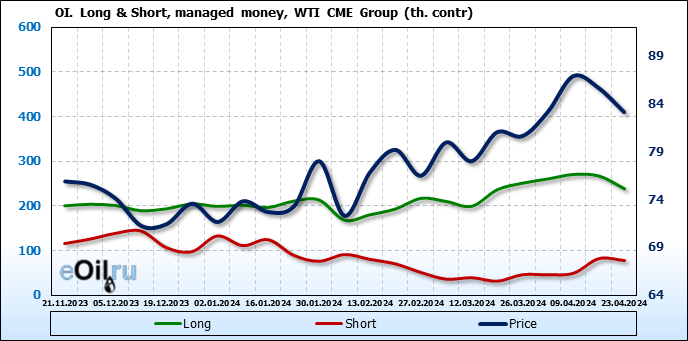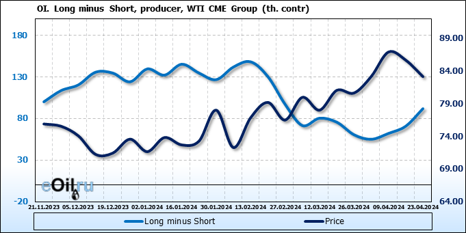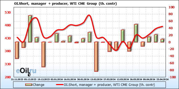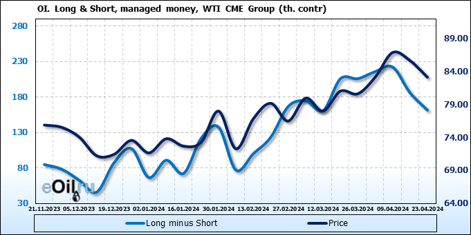 За прошлую неделю, 17.04.24 — 23.04.24, разница между длинными и короткими позициями управляющих сократилась на 24.4 тыс. контрактов. В тоже время, цена упала на 2.52 доллара.