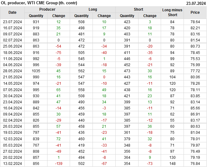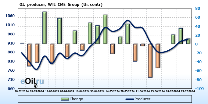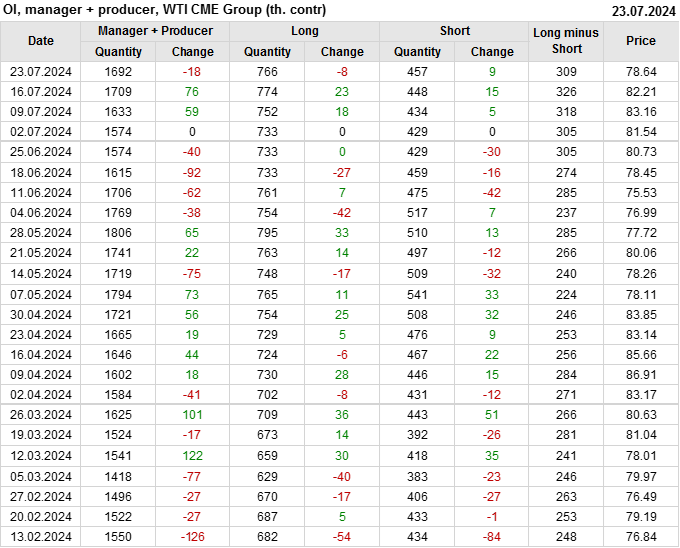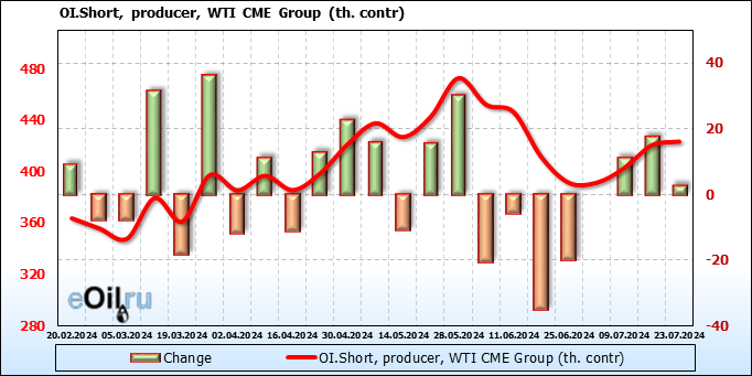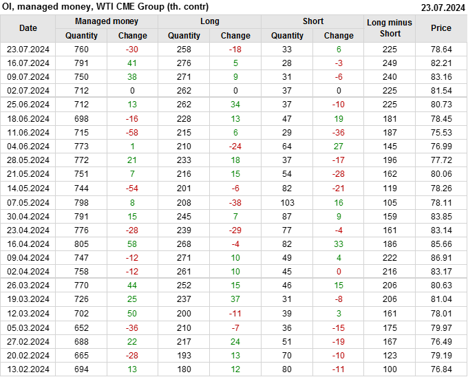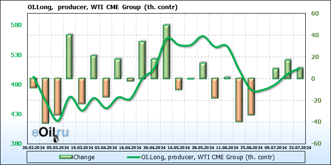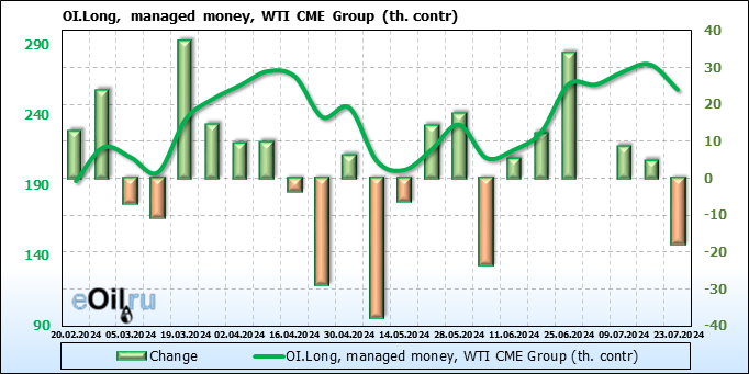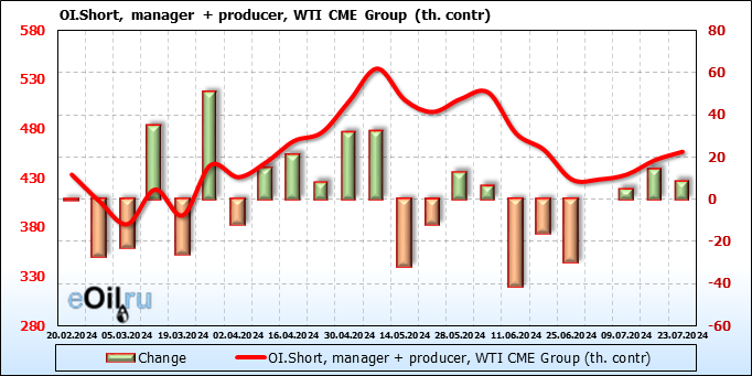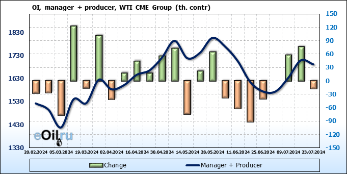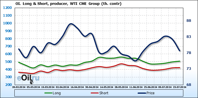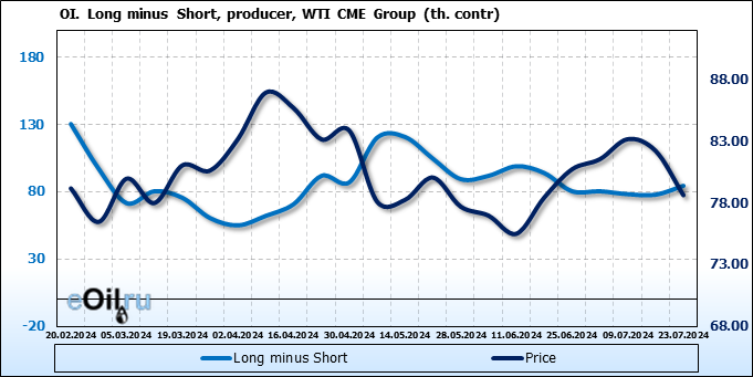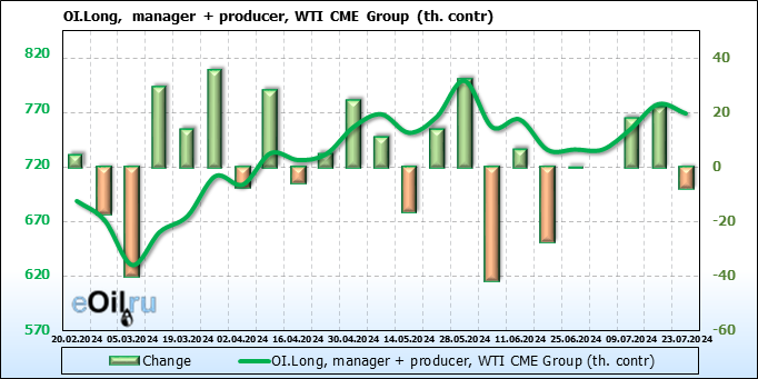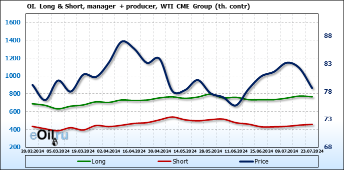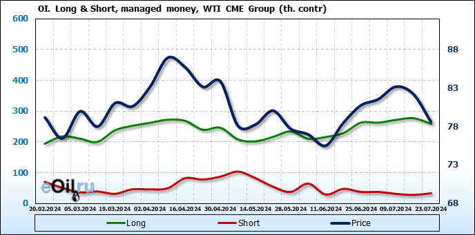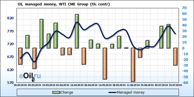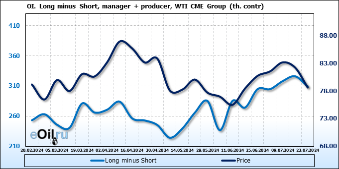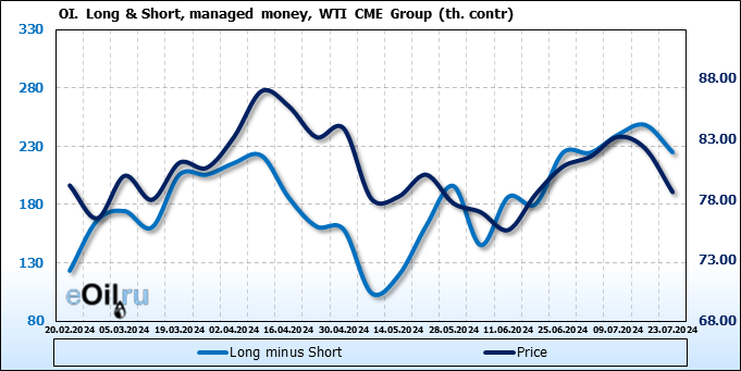 За прошлую неделю, 17.07.24 — 23.07.24, разница между длинными и короткими позициями управляющих сократилась на 23.5 тыс. контрактов. В тоже время, цена упала на 3.57 доллара.