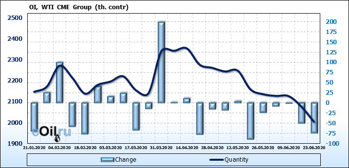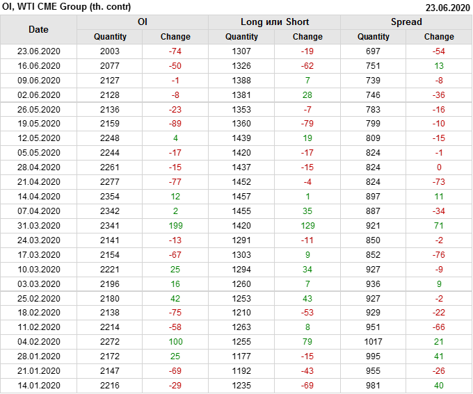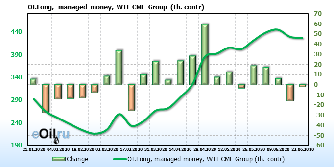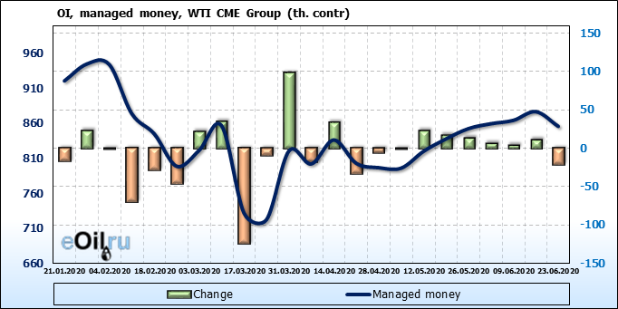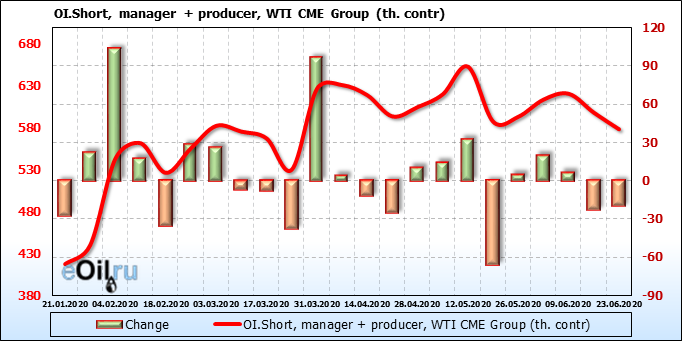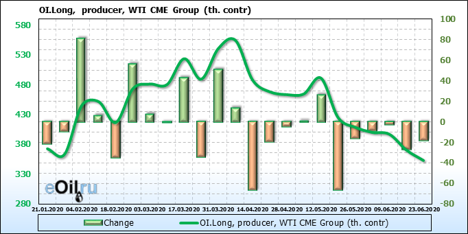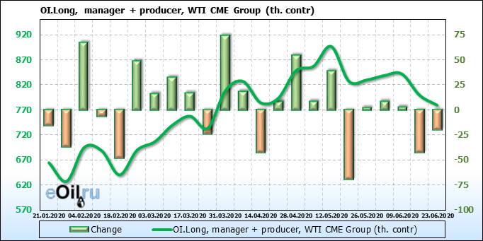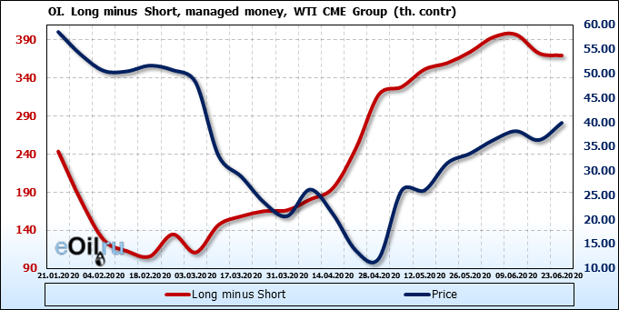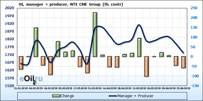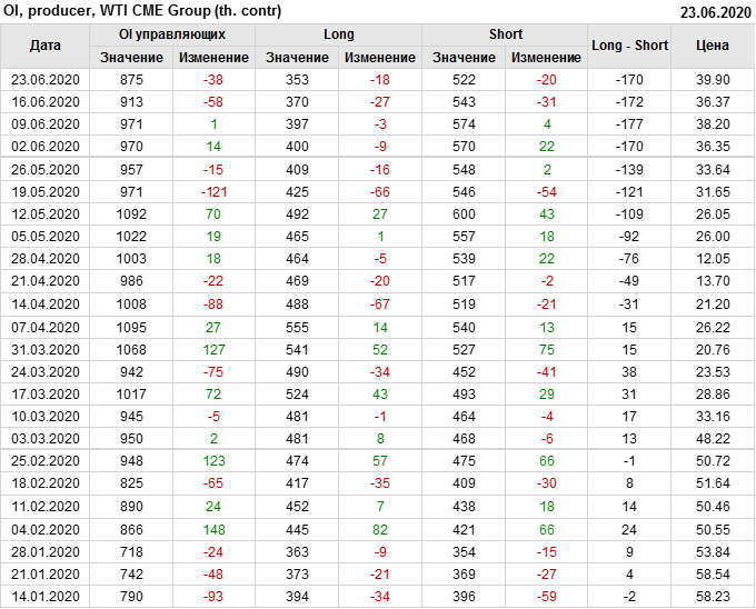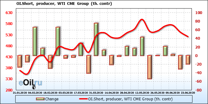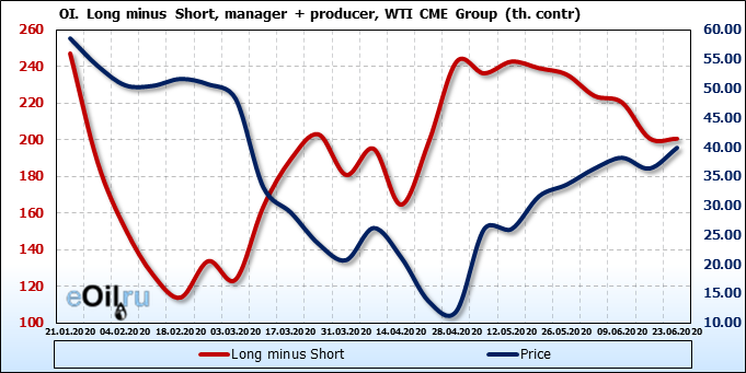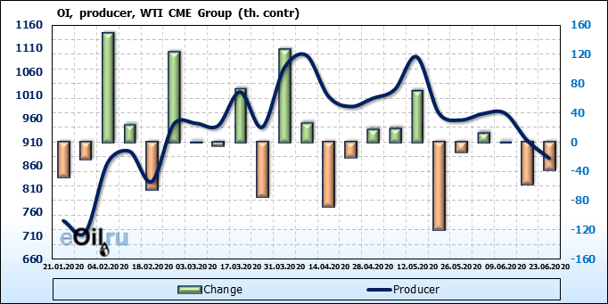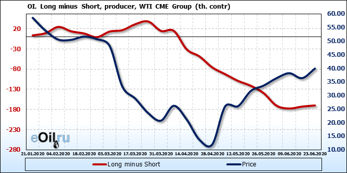 За прошлую неделю, 17.06.20 — 23.06.20, разница между длинными и короткими позициями производителей выросла на 3 тыс. контрактов. В тоже время, цена выросла на 3.53 доллара. Производители не торопятся наращивать продажи, предполагая, что возможен рост цены в ближайшее время.