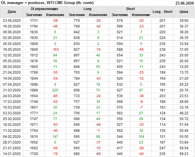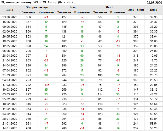 За прошлую неделю, 17.06.20 — 23.06.20, разница между длинными и короткими позициями производителей и управляющих упала на 0.2 тыс. контрактов. За отчетный период времени, цена выросла на 3.53 доллара. Разница совокупного объема длинных и коротких позиций производителей и управляющих на прошедшей неделе снизилась, в то время как цены выросли. Рынок теряет доверие покупателей, что, при продолжении данной динамики, приведет к стабилизации или падению цен в ближайшее время.