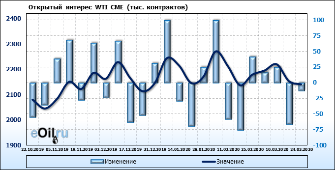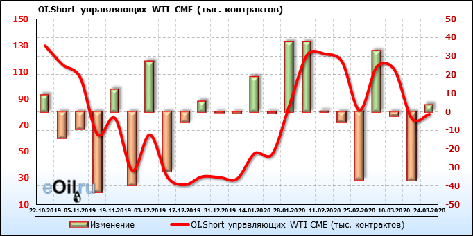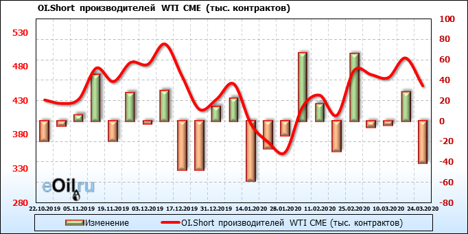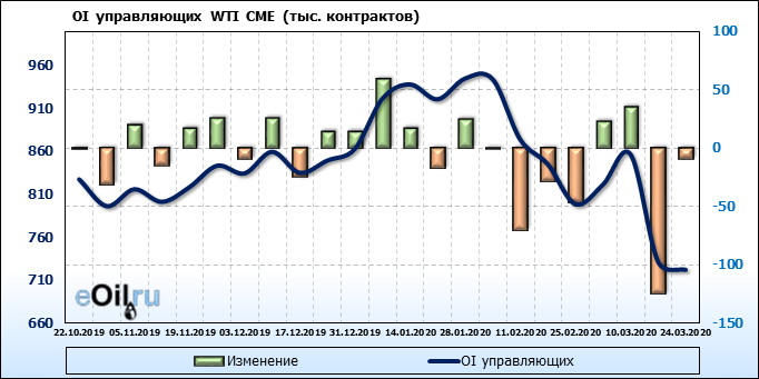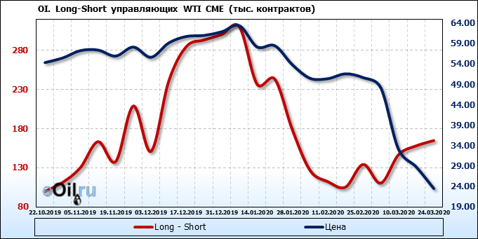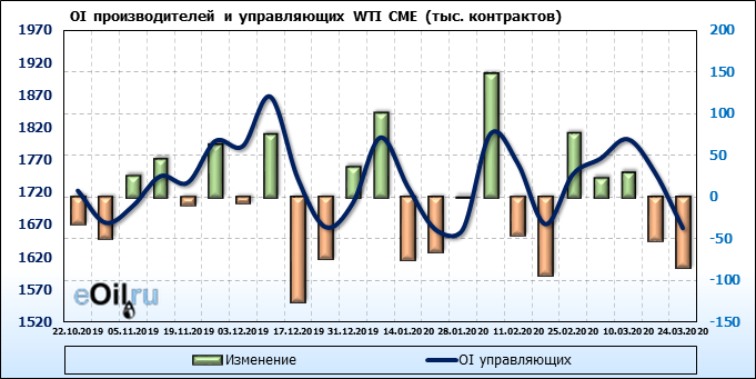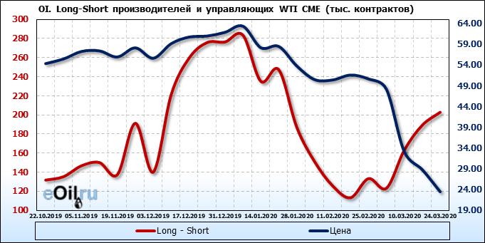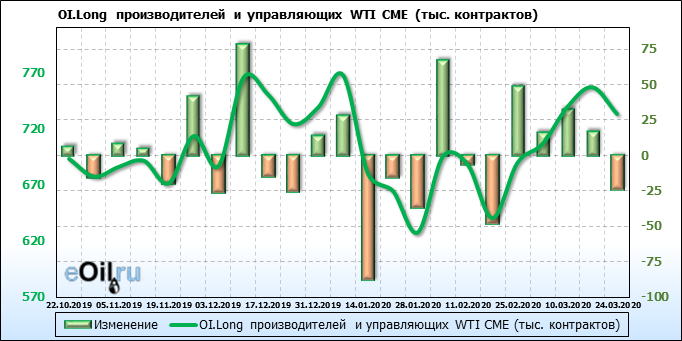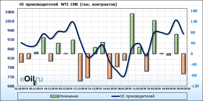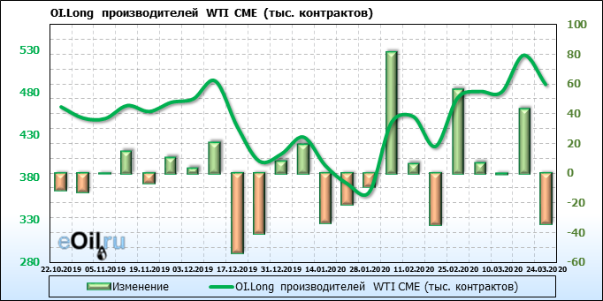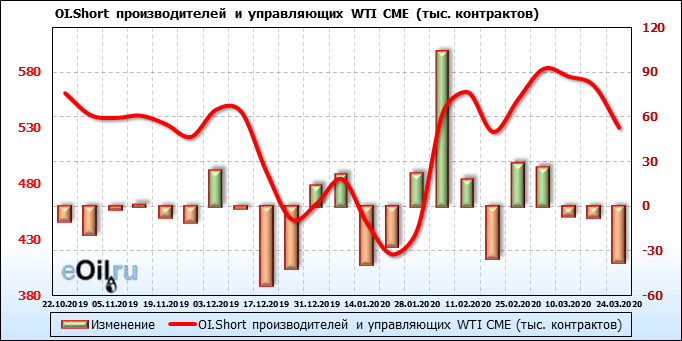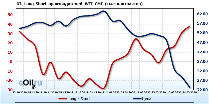 За прошлую неделю, 18.03.20 — 24.03.20, разница между длинными и короткими позициями производителей выросла на 7 тыс. контрактов. В тоже время, цена упала на 5.33 доллара. Производители перестали наращивать короткие позиции, что говорит или о непривлекательности текущих ценовых уровней для хеджирования, или о том, что часть участников рынка заняла выжидательную позицию.