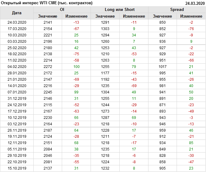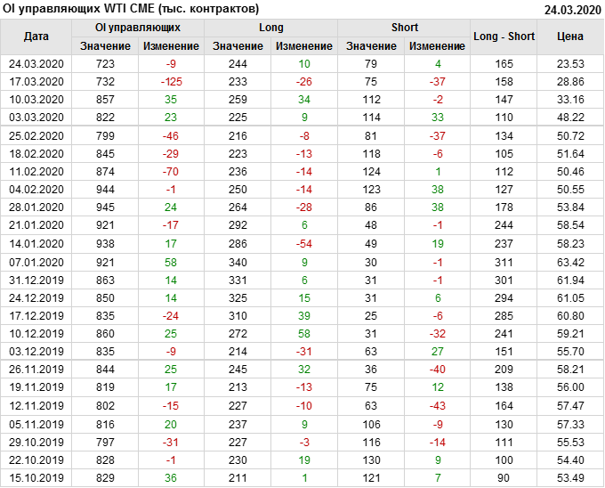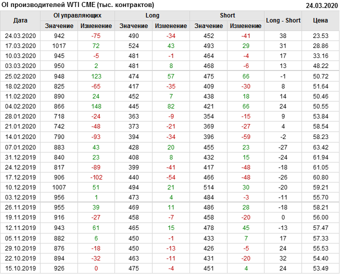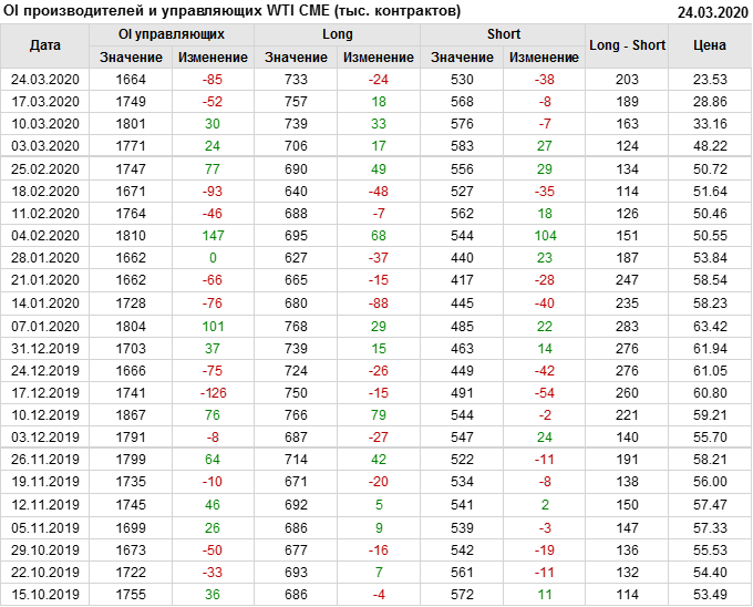 За прошлую неделю, 18.03.20 — 24.03.20, разница между длинными и короткими позициями производителей и управляющих выросла на 14 тыс. контрактов. За отчетный период времени, цена упала на 5.33 доллара. Производители и управляющие в своей совокупности смотрели вверх, не смотря на то что цена продолжала снижаться. Подобный дисбаланс должен привести к стабилизации и развороту цен вверх в скором времени.
