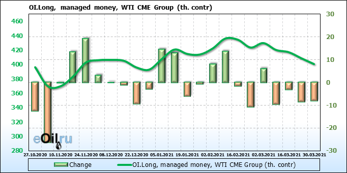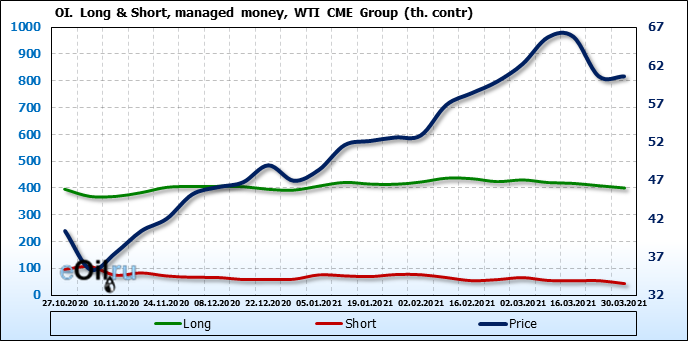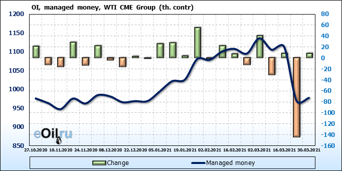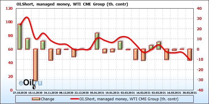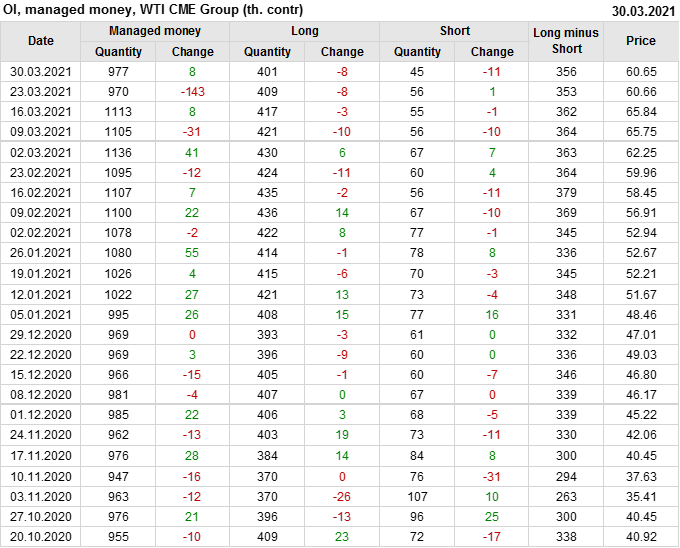 За прошлую неделю, 24.03.21 — 30.03.21, разница между длинными и короткими позициями управляющих выросла на 3 тыс. контрактов. В тоже время, цена упала на 0.01 доллара. Управляющие наращивают длинные позиции, что отражает их видение возможностей роста цены в ближайшее время, и это несмотря на то, что цены на отчетной неделе падали. Если давление со стороны покупателей будет продолжено, рынок развернется вверх.