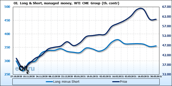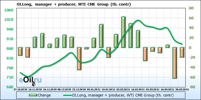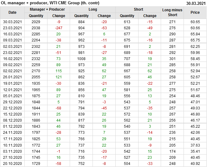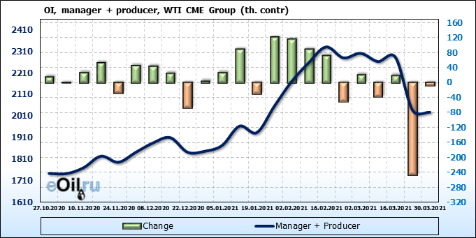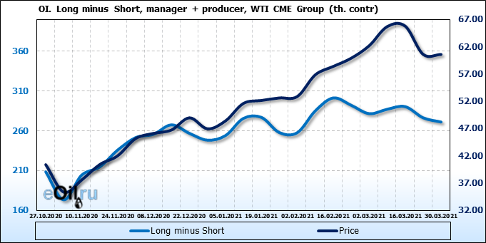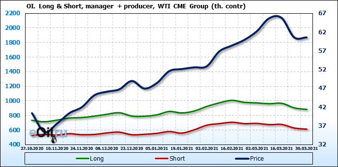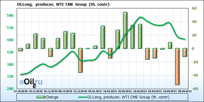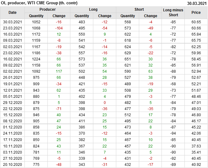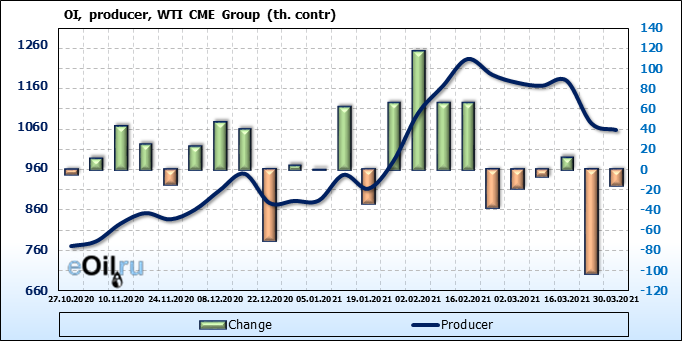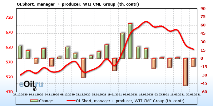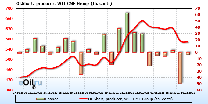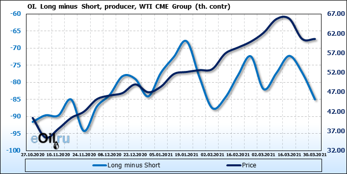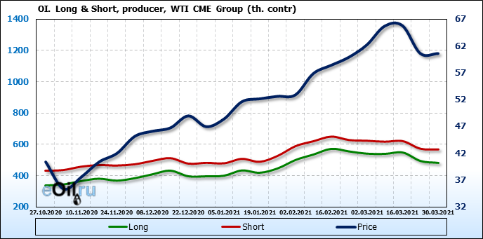 За прошлую неделю, 24.03.21 — 30.03.21, разница между длинными и короткими позициями производителей упала на 8 тыс. контрактов. В тоже время, цена упала на 0.01 доллара. Производители наращивают короткие позиции, что не дает цене расти. В такой ситуации на рынке возможно ускорение падения цен.